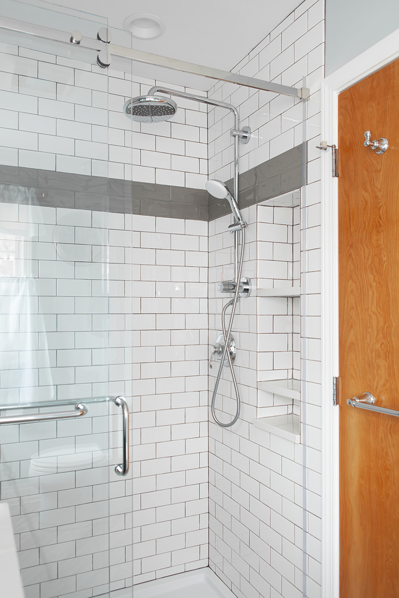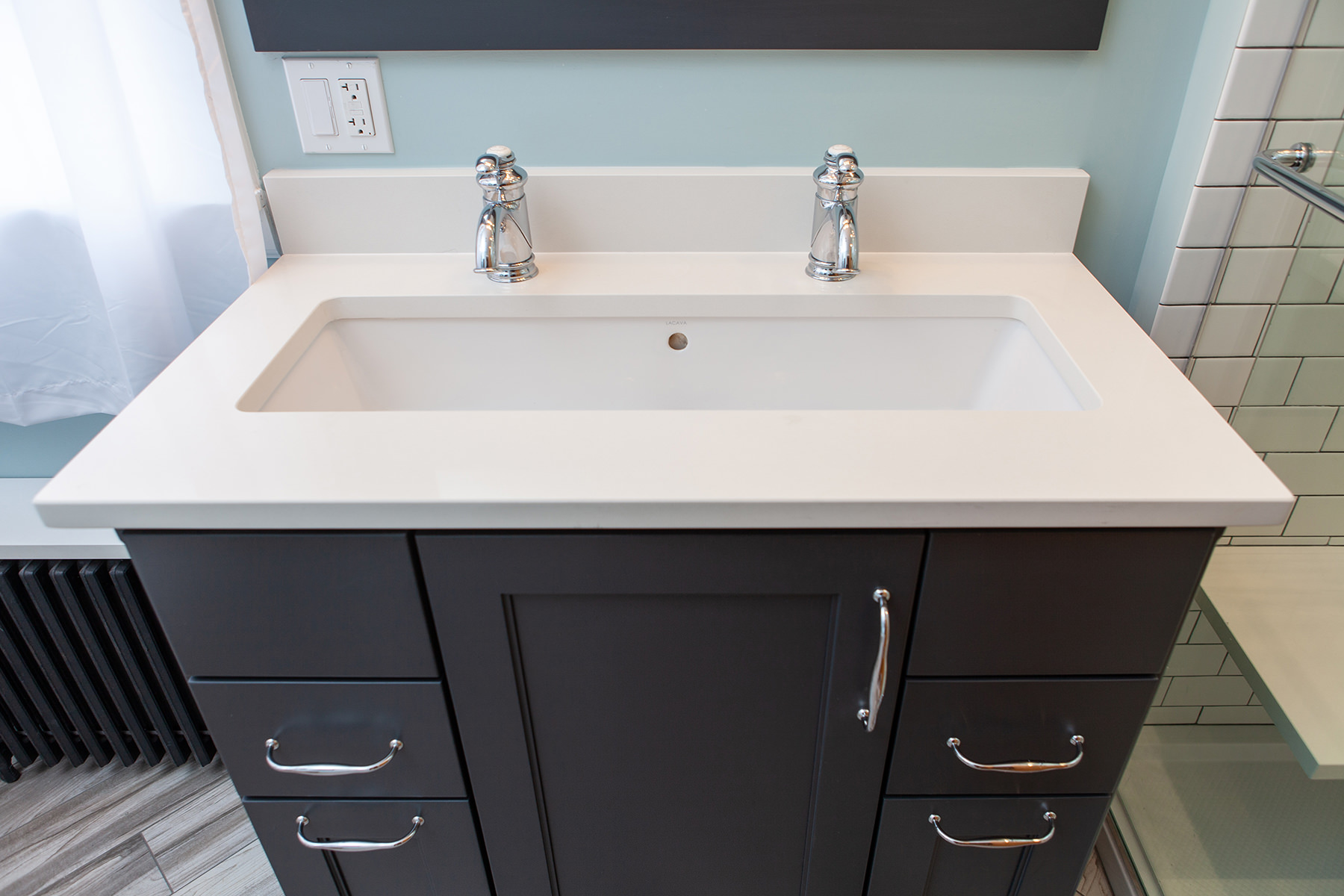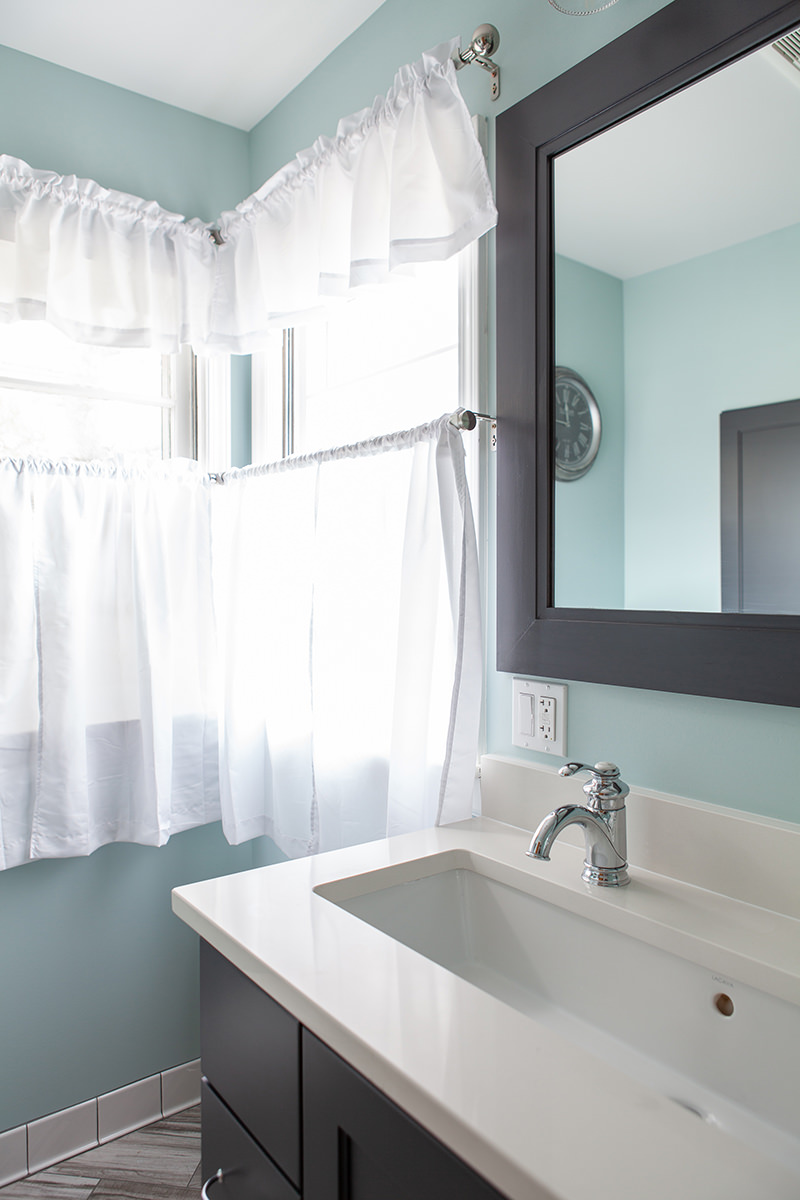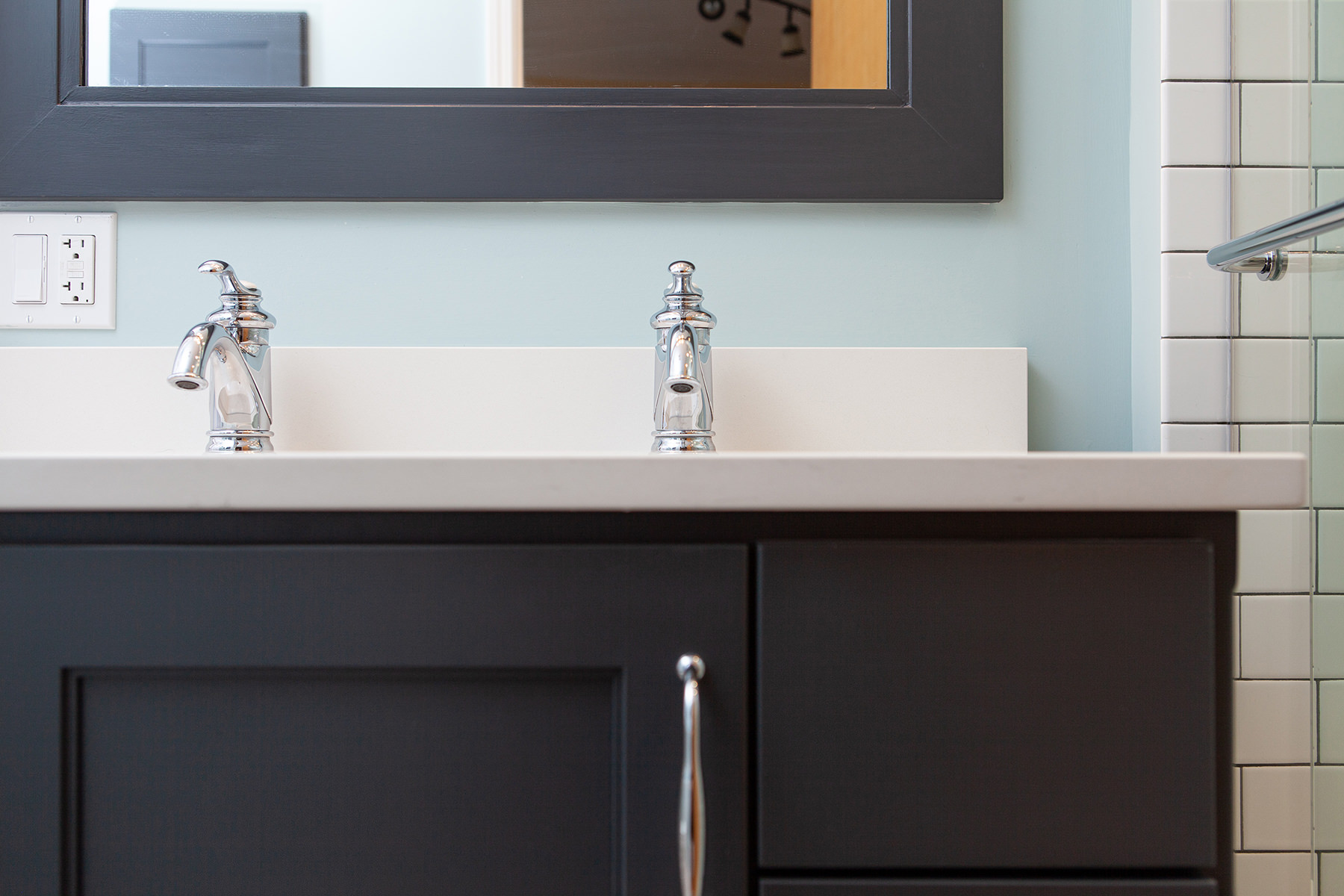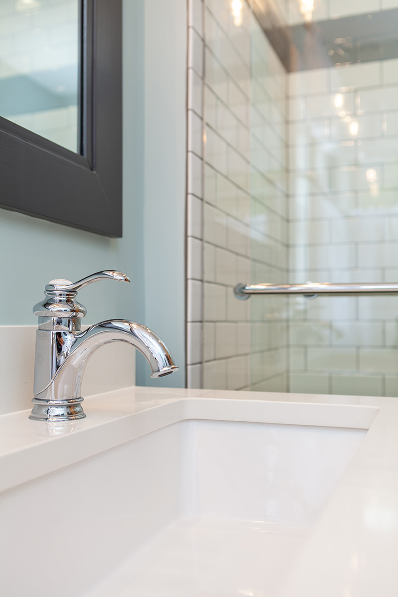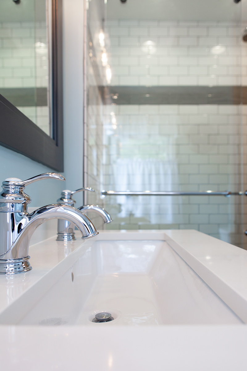 Just because space may me small doesn't mean our Highland Park homeowners need to lose functionality and design. Not every bathroom has space for two vanities, but this oversized sink with 2 faucets is a creative solution when space is limited. Traditional chrome finishes and classic dark cabinets give this bathroom update a timeless finish. We kept lines clean and added bright tile to help make this small space feel open. When it comes to floor design our BDS team kept it light and classic but with a change of direction gave the illusion of more space and added a intriguing design element.