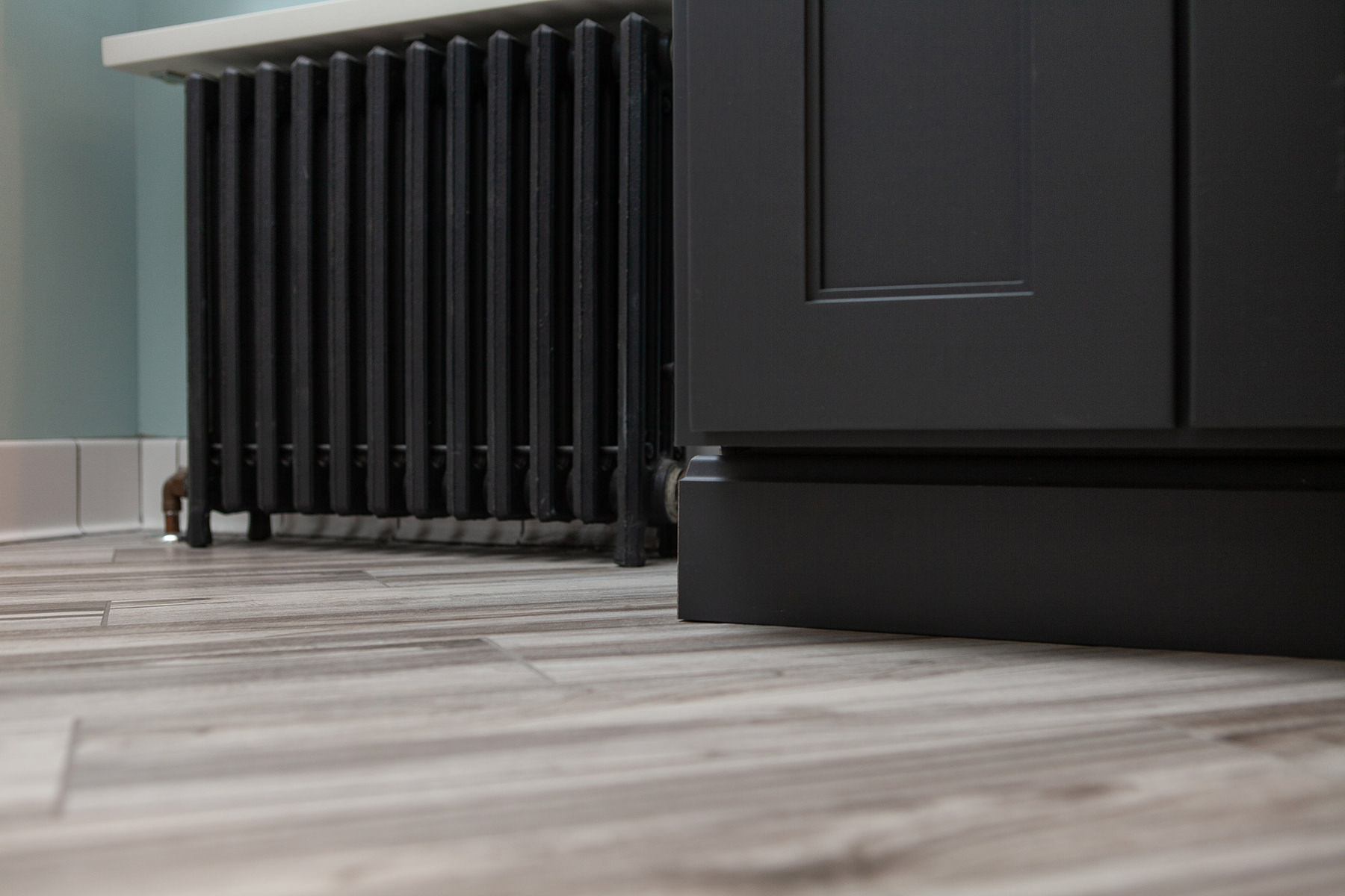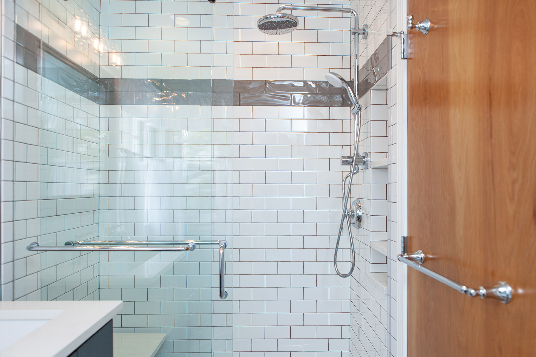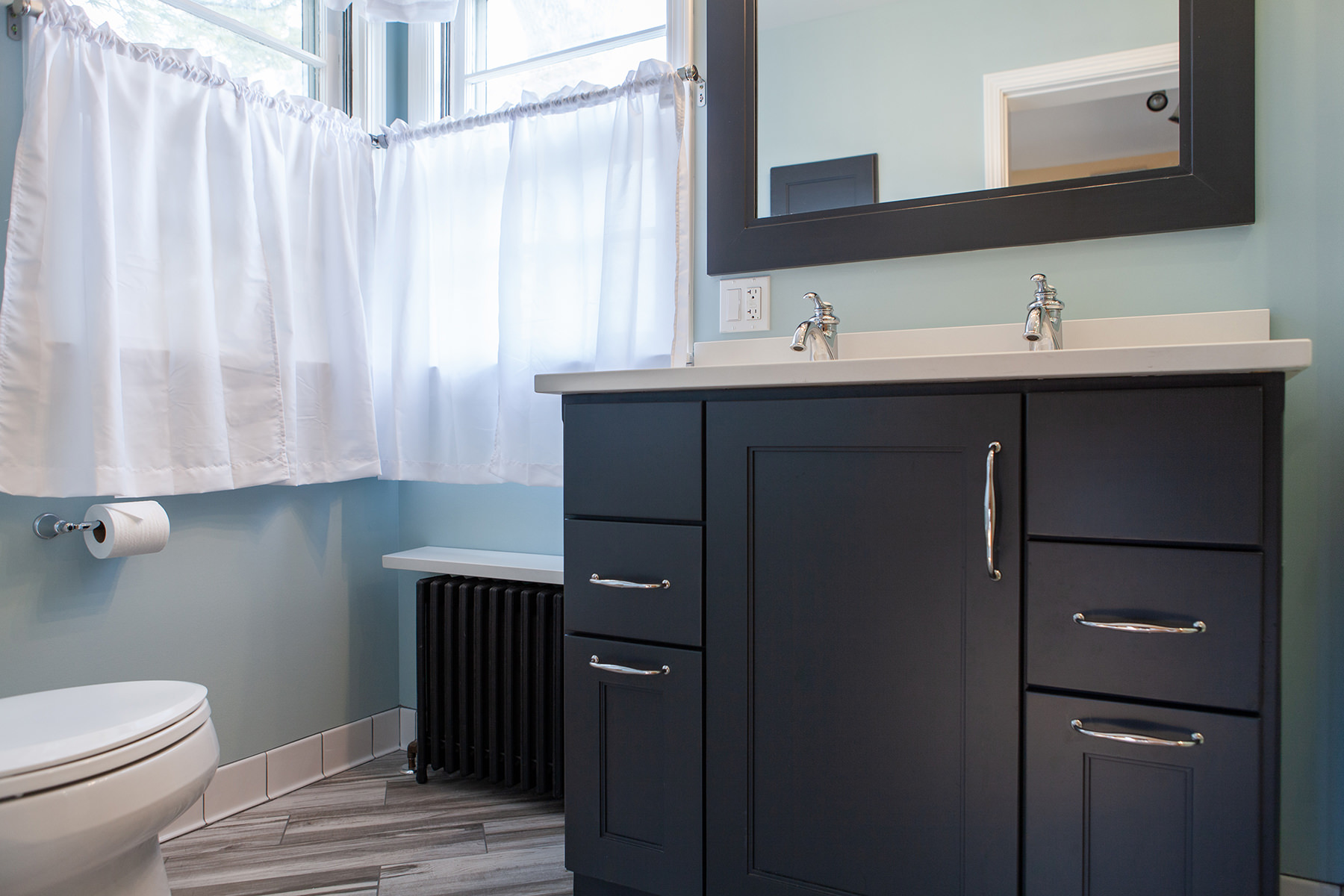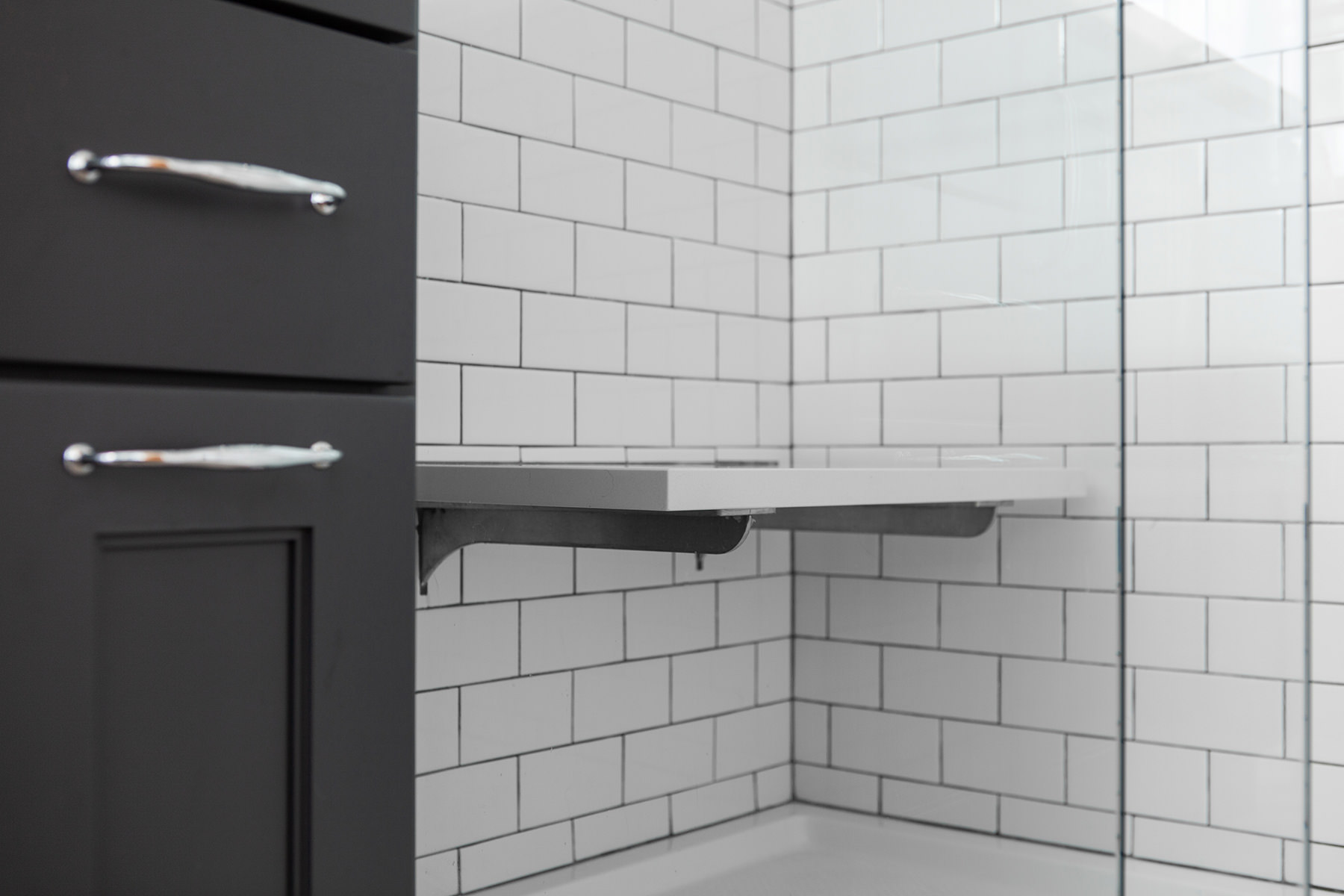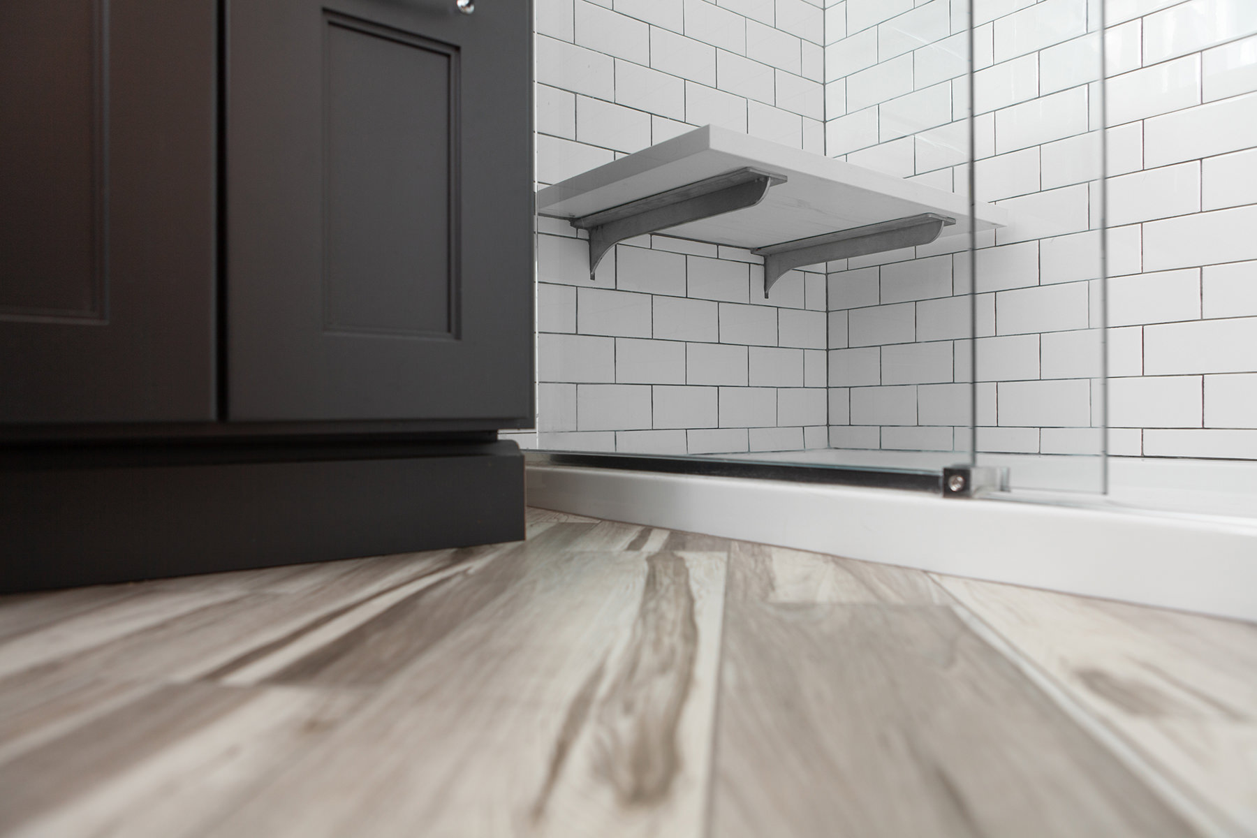 Just because space may me small doesn't mean our Highland Park homeowners need to lose functionality and design. Not every bathroom has space for two vanities, but this oversized sink with 2 faucets is a creative solution when space is limited. Traditional chrome finishes and classic dark cabinets give this bathroom update a timeless finish. We kept lines clean and added bright tile to help make this small space feel open. When it comes to floor design our BDS team kept it light and classic but with a change of direction gave the illusion of more space and added a intriguing design element.