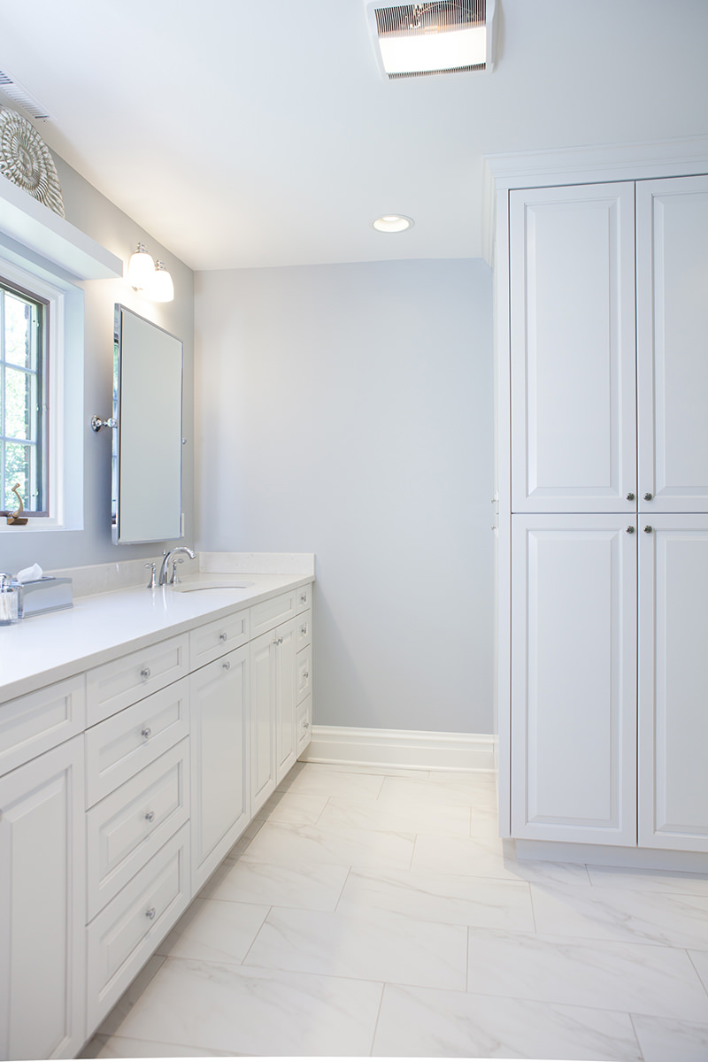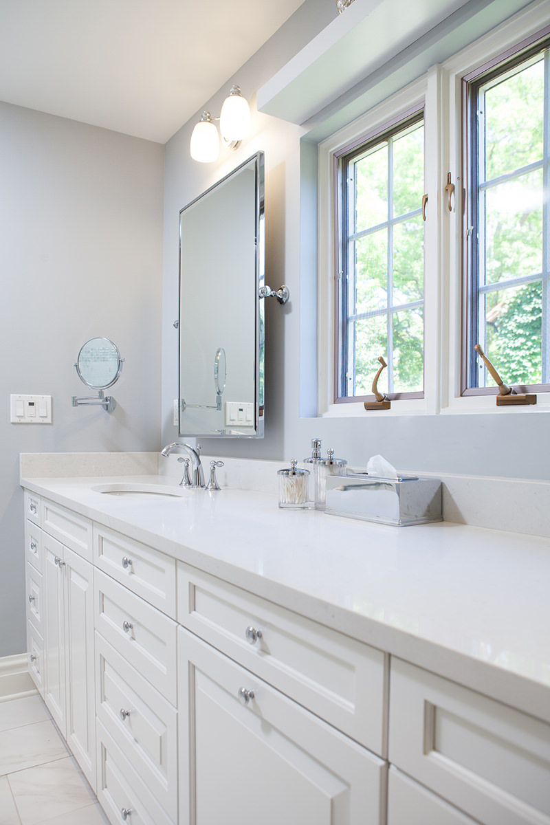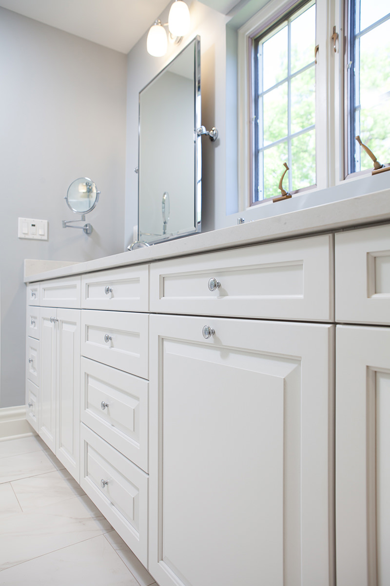 A bright and luxurious bathroom remodel was created for these homeowners in Glenco. Our BDS team was able to gut the existing bathroom and update the space to a high end beautiful space. Bright white cabinetry with top of the line finishes and fixtures created a stunning new bathroom. An open walk in shower with a seat surrounded by glass helps this space feel open and airy.