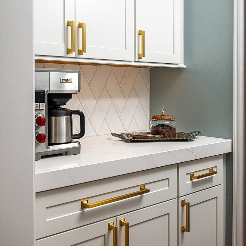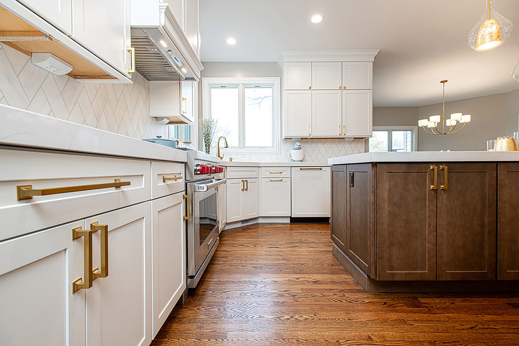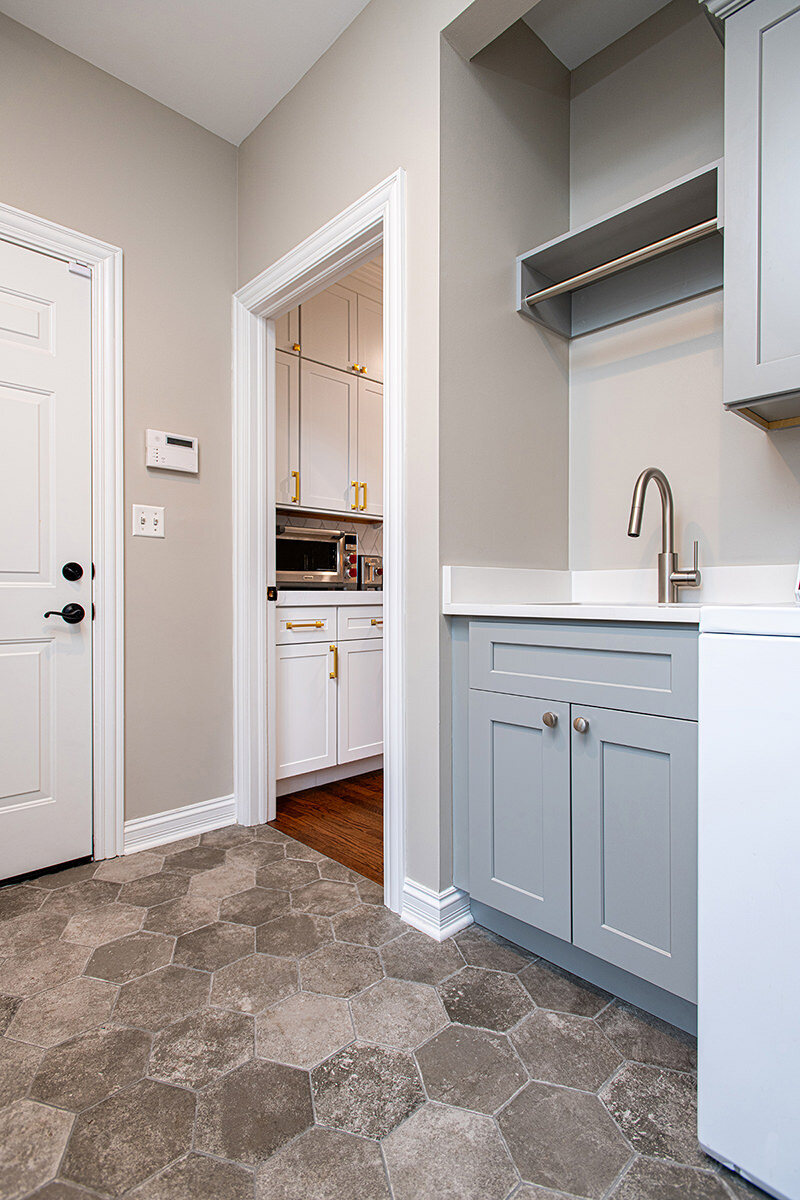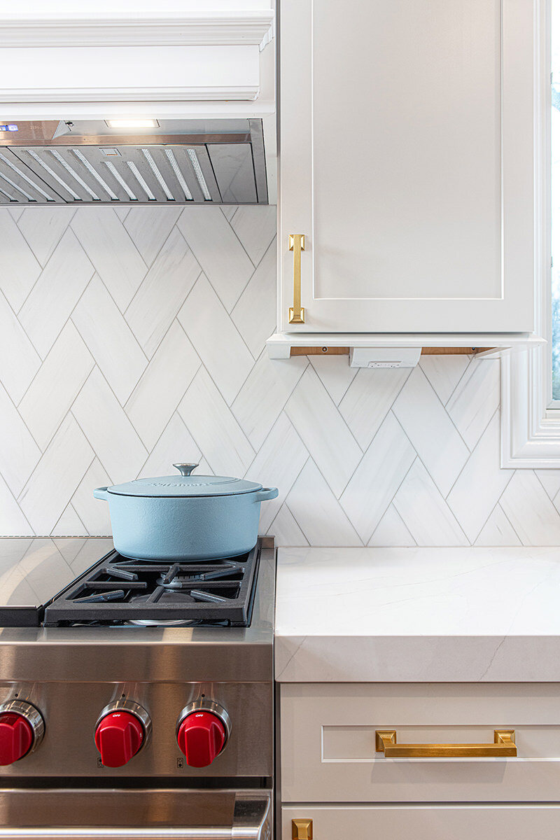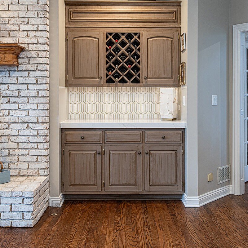 The BDS team was able to transform this Green Oaks kitchen which was in need of some updating. This home had been loved, and our team was excited to give it a fresh update for our homeowners to enjoy for years to come. The cooktop, nestled awkwardly within the island, lacked the space for efficient operation, contributing to the disjointed layout. A full gut was necessary, sparing only the existing fridge and freezer units. After a complete overhaul, the space now had beautiful refinished floors, ample built-in roll-outs, and a reimagined cabinet layout to optimize counter space and flow. With the range relocated to a custom-hooded wall, the island gained storage and functionality. Gorgeous gold fixtures and chunky hardware now adorn the light-filled, white space, accentuating the drama of the thickened countertops. A stunning backsplash pattern complements new chandeliers, echoing the kitchen's newfound elegance. Additionally, a butler pantry and transformed dry bar add sophistication, while the mudroom receives a fresh start with new flooring, custom-built pantry, additional cabinets, LED lighting, and a refreshed powder room completing the revitalization.
