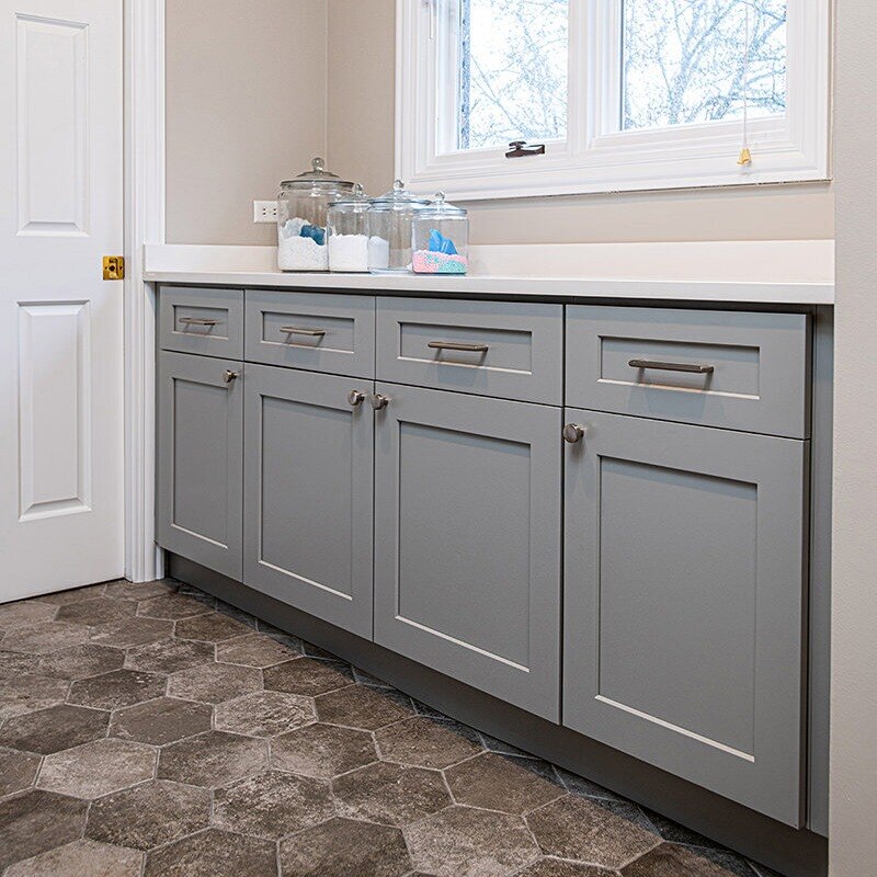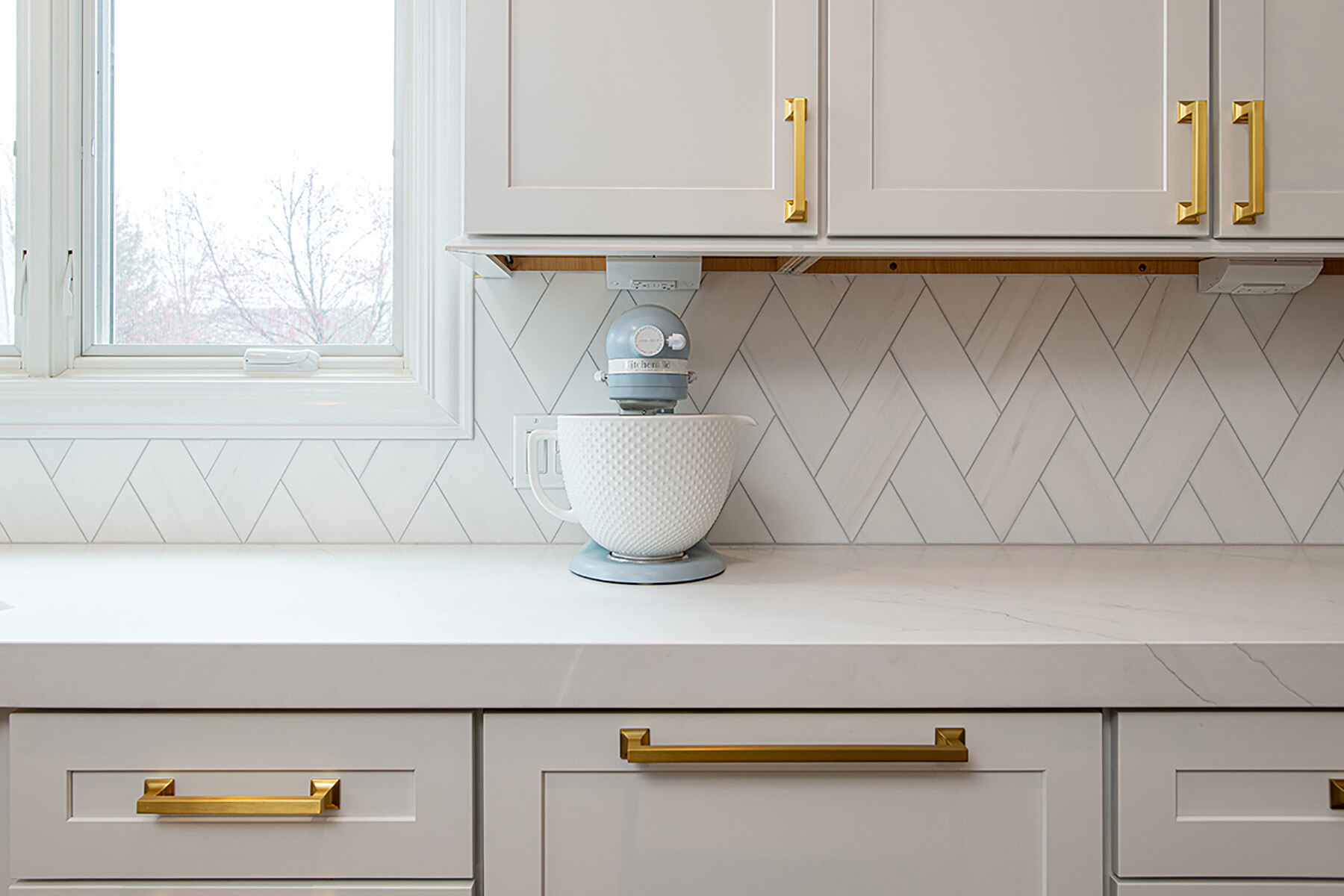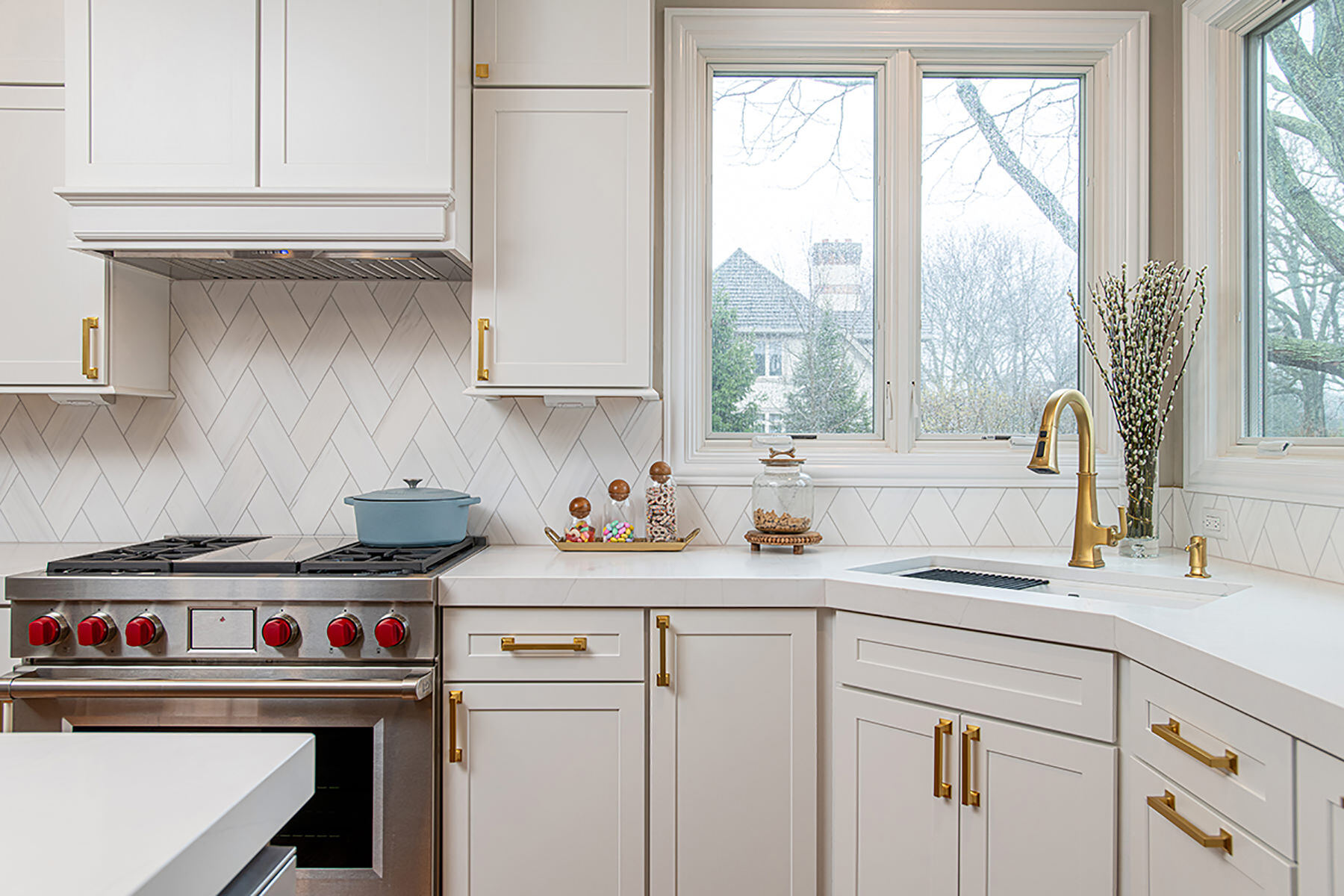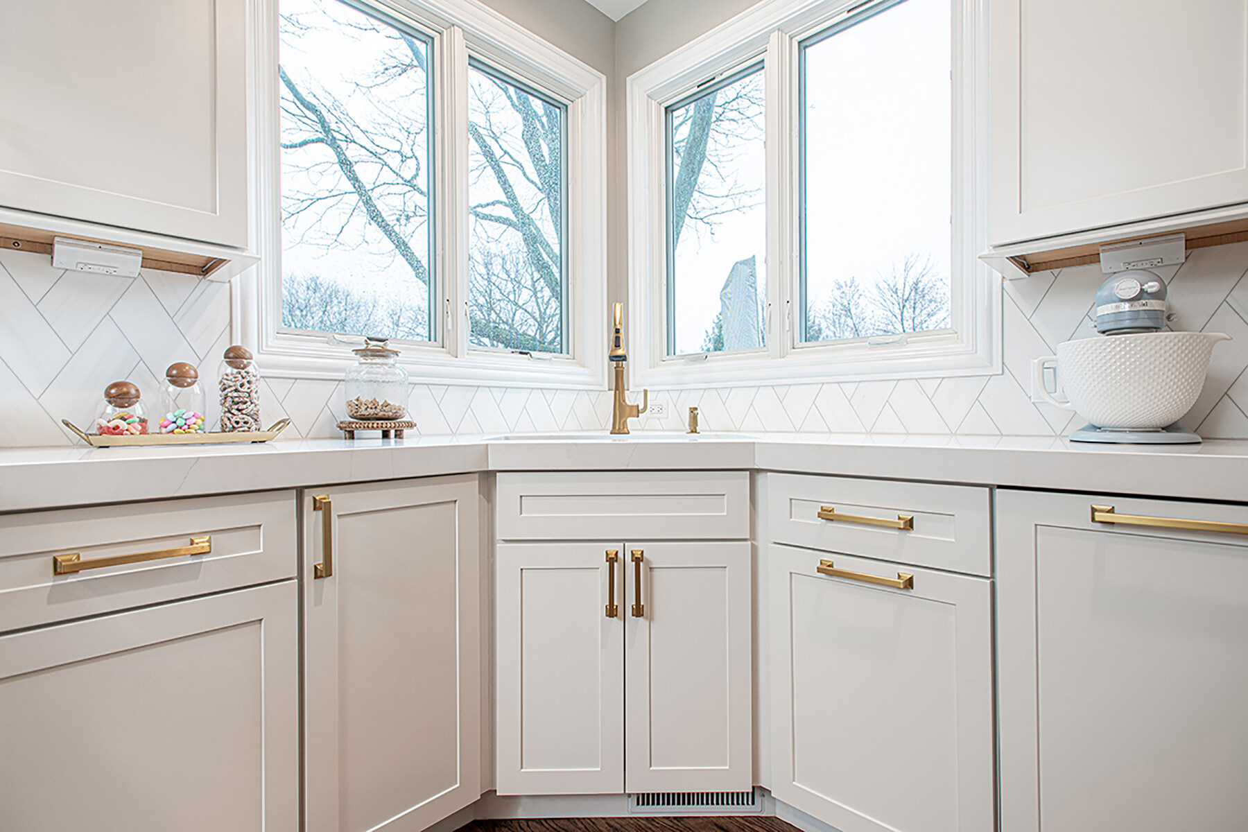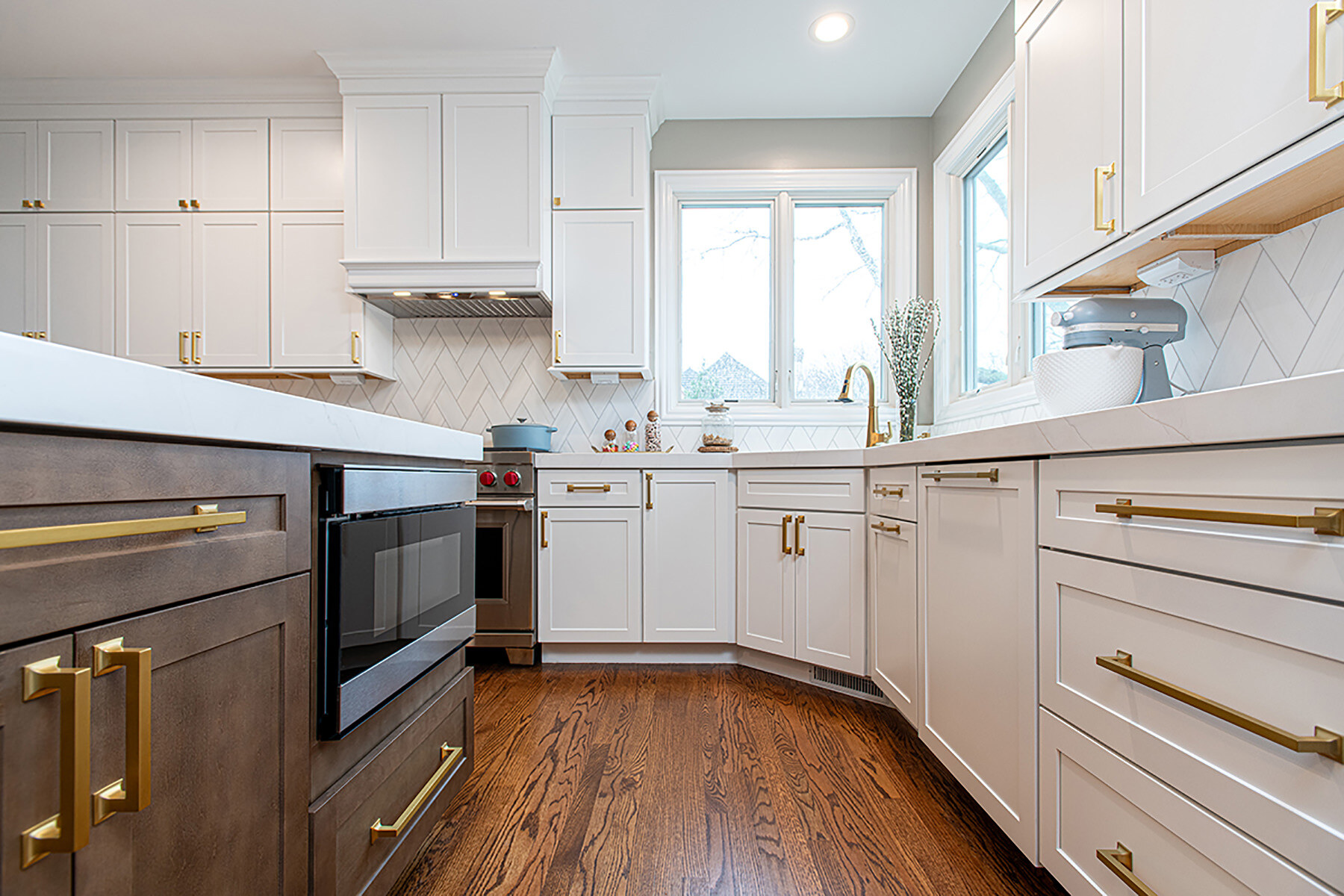 The BDS team was able to transform this Green Oaks kitchen which was in need of some updating. This home had been loved, and our team was excited to give it a fresh update for our homeowners to enjoy for years to come. The cooktop, nestled awkwardly within the island, lacked the space for efficient operation, contributing to the disjointed layout. A full gut was necessary, sparing only the existing fridge and freezer units. After a complete overhaul, the space now had beautiful refinished floors, ample built-in roll-outs, and a reimagined cabinet layout to optimize counter space and flow. With the range relocated to a custom-hooded wall, the island gained storage and functionality. Gorgeous gold fixtures and chunky hardware now adorn the light-filled, white space, accentuating the drama of the thickened countertops. A stunning backsplash pattern complements new chandeliers, echoing the kitchen's newfound elegance. Additionally, a butler pantry and transformed dry bar add sophistication, while the mudroom receives a fresh start with new flooring, custom-built pantry, additional cabinets, LED lighting, and a refreshed powder room completing the revitalization.