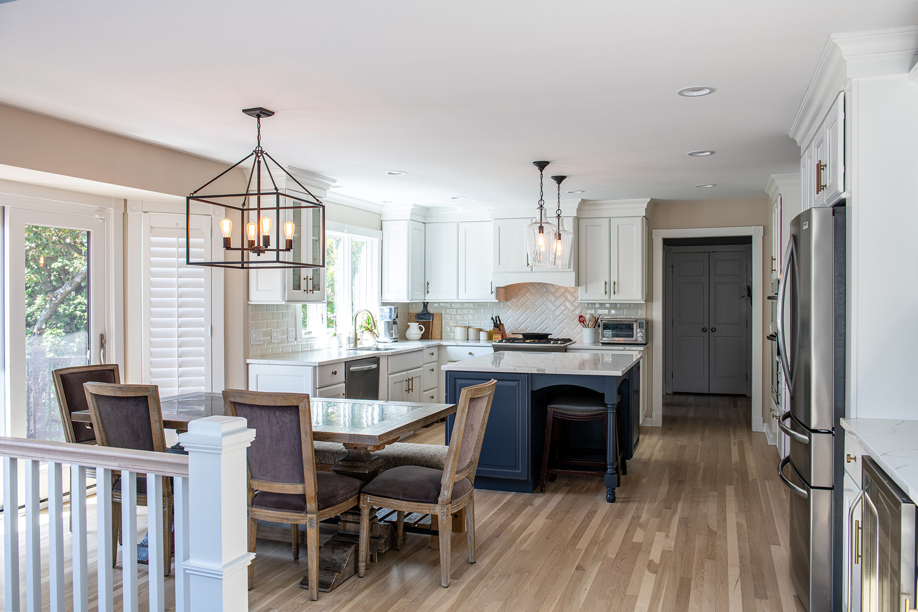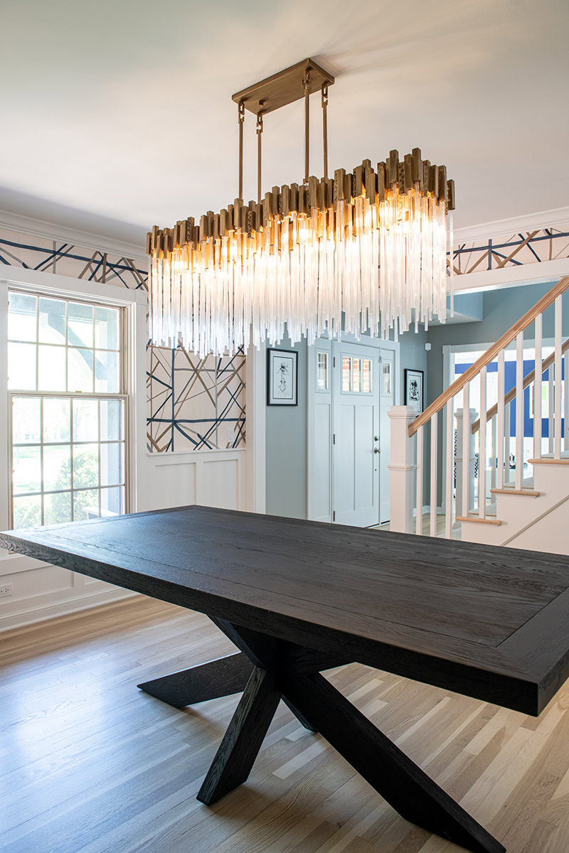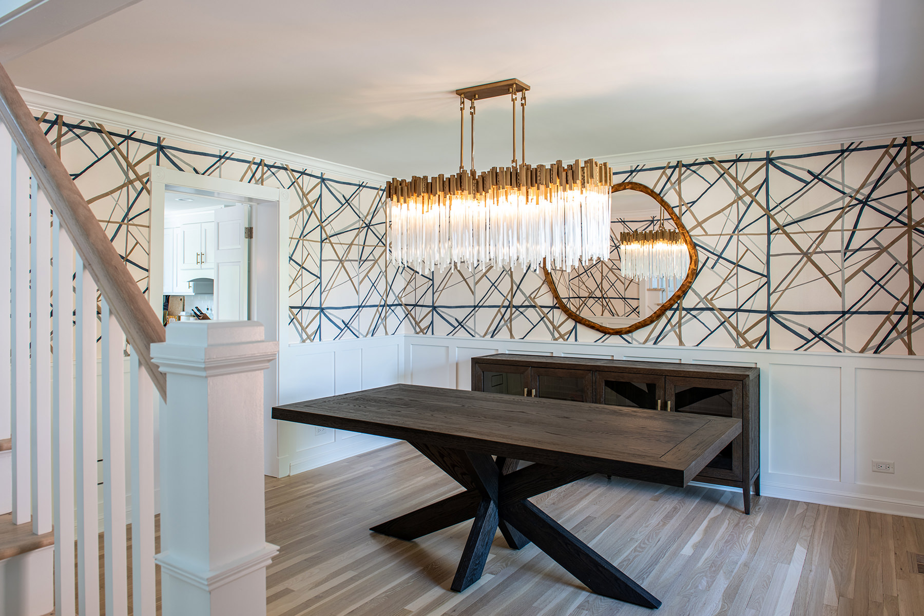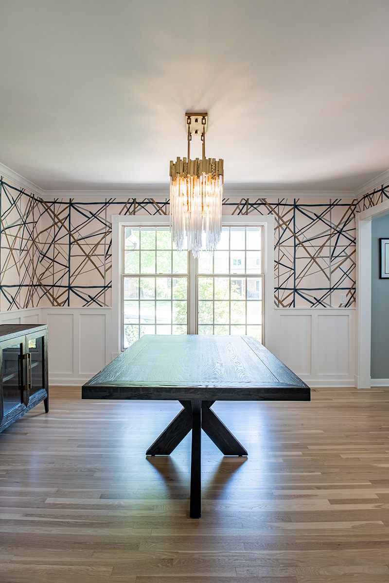 We love when we get to work with our homeowners on multiple projects. This Libertyville remodel was a recently purchased home that didn't align with their desired style, so they requested an interior refresh to make it truly feel like their own. The outdated fireplace room needed the most attention. We added paneling to the fireplace, giving it a fresh and modern look. In addition, we cleverly hid some wiring for the TV within a new custom mantel. The BDS team enhanced the overall aesthetics and functionality of the home by refinishing all the floors and replaced/updated all the stair railings throughout. This brought a sense of elegance and cohesiveness to the entire house. We transformed the kitchen by installing new countertops, a stunning backsplash tile, and fresh paint. In the dining room, our team focused on creating a warm and inviting atmosphere. We installed a new light fixture, added wainscoting for an elegant touch, and incorporated stylish wallpaper. Additionally, we modified the doors for better functionality and improved access from the kitchen, optimizing the flow between the two spaces.