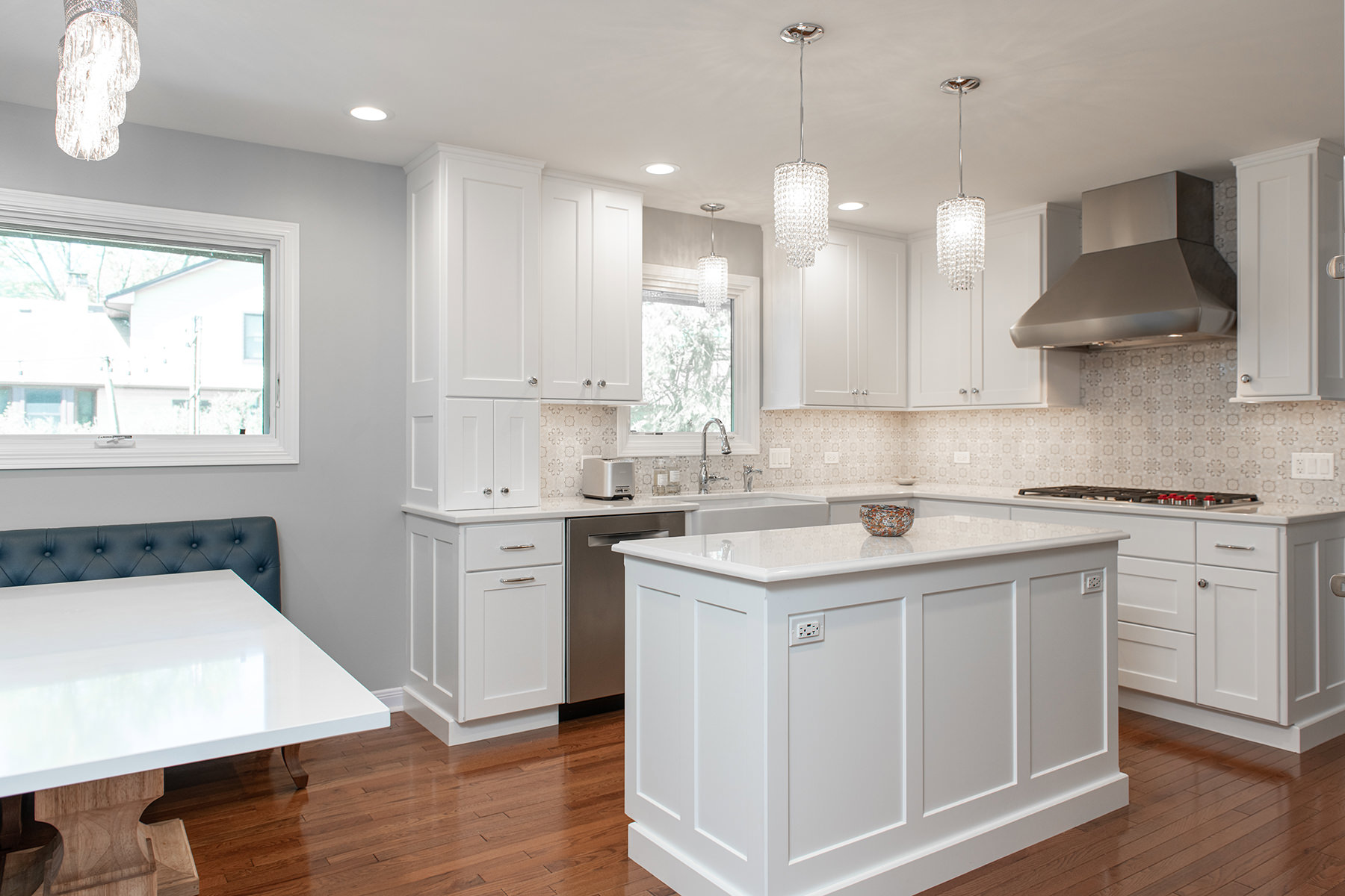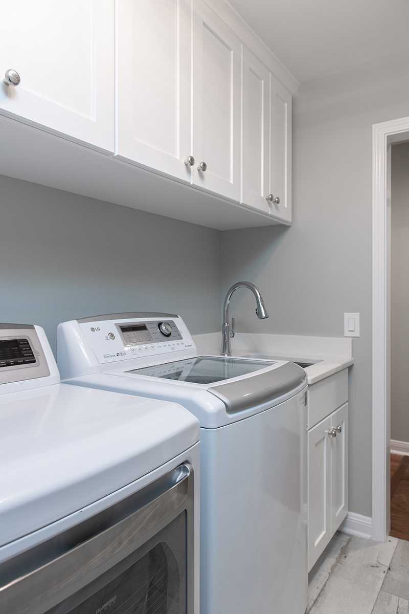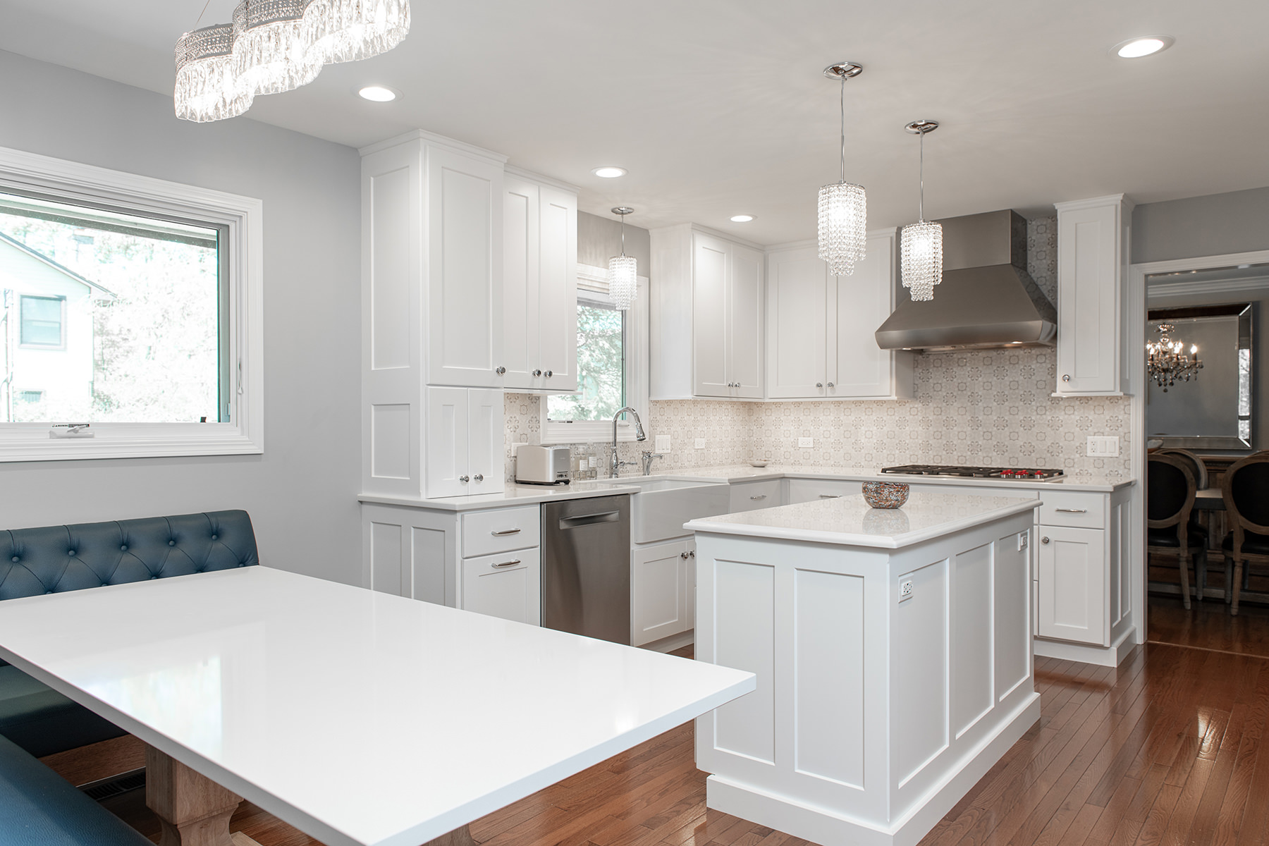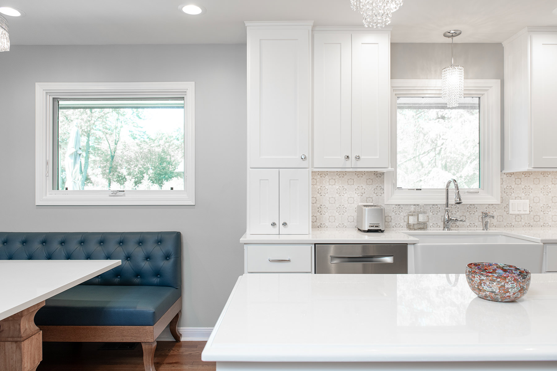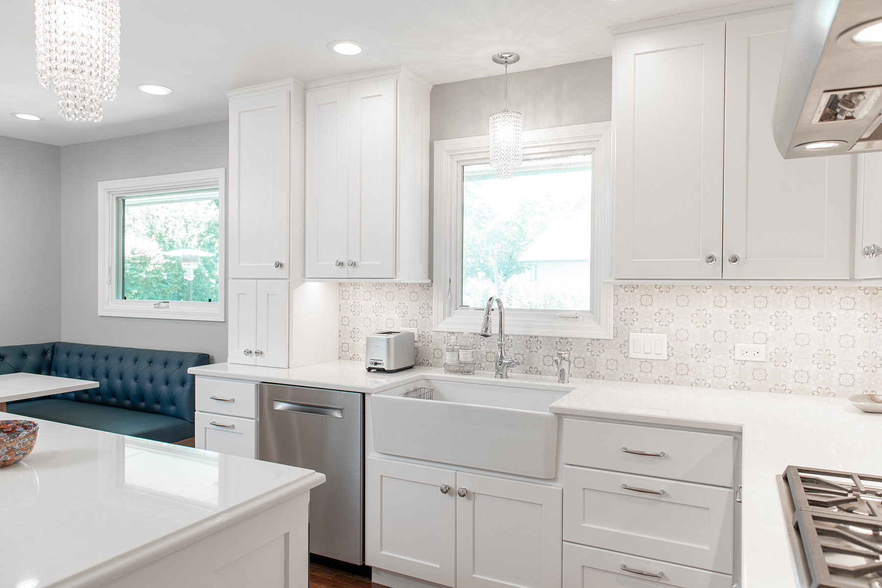 This Highland Park kitchen and laundry room project was a complete gut and remodel. Our homeowners were dealing with an outdated style as well as an inefficient work triangle and failing appliances. Our BDS team was able to come in and help our homeowners reconfigure this work space in the kitchen and the layout in the laundry room to optimize the space in the home. Bright white cabinets in both the laundry room and kitchen help create a classic and clean look for this remodel. Ample storage in both spaces offer plenty of room for appliances to be tucked nicely away. A gorgeous eat-in table was designed with a stunning blue bench seat that provides comfort as well as a pop of color for this neutral space. Stunning new lighting adds just the right amount of glamour to this beautiful remodel.