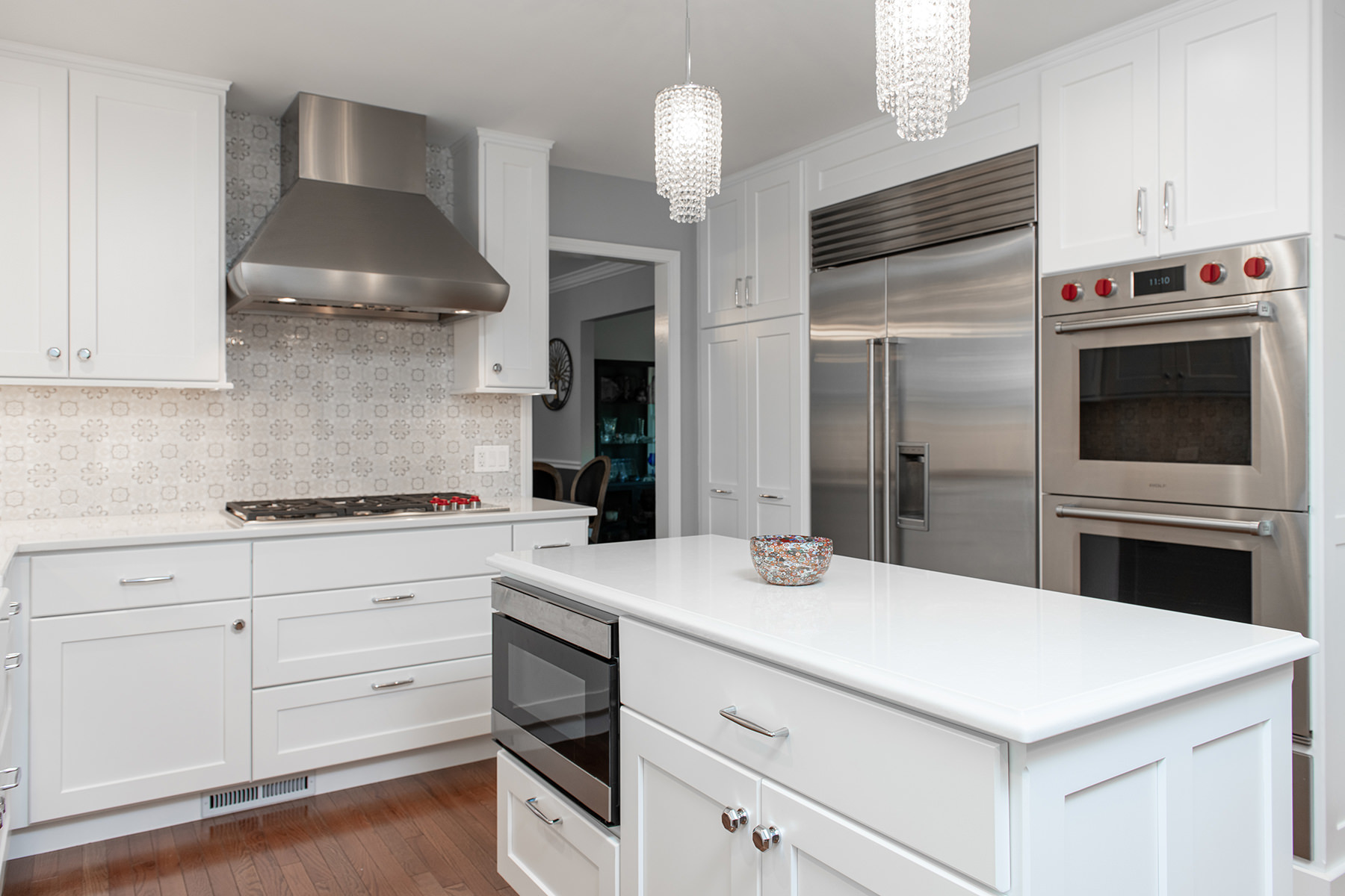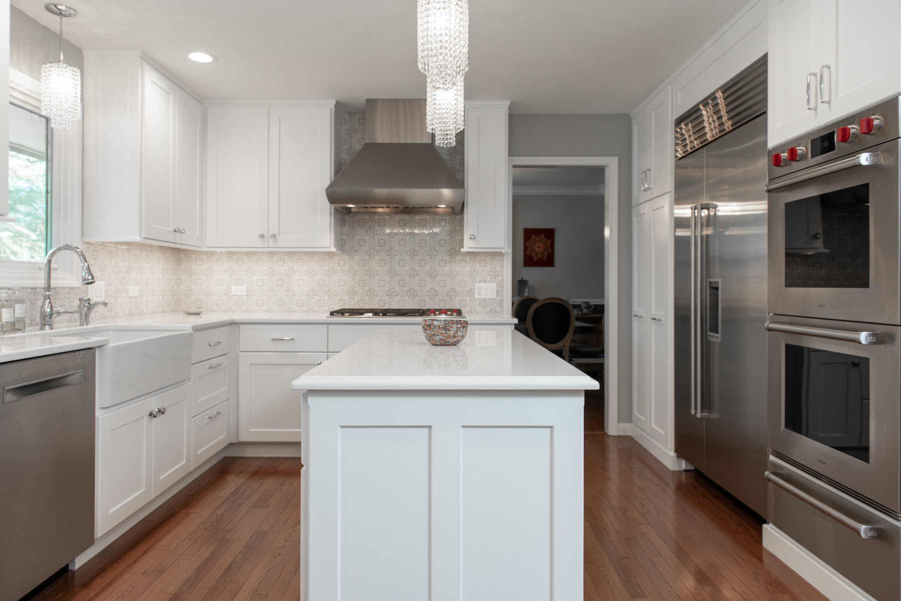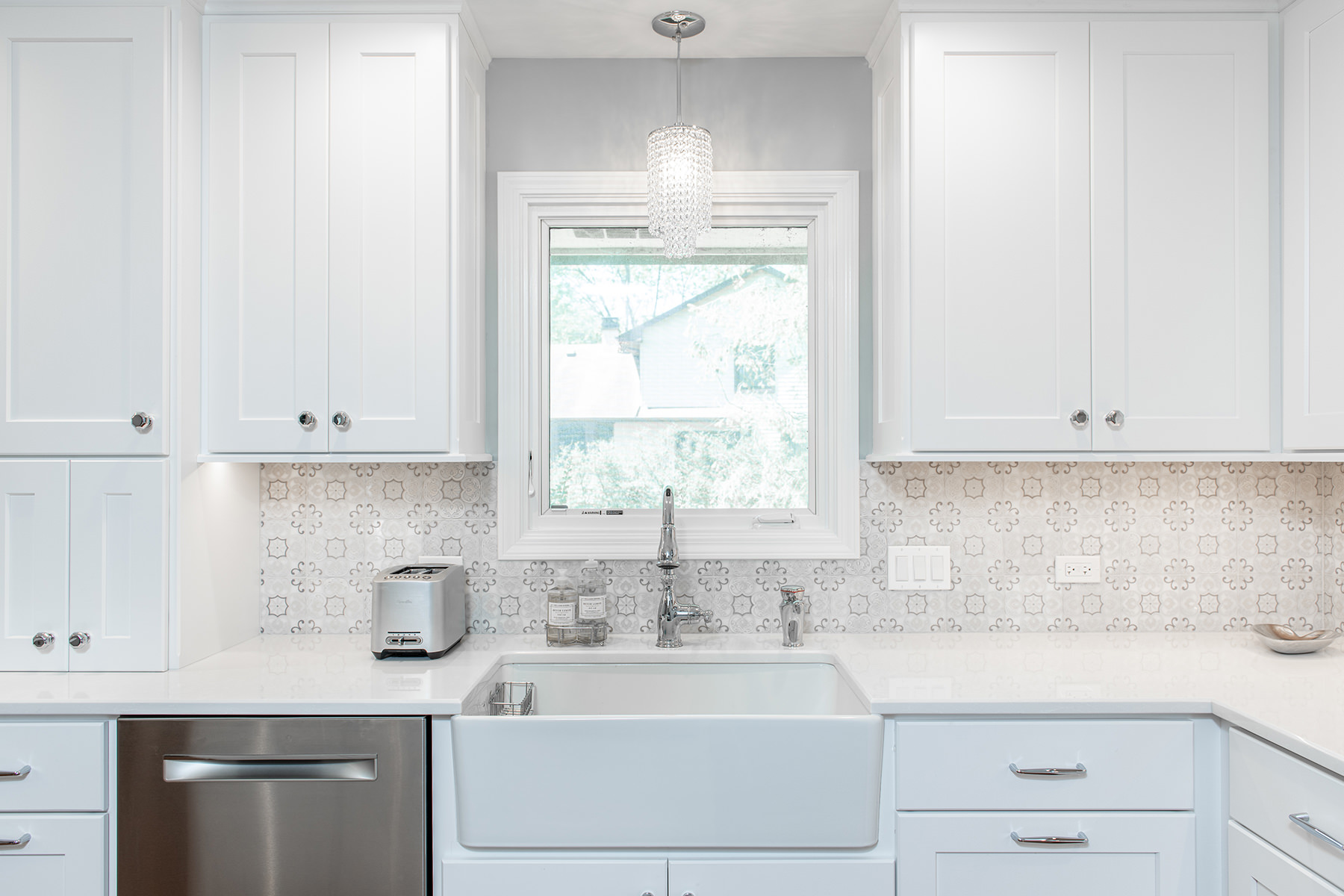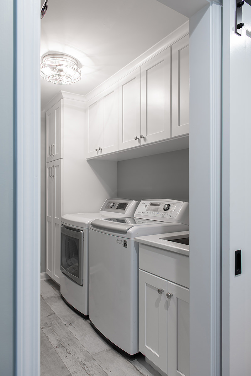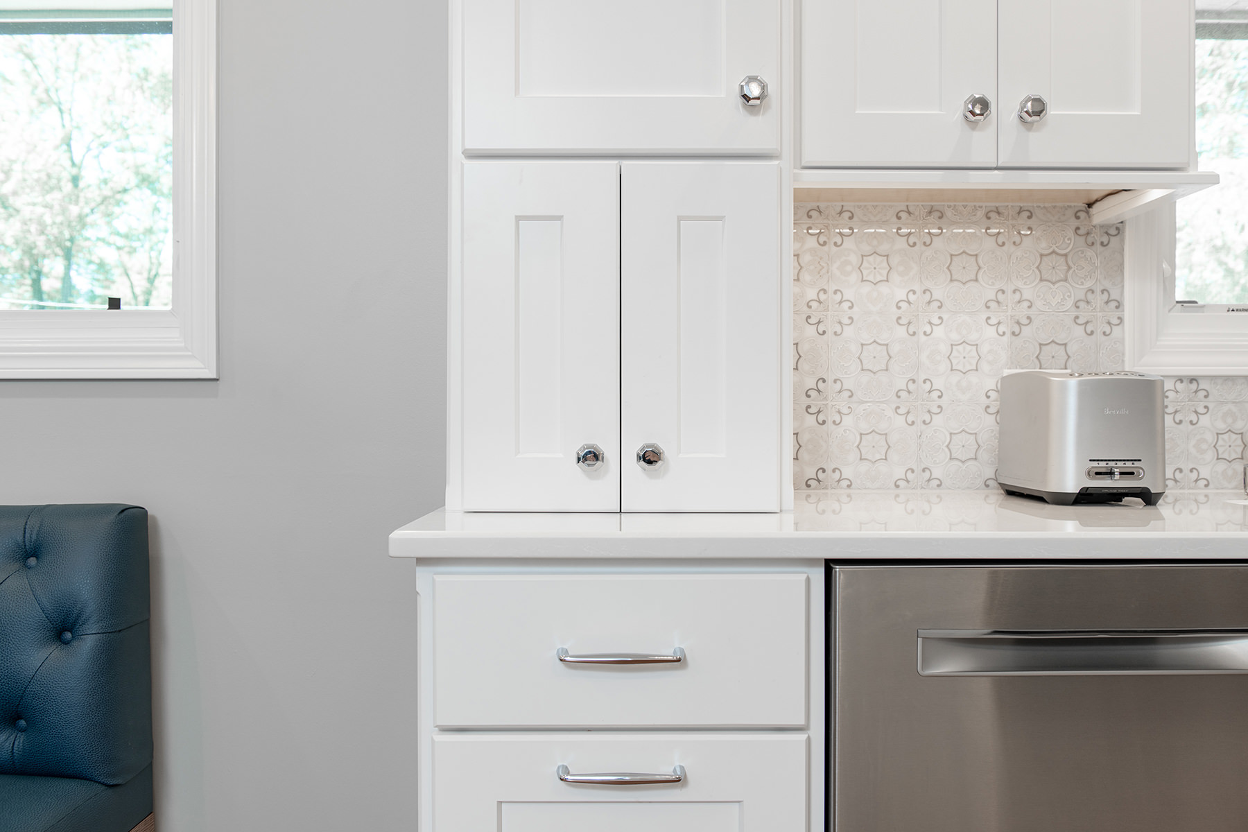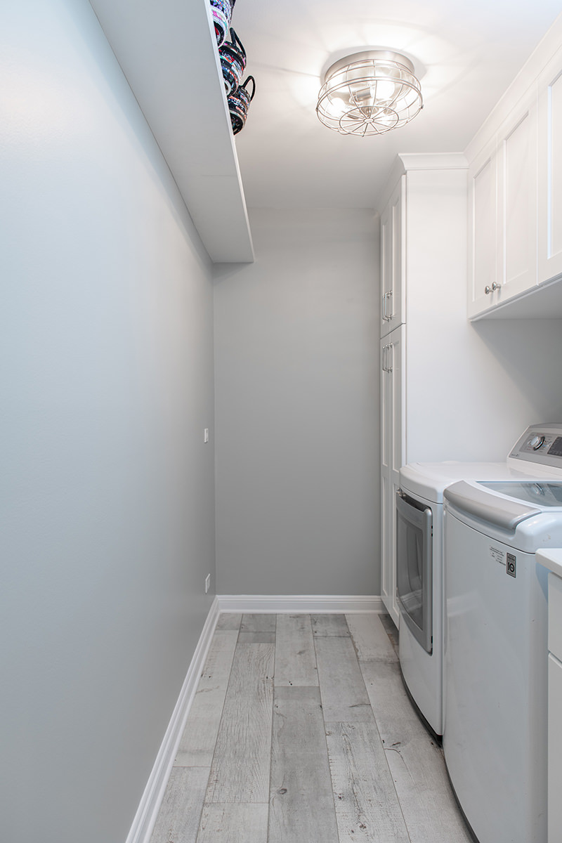 This Highland Park kitchen and laundry room project was a complete gut and remodel. Our homeowners were dealing with an outdated style as well as an inefficient work triangle and failing appliances. Our BDS team was able to come in and help our homeowners reconfigure this work space in the kitchen and the layout in the laundry room to optimize the space in the home. Bright white cabinets in both the laundry room and kitchen help create a classic and clean look for this remodel. Ample storage in both spaces offer plenty of room for appliances to be tucked nicely away. A gorgeous eat-in table was designed with a stunning blue bench seat that provides comfort as well as a pop of color for this neutral space. Stunning new lighting adds just the right amount of glamour to this beautiful remodel.