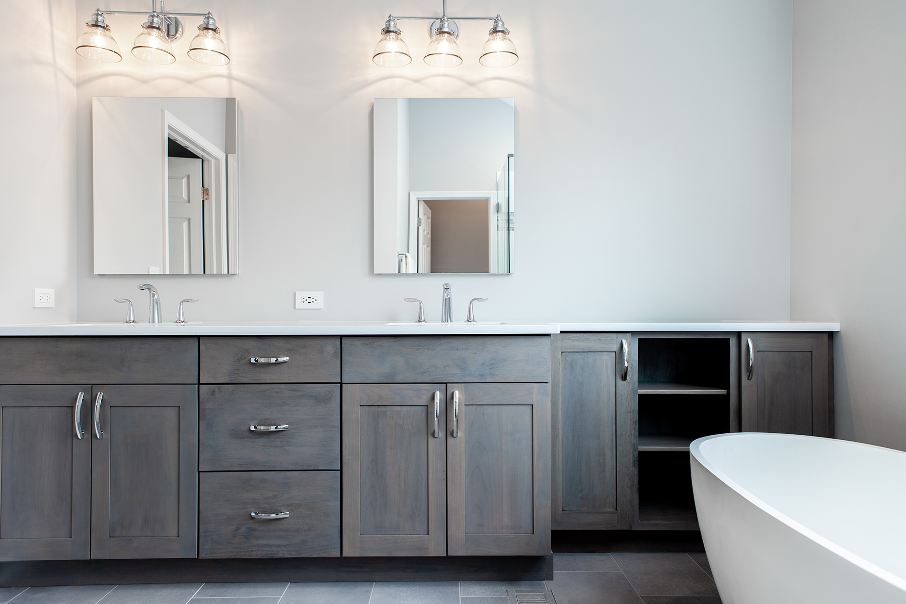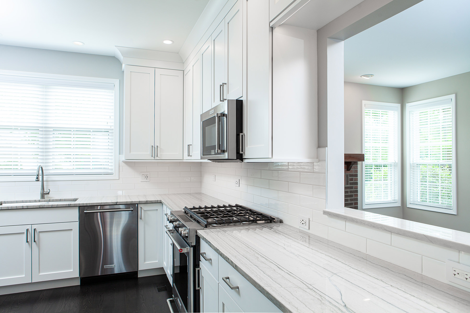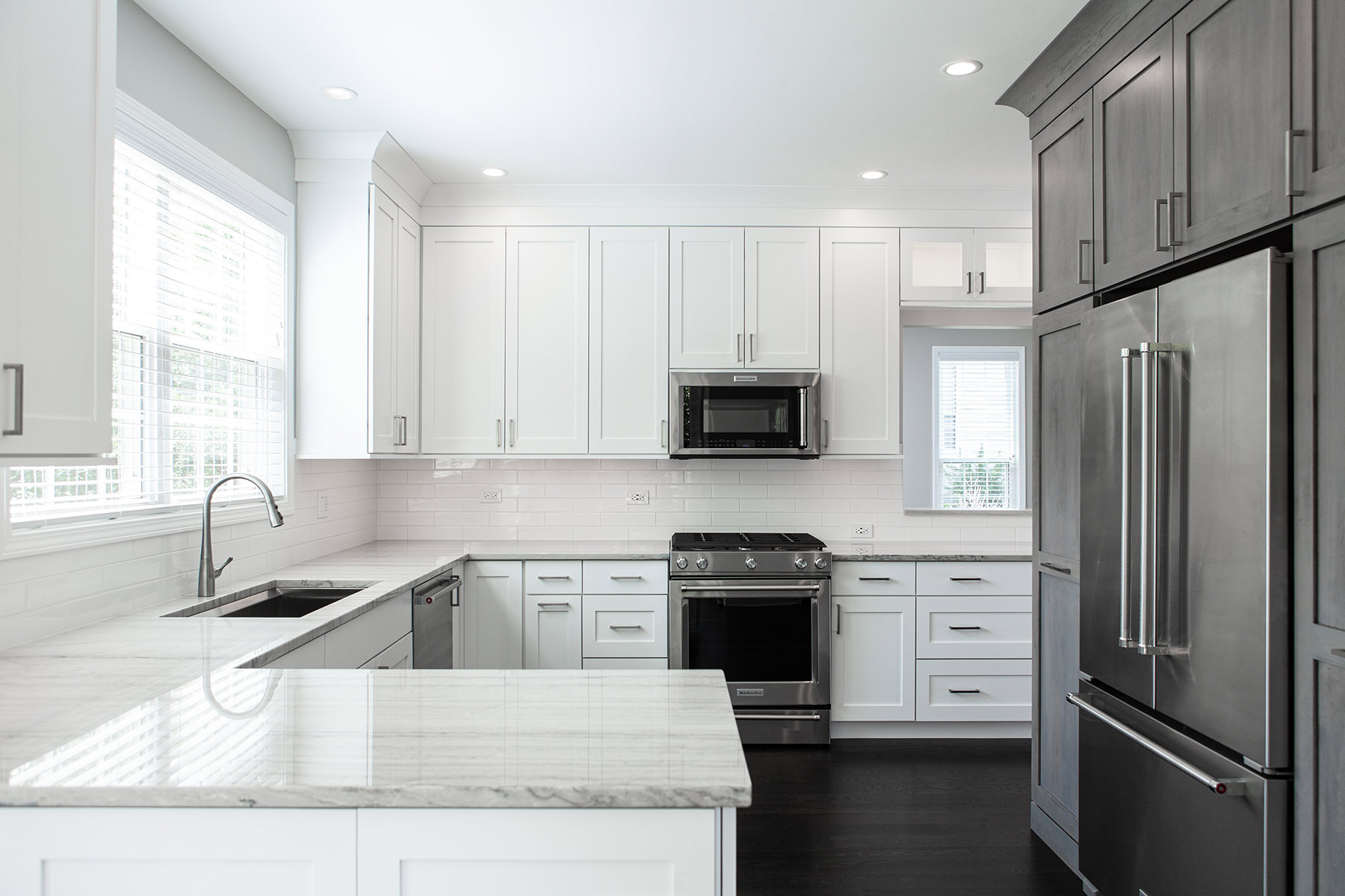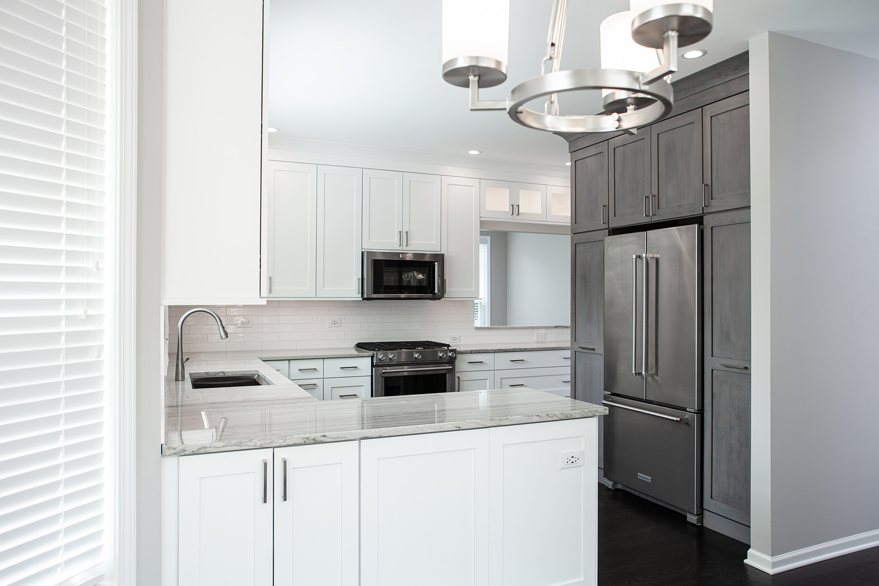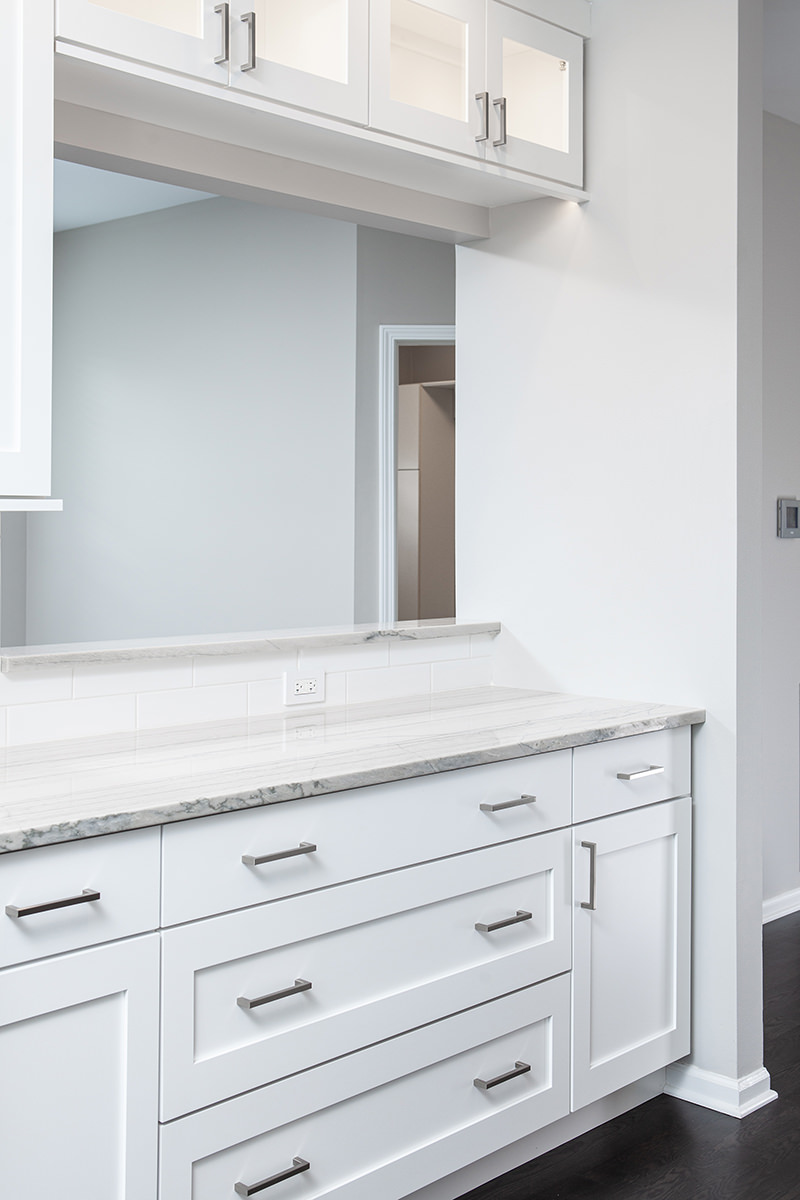 Our BDS team had the pleasure of working on the Lake Zurich project not once but twice! Our first project involved a master bathroom and kitchen remodel, and our second time to work with this client was for a fireplace, basement, and hall bathroom remodel! The goal for the kitchen design was to create a gorgeous, functional and organized space with semi custom cabinets, new quartzite countertops, and update the lighting, hardware, and appliances. For the primary bathroom we opened up the space to allow for a light to flow through with a glass shower and added a freestanding tub. Updates were made to the cabinets, lighting, hardware, and ventilation.