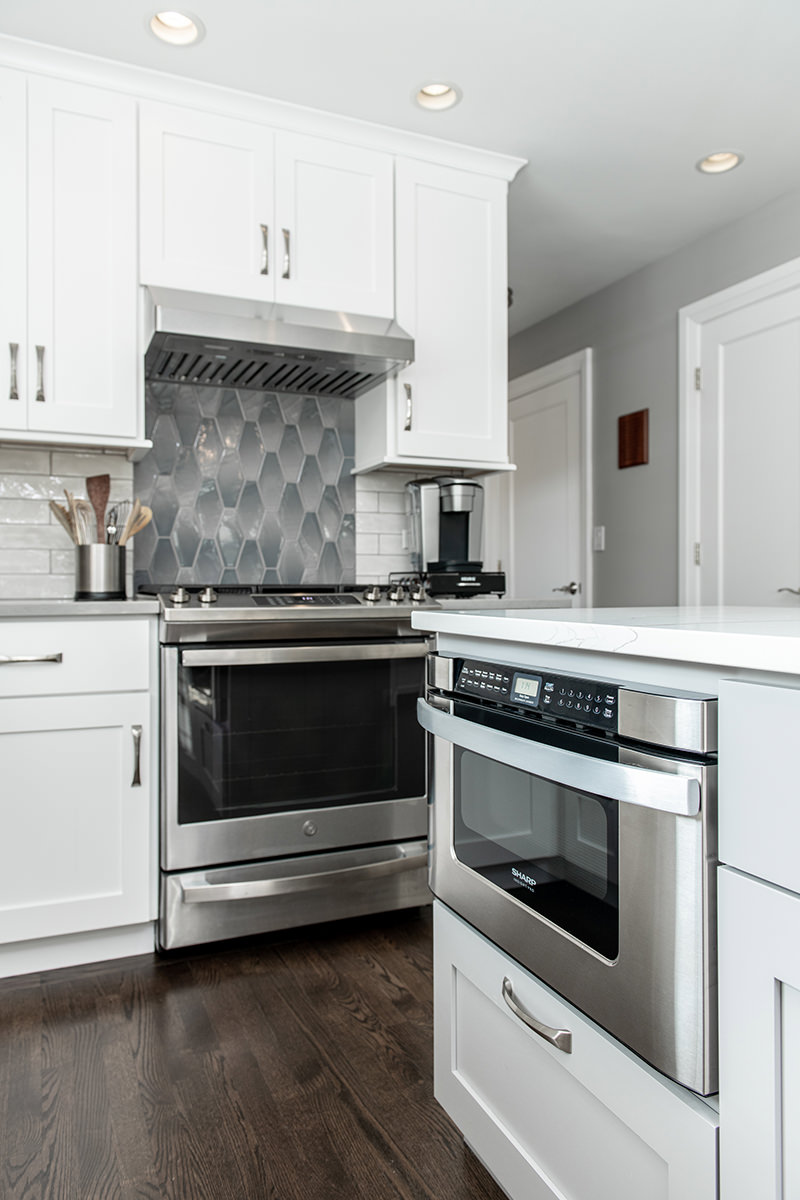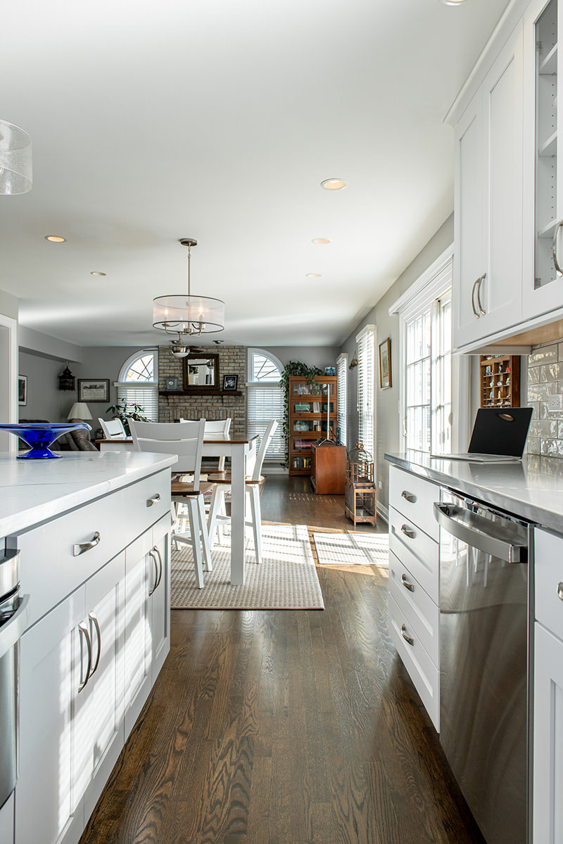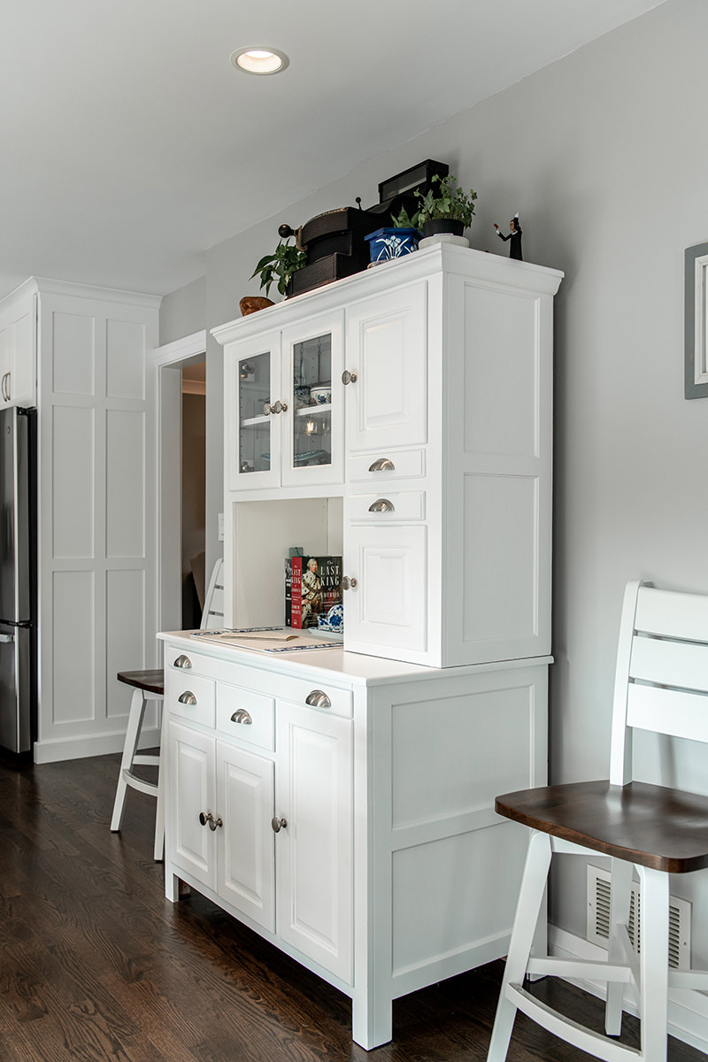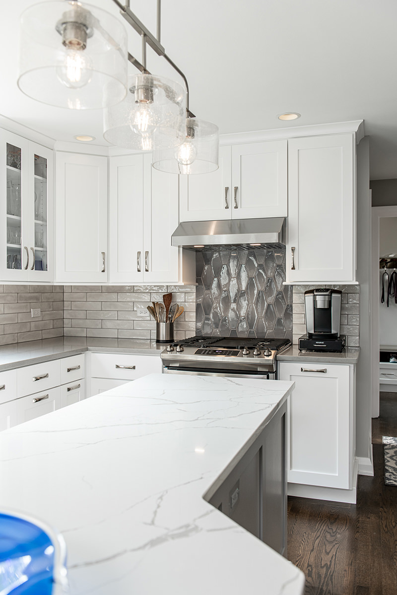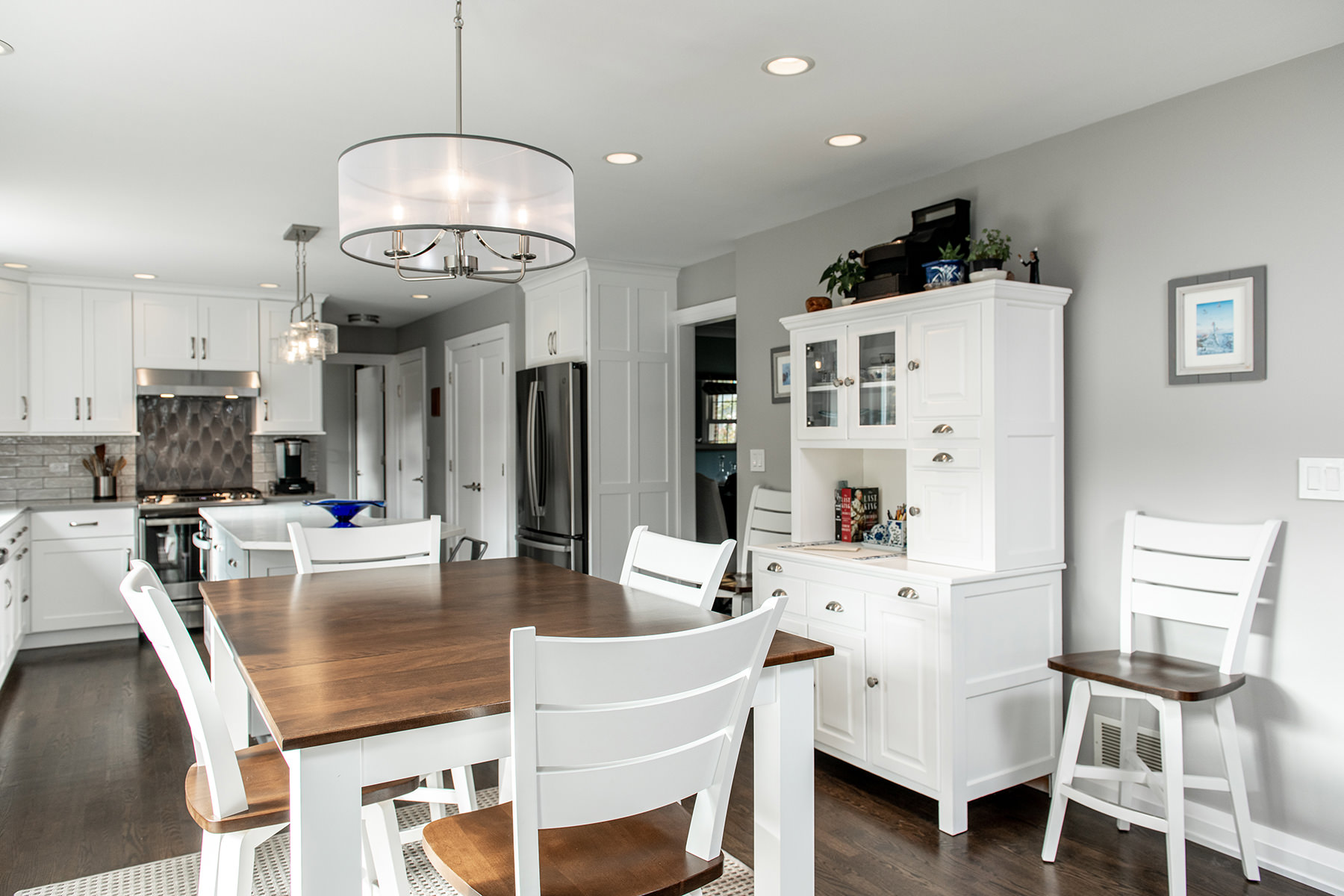 The kitchen was one of the last spaces of this Third Lake home that our BDS team had the opportunity to remodel. We took this dark and outdated space, and created a beautiful light, open kitchen. White cabinets are topped off with a cool gray countertop. A stunning neutral backsplash with a pop of change behind the range makes this kitchen uniquely incredible. The expanded kitchen island creates additional seating to host guests and family. The abundance of perfectly organized cabinet storage creates a dream space to place all those gadgets. A rich, dark wood flooring finishes off this gorgeously remodeled kitchen.