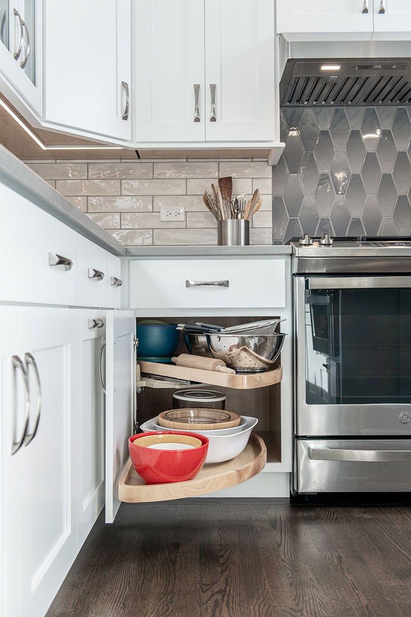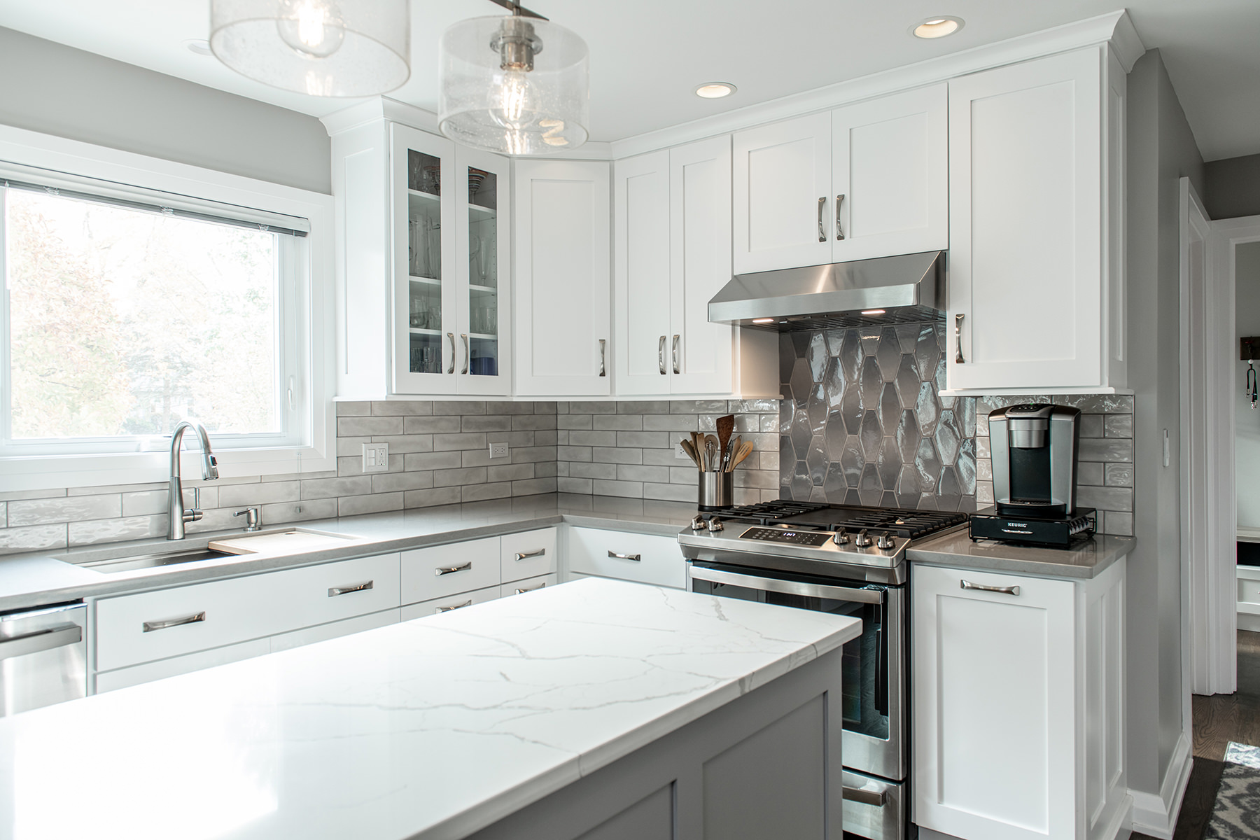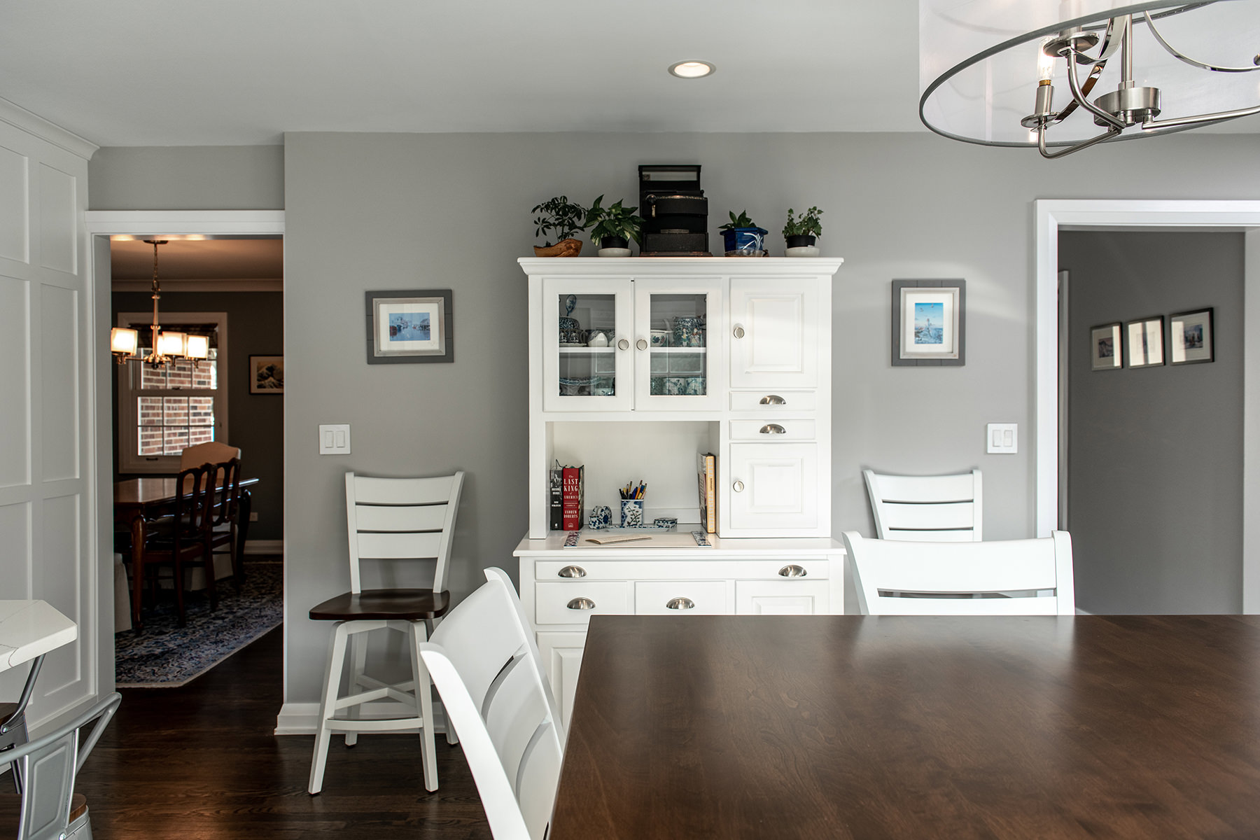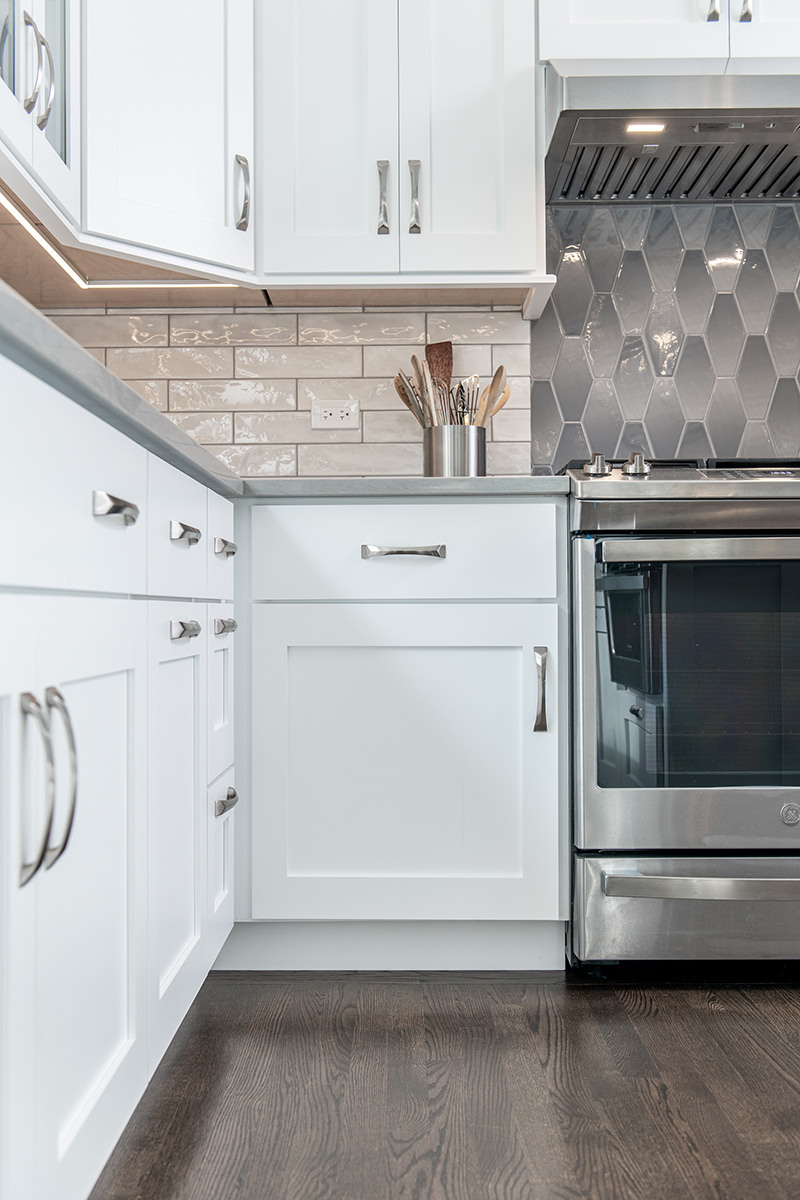 The kitchen was one of the last spaces of this Third Lake home that our BDS team had the opportunity to remodel. We took this dark and outdated space, and created a beautiful light, open kitchen. White cabinets are topped off with a cool gray countertop. A stunning neutral backsplash with a pop of change behind the range makes this kitchen uniquely incredible. The expanded kitchen island creates additional seating to host guests and family. The abundance of perfectly organized cabinet storage creates a dream space to place all those gadgets. A rich, dark wood flooring finishes off this gorgeously remodeled kitchen.