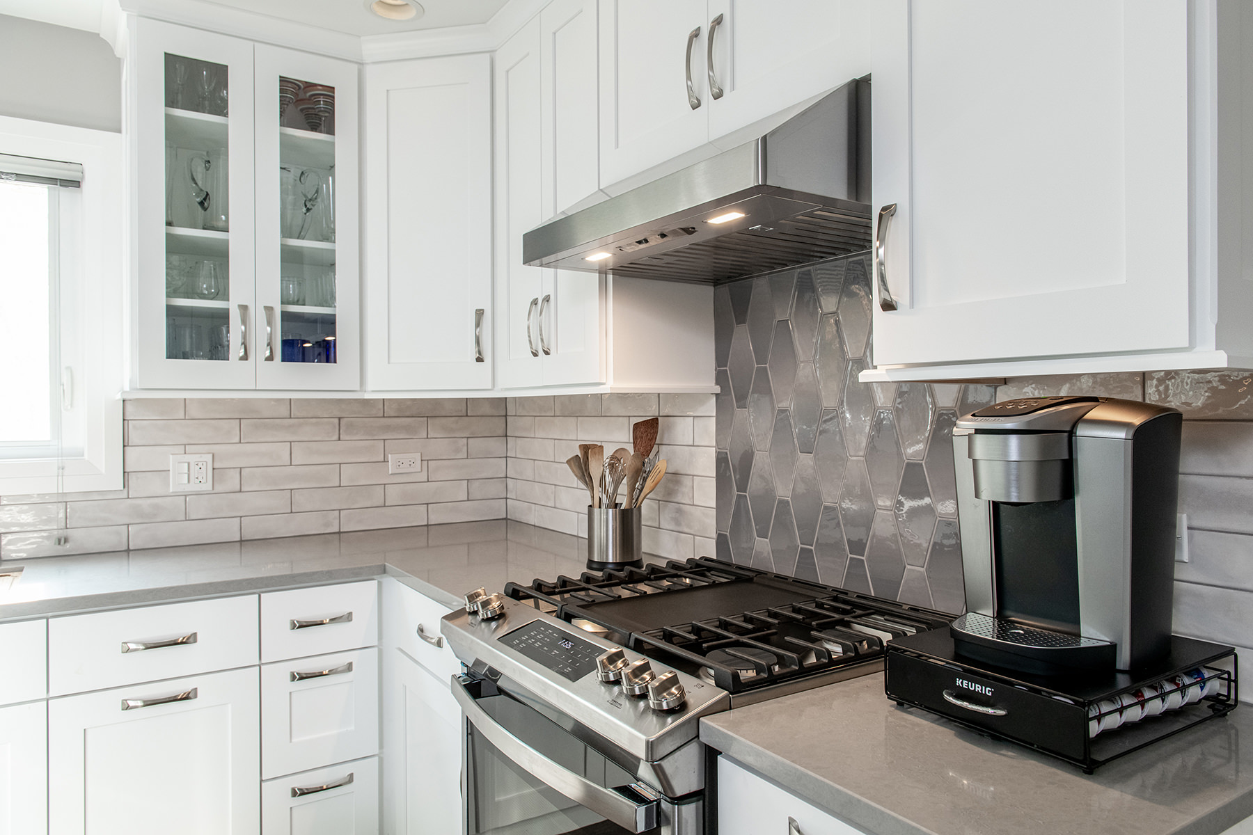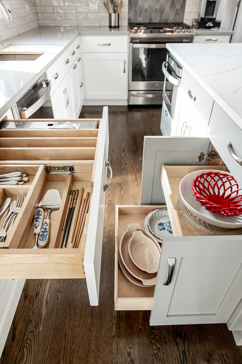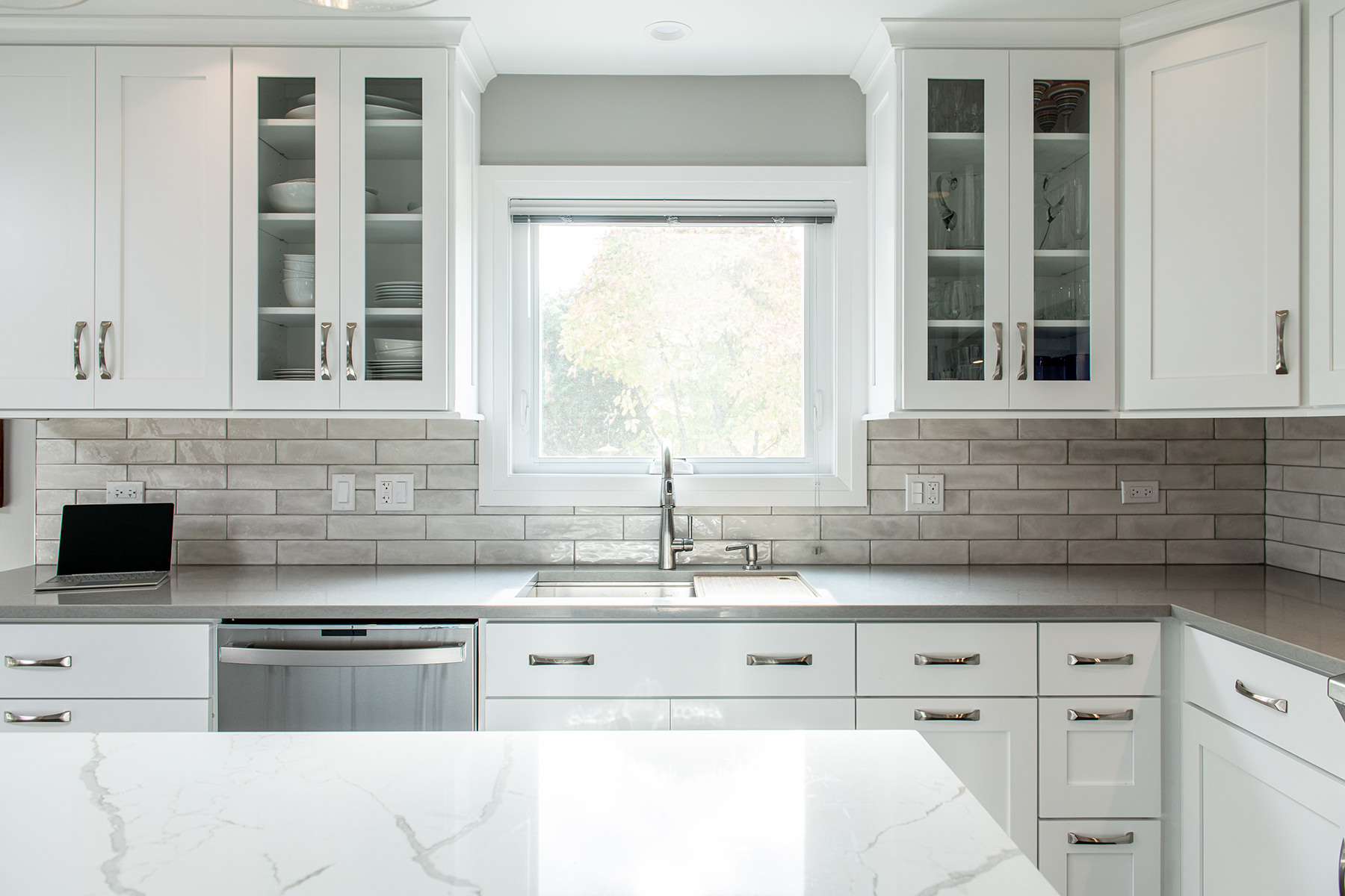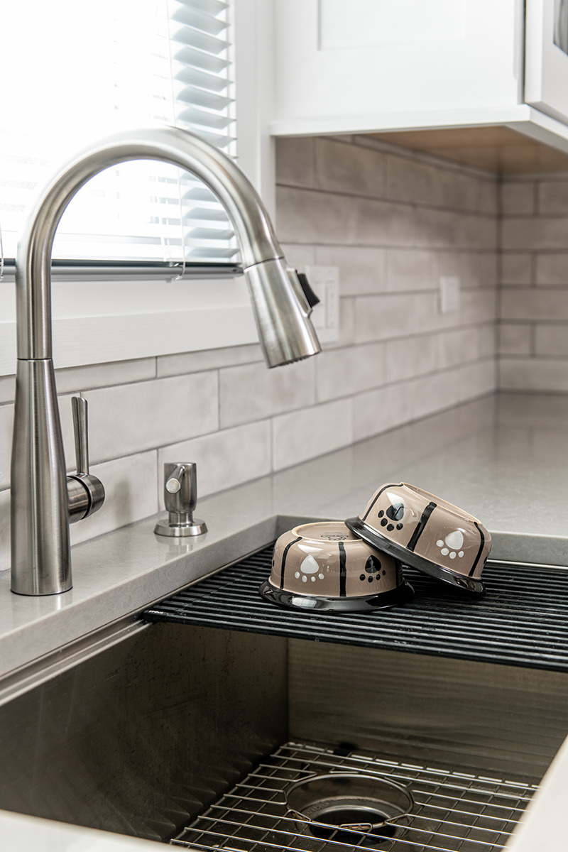 The kitchen was one of the last spaces of this Third Lake home that our BDS team had the opportunity to remodel. We took this dark and outdated space, and created a beautiful light, open kitchen. White cabinets are topped off with a cool gray countertop. A stunning neutral backsplash with a pop of change behind the range makes this kitchen uniquely incredible. The expanded kitchen island creates additional seating to host guests and family. The abundance of perfectly organized cabinet storage creates a dream space to place all those gadgets. A rich, dark wood flooring finishes off this gorgeously remodeled kitchen.