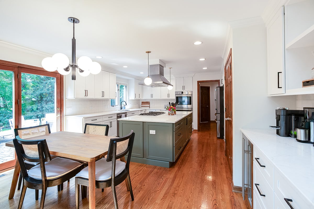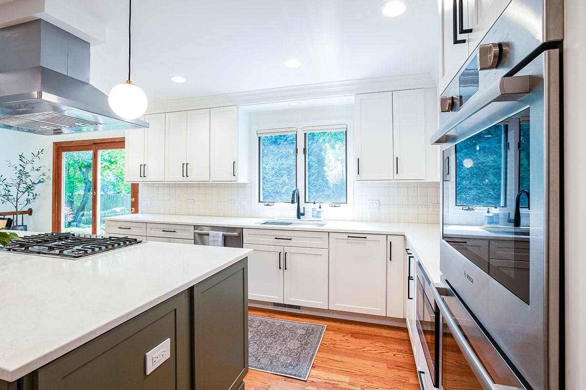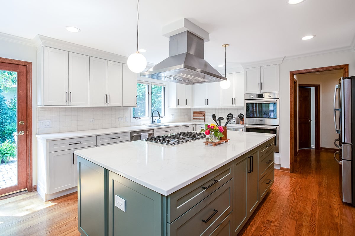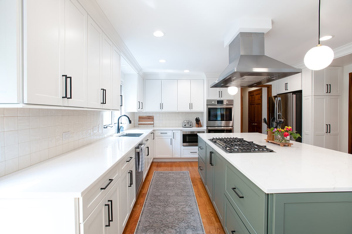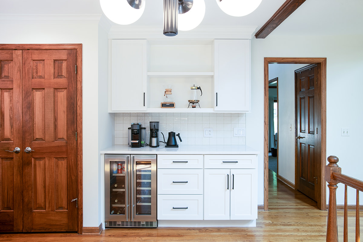 Our Libertyville family quickly realized the kitchen layout wasn't working for them after moving into their new home . The space featured an awkwardly shaped island with little prep space, outdated finishes, and a low-hanging hood that posed a real challenge—especially for the tall homeowner. Our BDS team transformed the kitchen by using the newer appliances that come with the home and incorporating a larger gas cooktop and an under-counter microwave to free up workspace. The redesigned island gives our homeowners a larger, more functional island which features a beautiful accent color for a fun, modern touch. The BDS team removed the existing soffits and brought in new cabinetry which went up to the ceiling. This created more storage and a clean, finished look. A workstation sink was added for better workflow, and the old desk area was converted into a stylish coffee station. Bright, light finishes and improved lighting makes the new space feel open and inviting—combining practicality with personality in every detail.