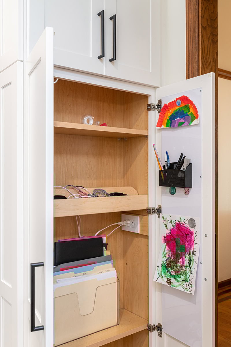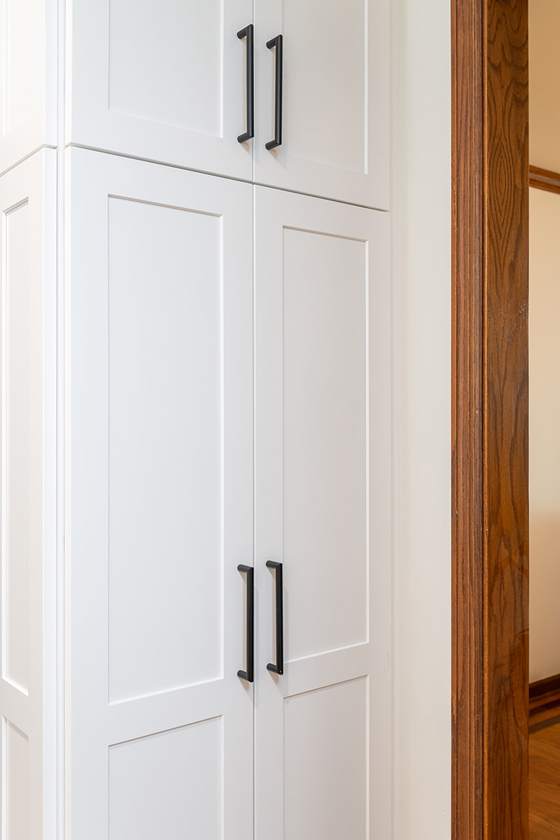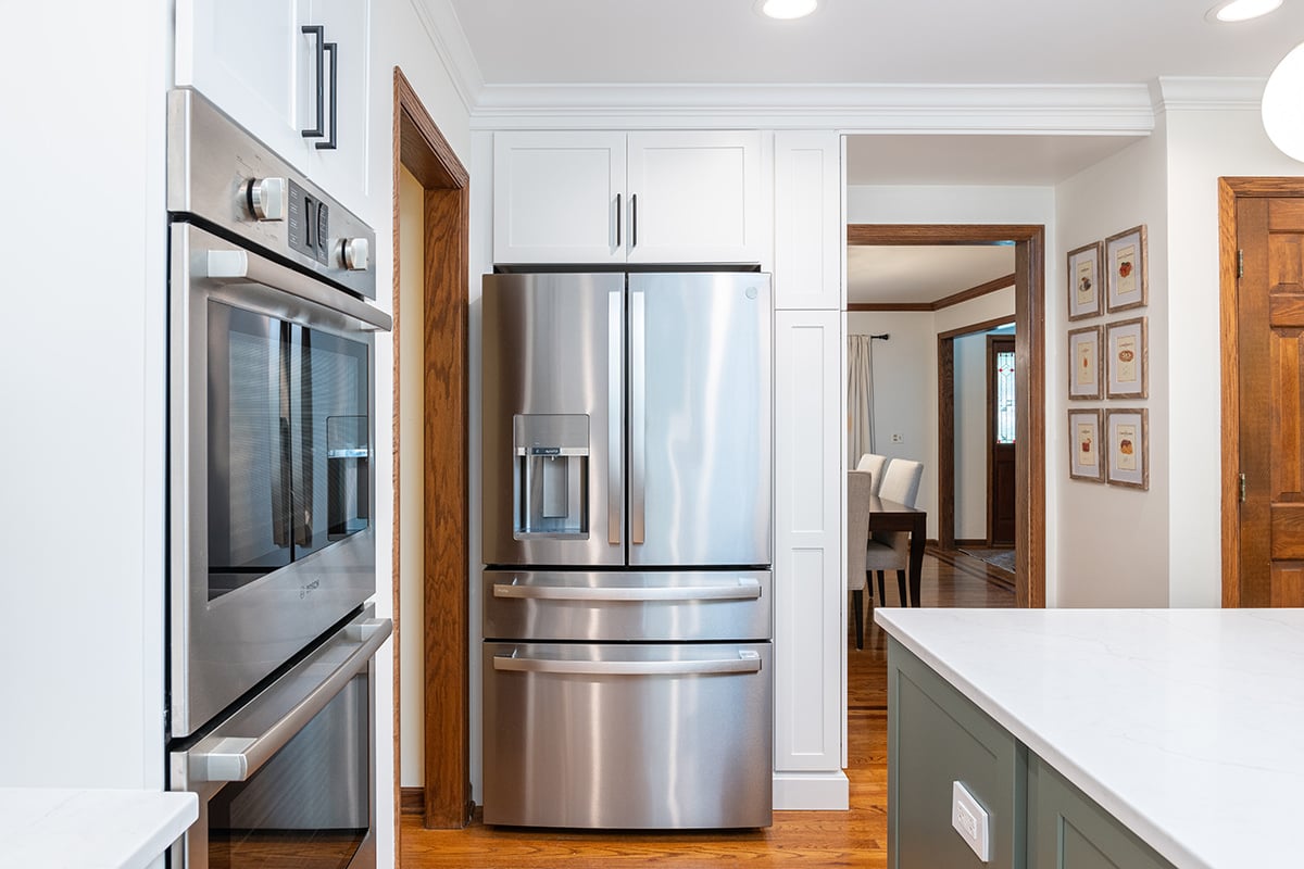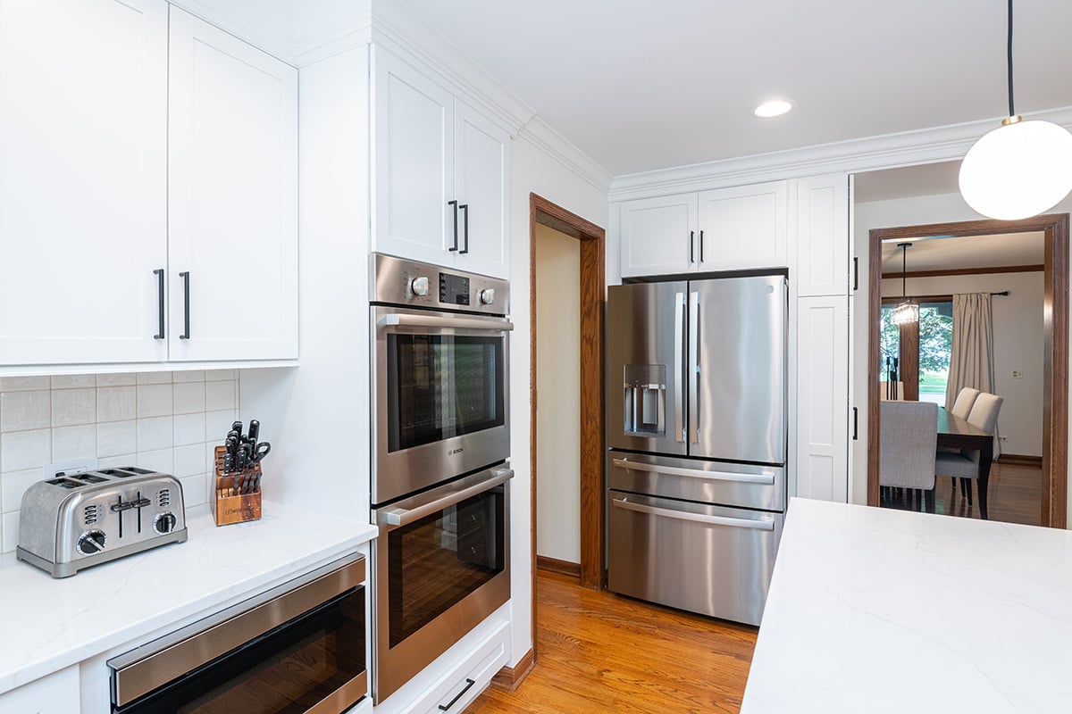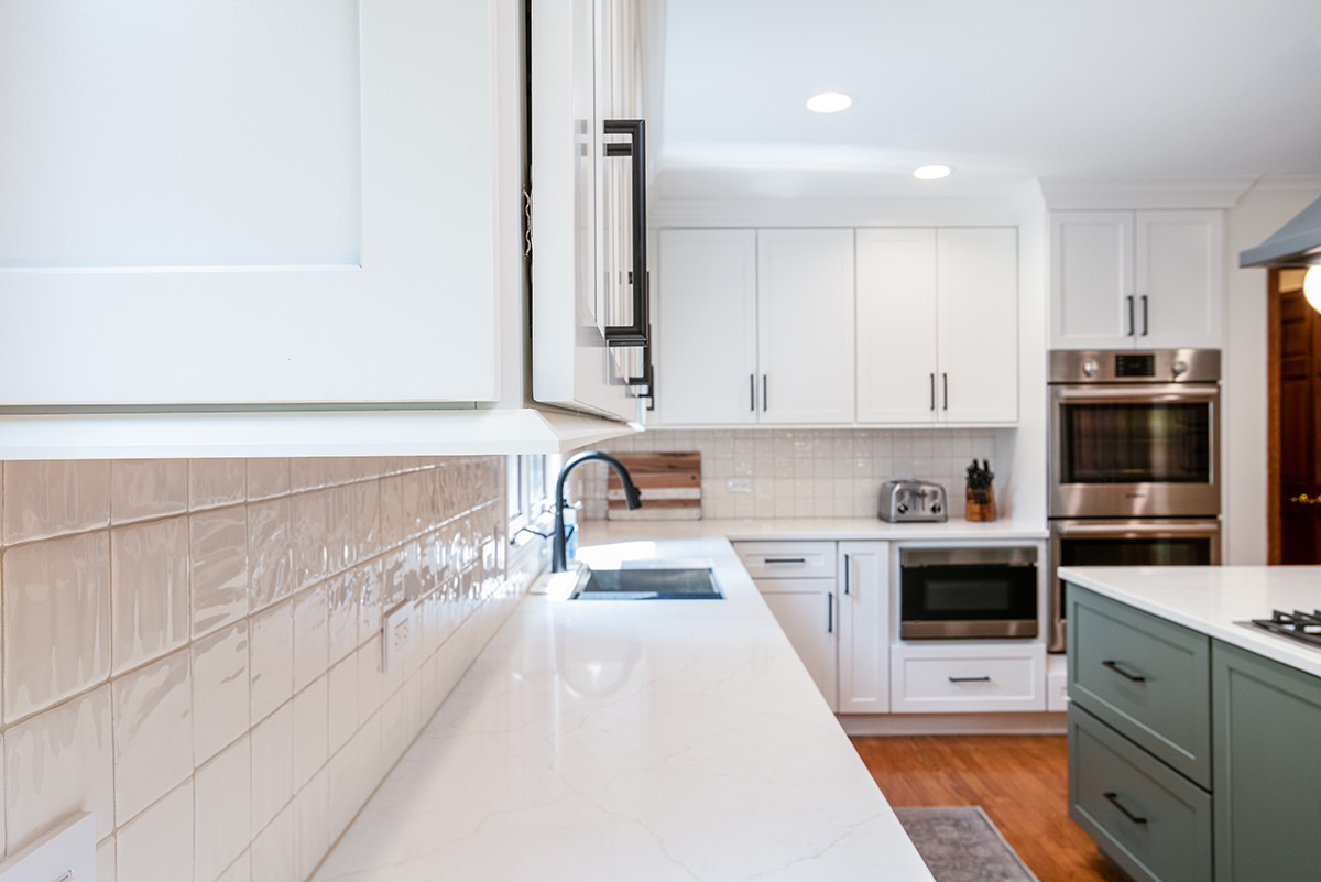 Our Libertyville family quickly realized the kitchen layout wasn't working for them after moving into their new home . The space featured an awkwardly shaped island with little prep space, outdated finishes, and a low-hanging hood that posed a real challenge—especially for the tall homeowner. Our BDS team transformed the kitchen by using the newer appliances that come with the home and incorporating a larger gas cooktop and an under-counter microwave to free up workspace. The redesigned island gives our homeowners a larger, more functional island which features a beautiful accent color for a fun, modern touch. The BDS team removed the existing soffits and brought in new cabinetry which went up to the ceiling. This created more storage and a clean, finished look. A workstation sink was added for better workflow, and the old desk area was converted into a stylish coffee station. Bright, light finishes and improved lighting makes the new space feel open and inviting—combining practicality with personality in every detail.