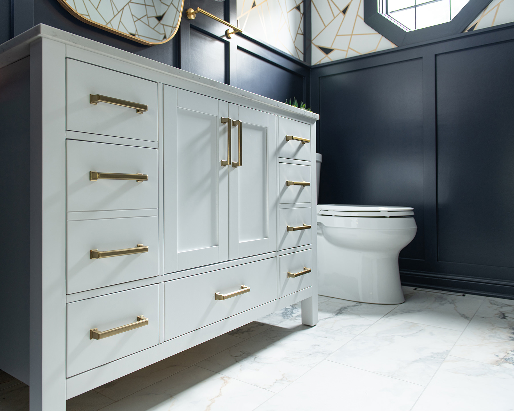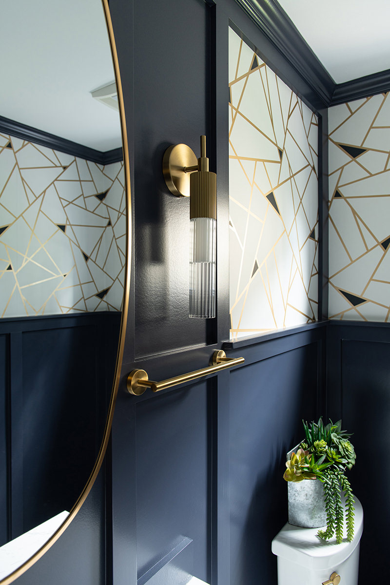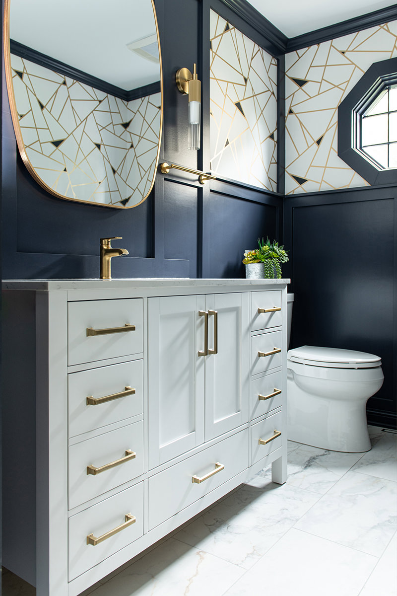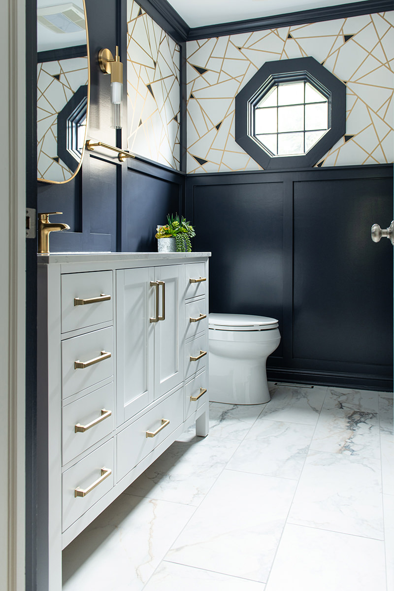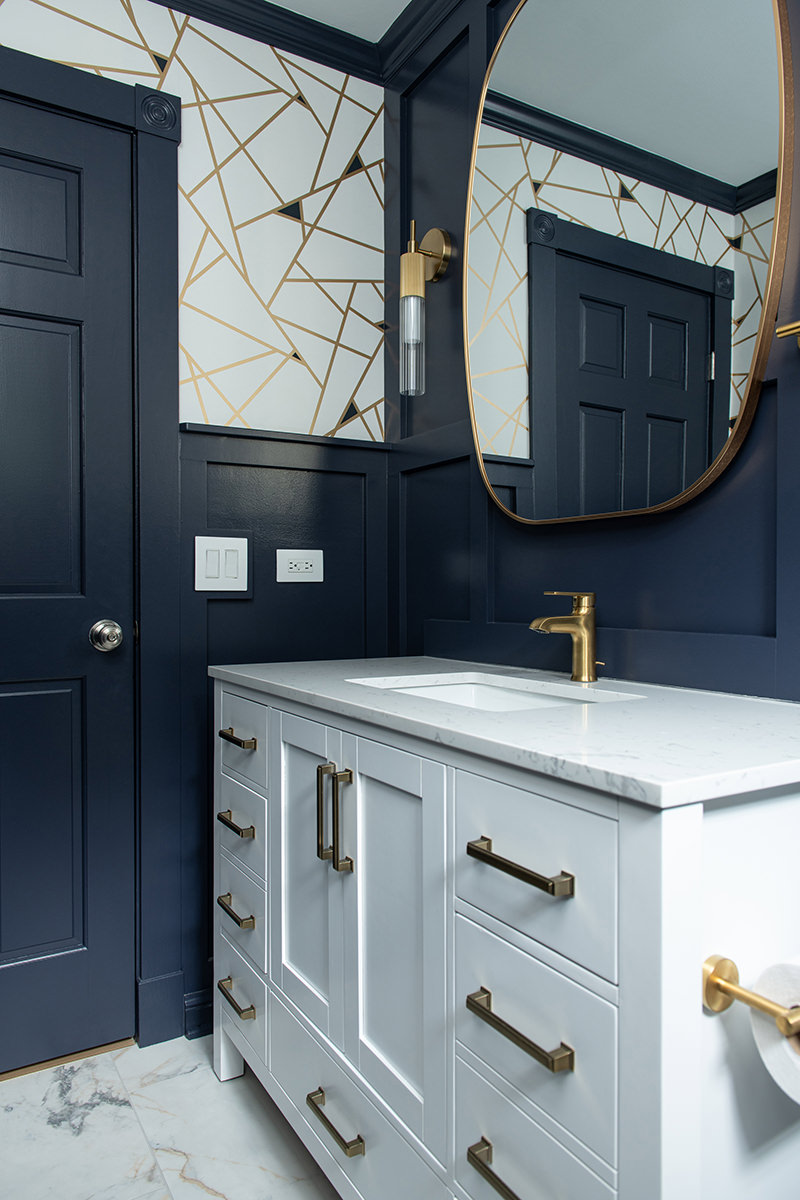 The Libertyville powder room was an outdated space that needed a little help to bring the design level up. The BDS team replaced the original basic details, and upgraded the space to match the style of the rest of the home. Designer wallpaper pops the upper section of the walls while the bottom is a rich dark blue wainscoting. The bright white finish of the vanity and countertops along with the stunning new tile floor keep the space feeling open and contrast the dark walls. A new mirror and lighting with gold finishes complete this incredible powder room that our homeowners are happy to share with their guests.