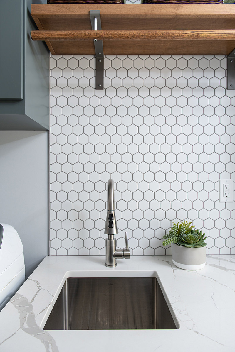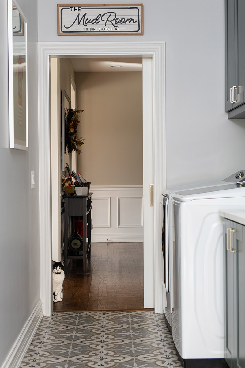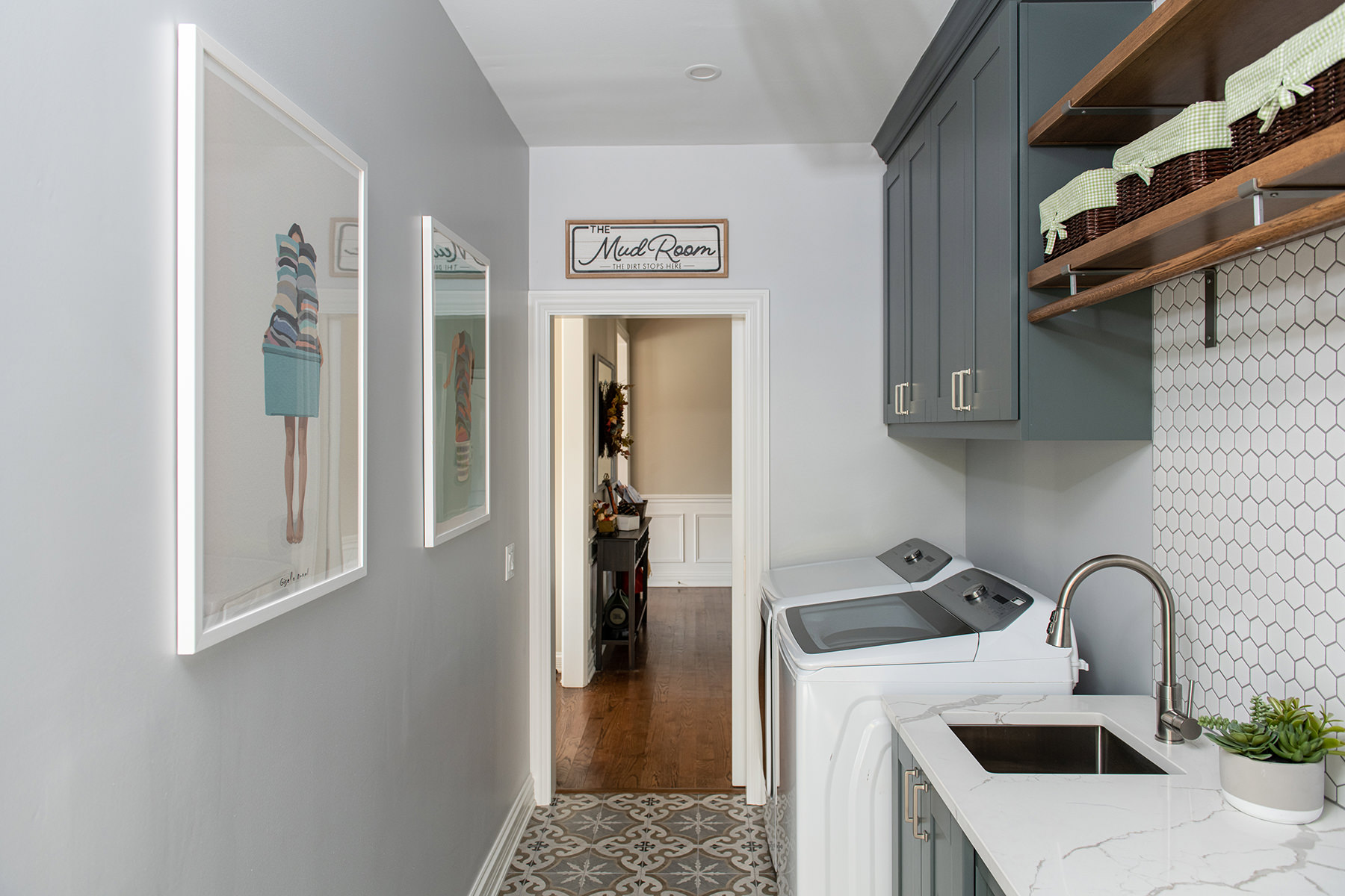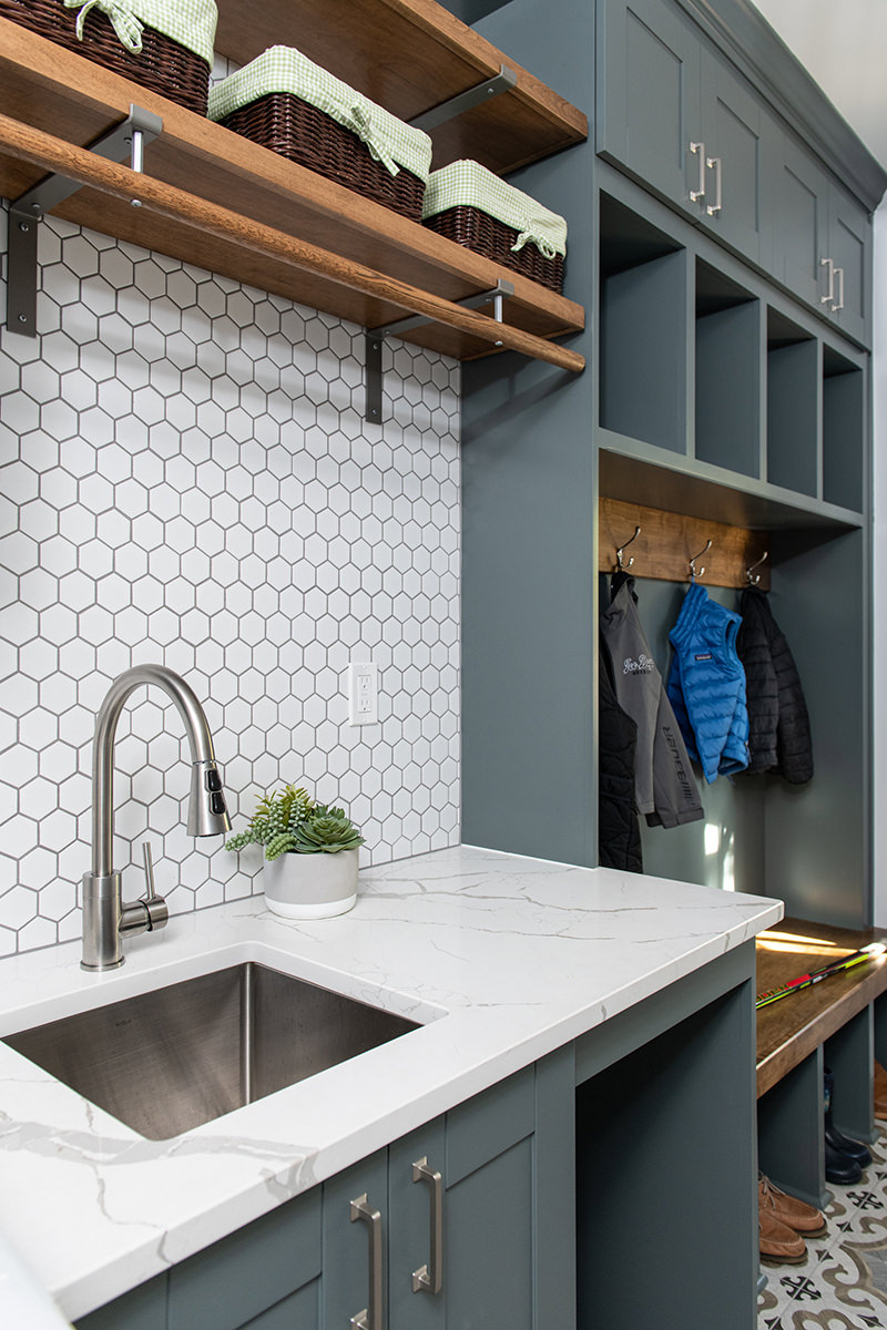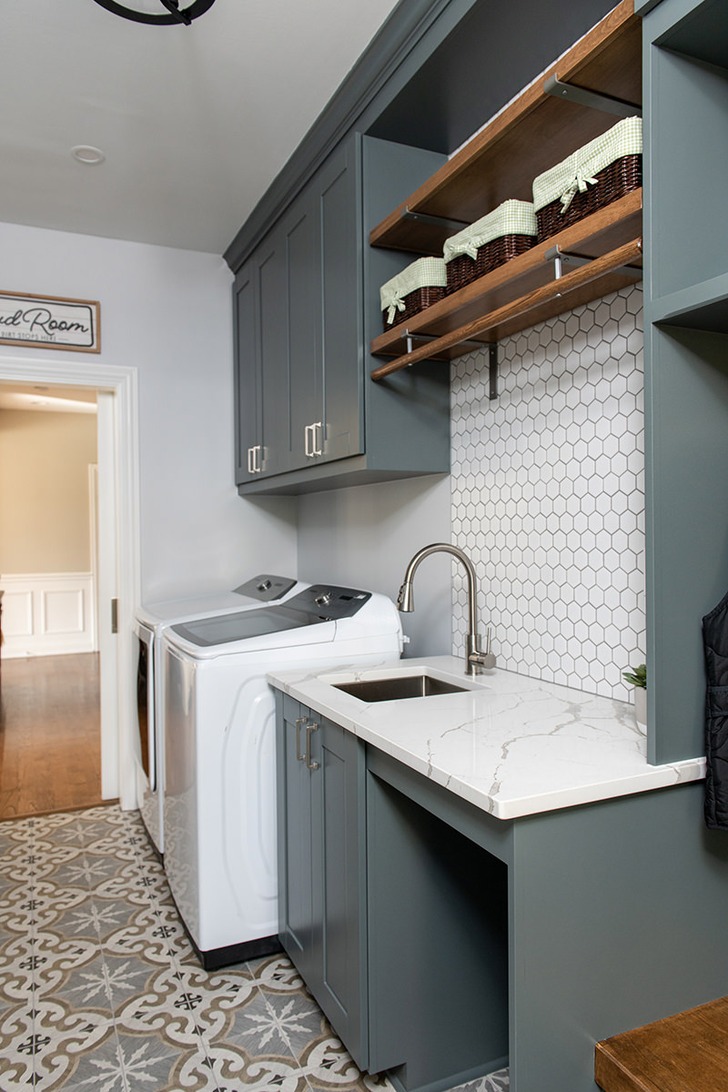 Oftentimes homes have the right space needed, but the layout and function of the current space just doesn’t work. Our homeowners in Libertyville allowed us to freshen up their laundry and mudroom space which was at the time just not functioning like the family needed. The BDS Team created more functional entrances to this mudroom with a new covered external entrance from the driveway as well as a redesigned garage entrance and barn door entrance to the hall to avoid taking up space. Custom built mudroom cabinets and cubbies created the perfectly organized space to keep messes and sports gear all hidden. A stunning pop of color and pattern tile floor keeps the space fun and gorgeous!