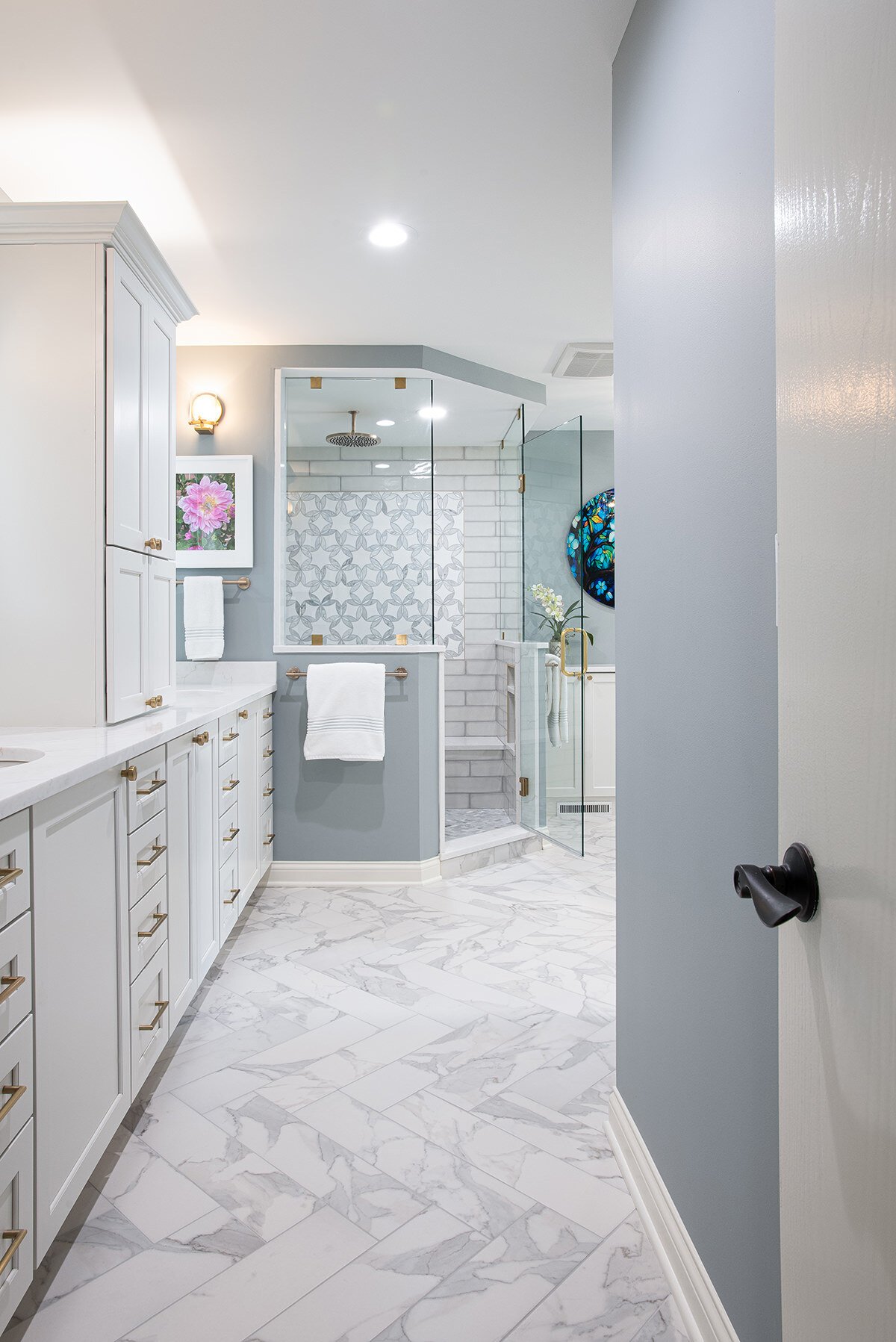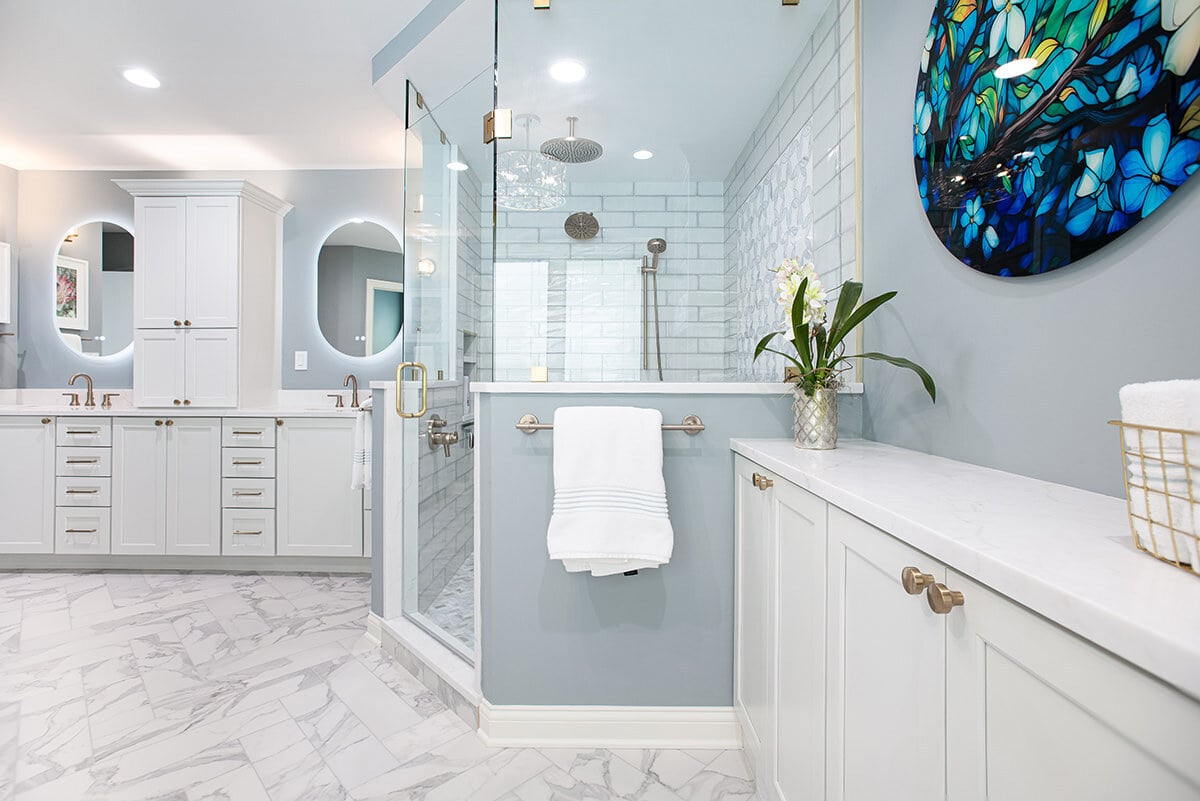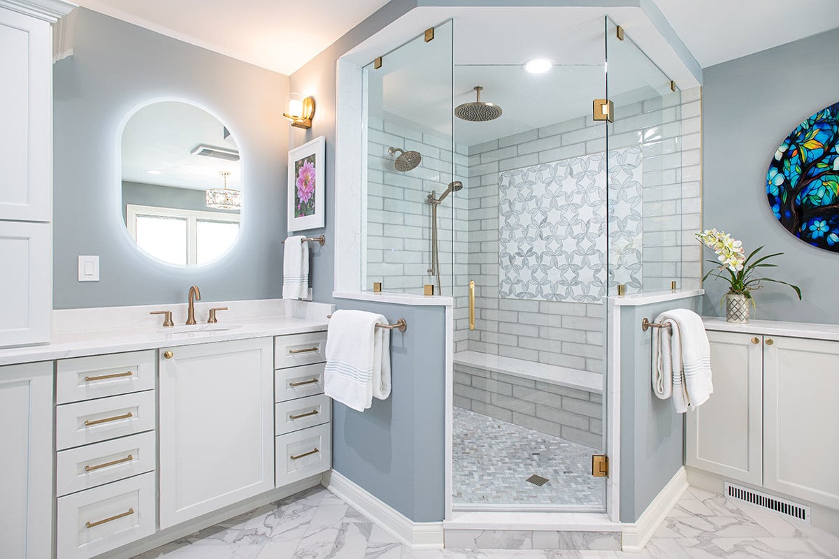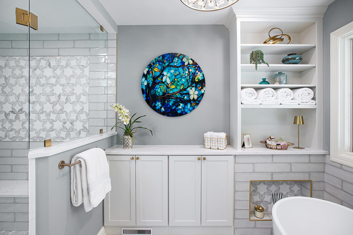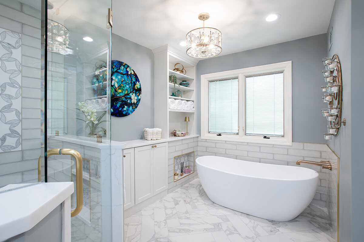 This Northbrook remodel project transformed a dated primary bathroom into a modern, spa-like retreat and gave the first-floor powder room a stylish refresh. The primary bathroom underwent a full renovation, replacing the oversized jacuzzi tub with a sleek, proportional soaker tub and enlarging the shower with luxurious finishes and a bench for added comfort. Storage was optimized with extended cabinetry, and our BDS team added custom inset medicine cabinets. Elegant tile work adds a beautiful design that ties the space together. Heated tile floors, a heater fan, backlit mirrors, and wall sconces offer both functionality and ambiance, while a stunning herringbone floor and curated lighting elevate the space. A special area was created to highlight the customer’s stained art focal point, adding a personal touch. Our BDS team also updated a powder room with new finishes and a stunning wallpaper to make this room feel sophisticated and charming.