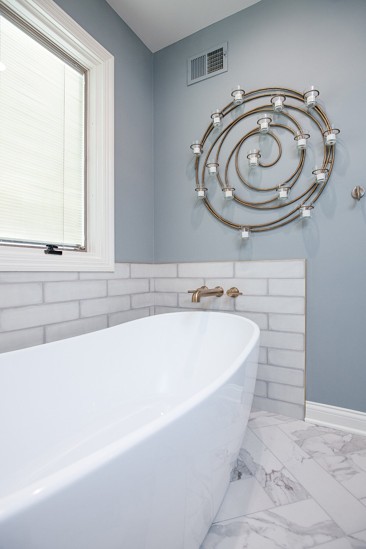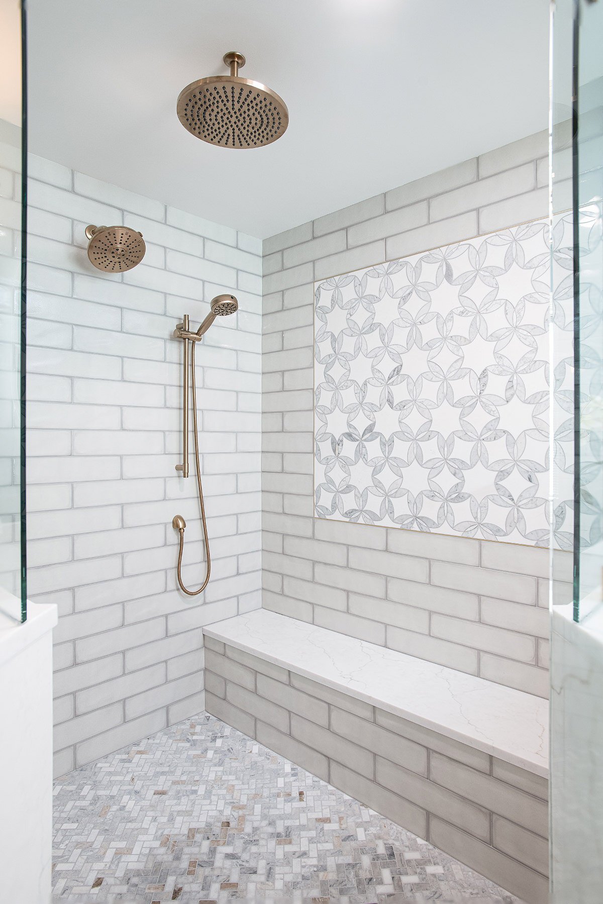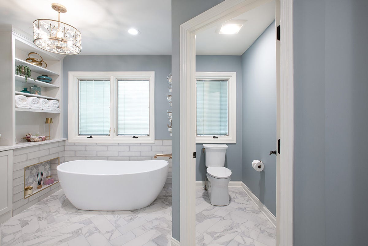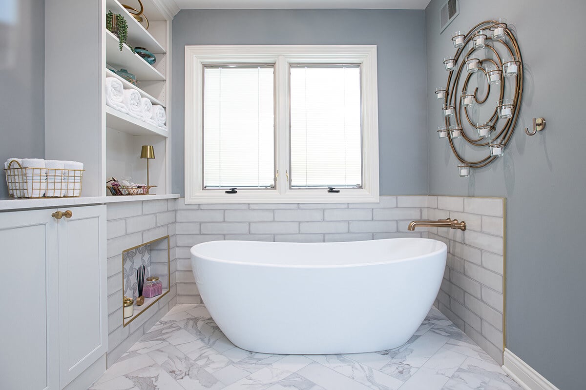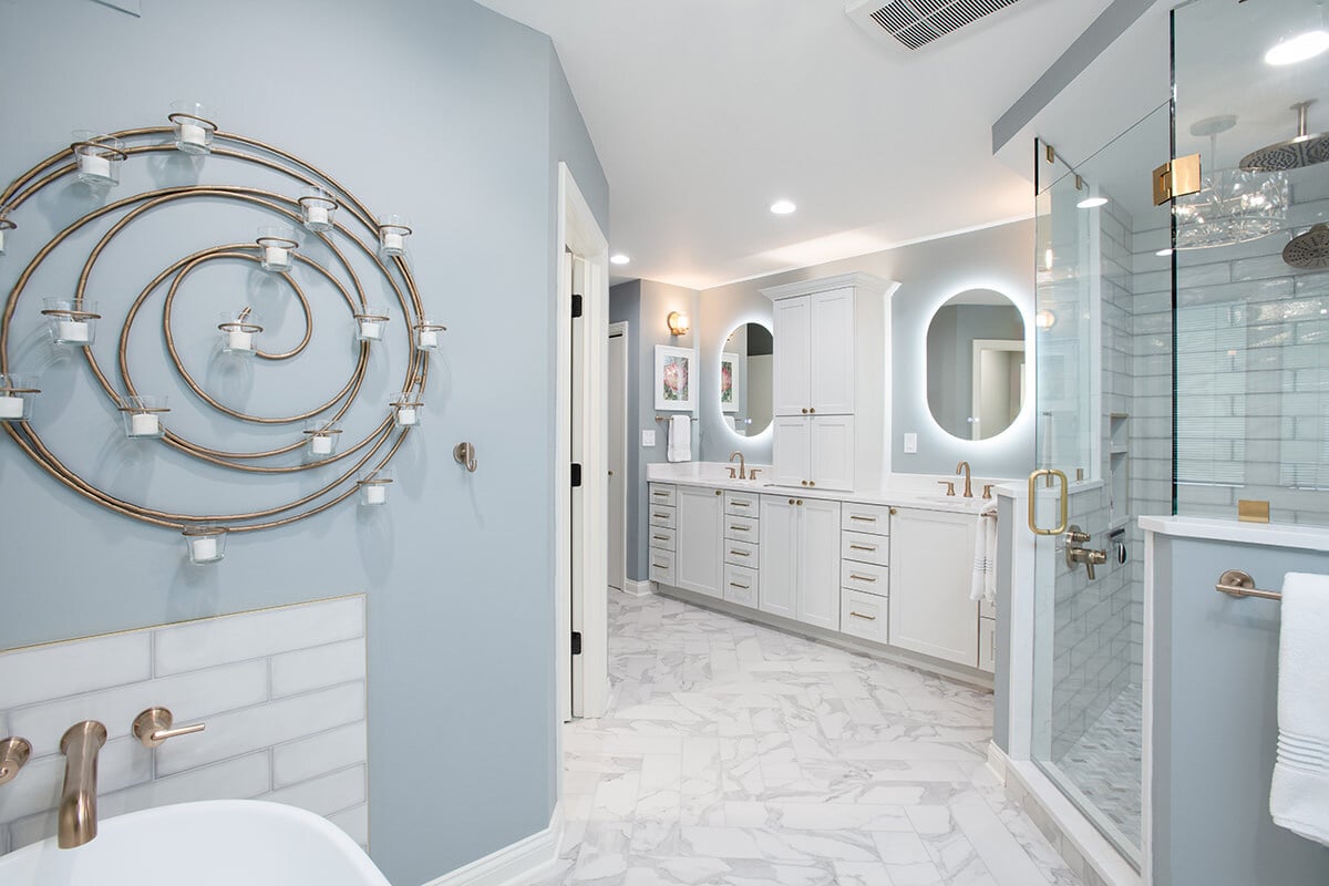 This Northbrook remodel project transformed a dated primary bathroom into a modern, spa-like retreat and gave the first-floor powder room a stylish refresh. The primary bathroom underwent a full renovation, replacing the oversized jacuzzi tub with a sleek, proportional soaker tub and enlarging the shower with luxurious finishes and a bench for added comfort. Storage was optimized with extended cabinetry, and our BDS team added custom inset medicine cabinets. Elegant tile work adds a beautiful design that ties the space together. Heated tile floors, a heater fan, backlit mirrors, and wall sconces offer both functionality and ambiance, while a stunning herringbone floor and curated lighting elevate the space. A special area was created to highlight the customer’s stained art focal point, adding a personal touch. Our BDS team also updated a powder room with new finishes and a stunning wallpaper to make this room feel sophisticated and charming.