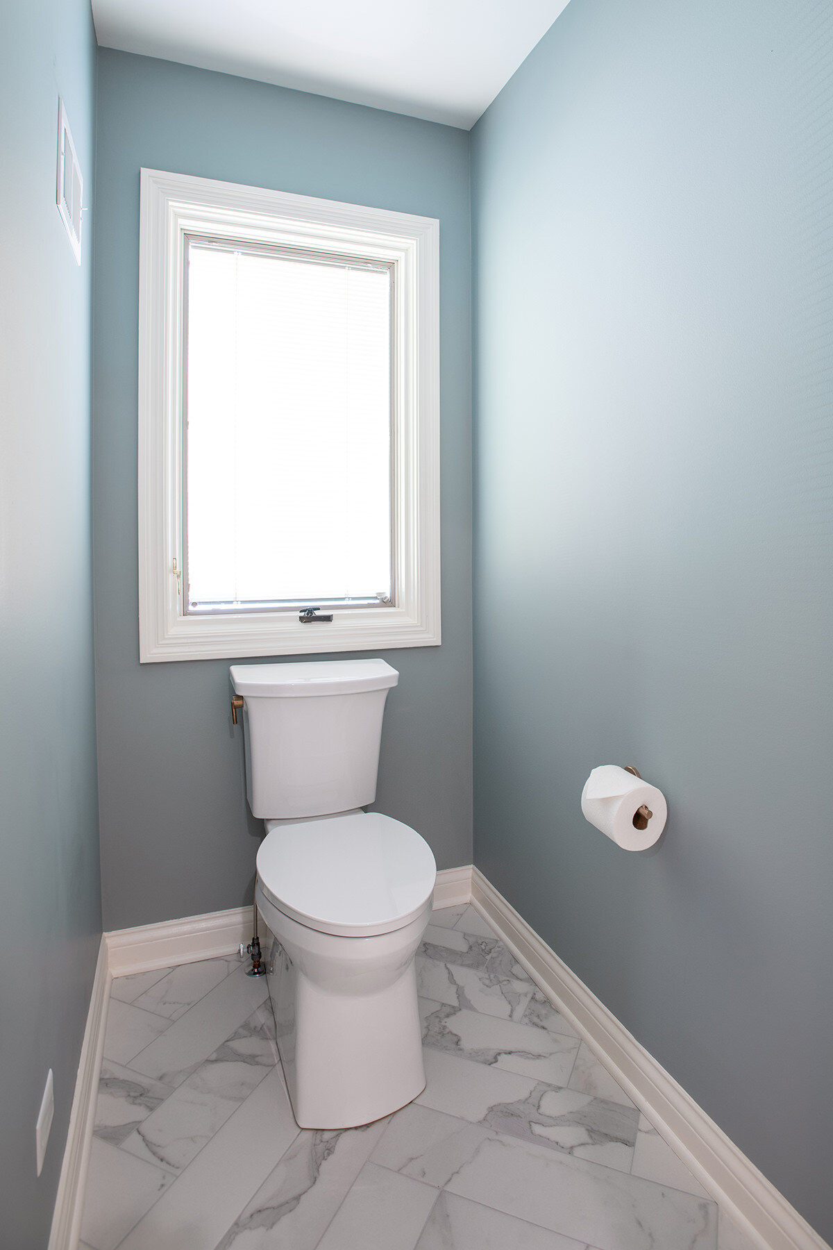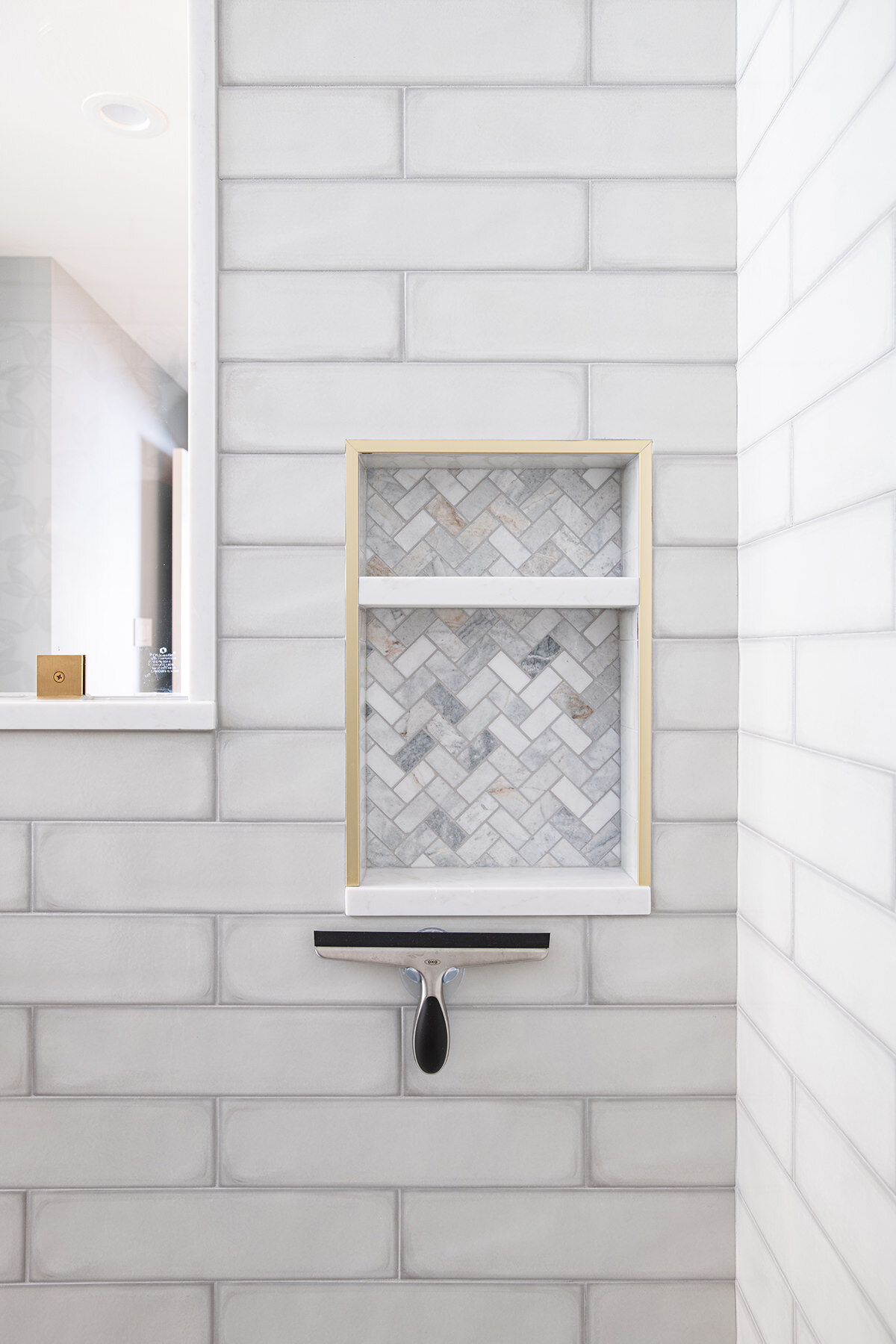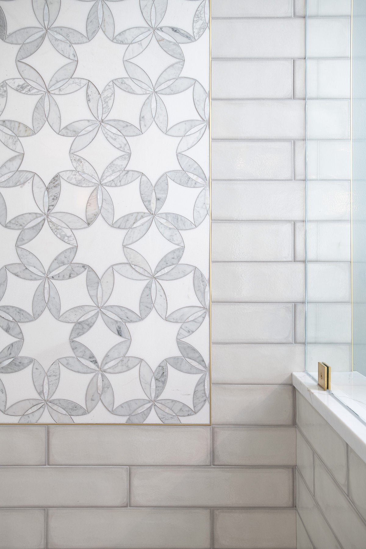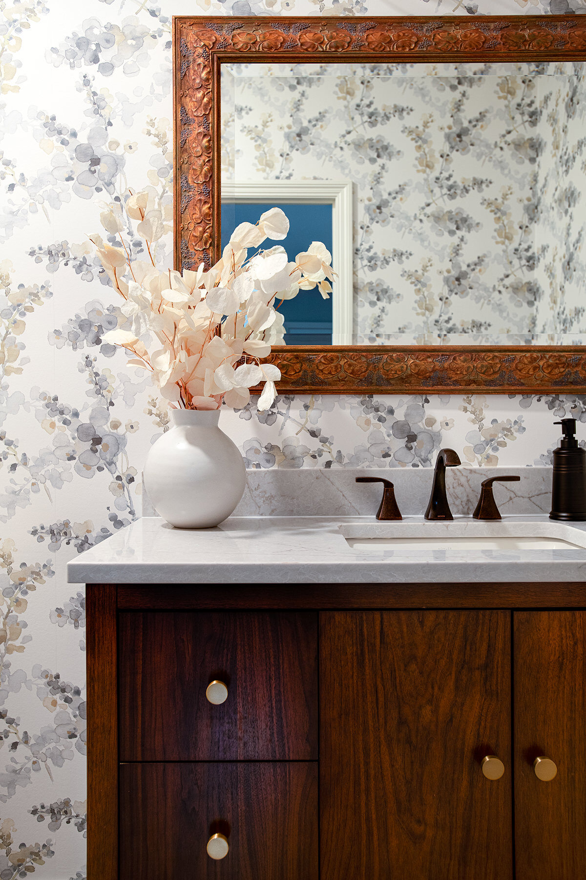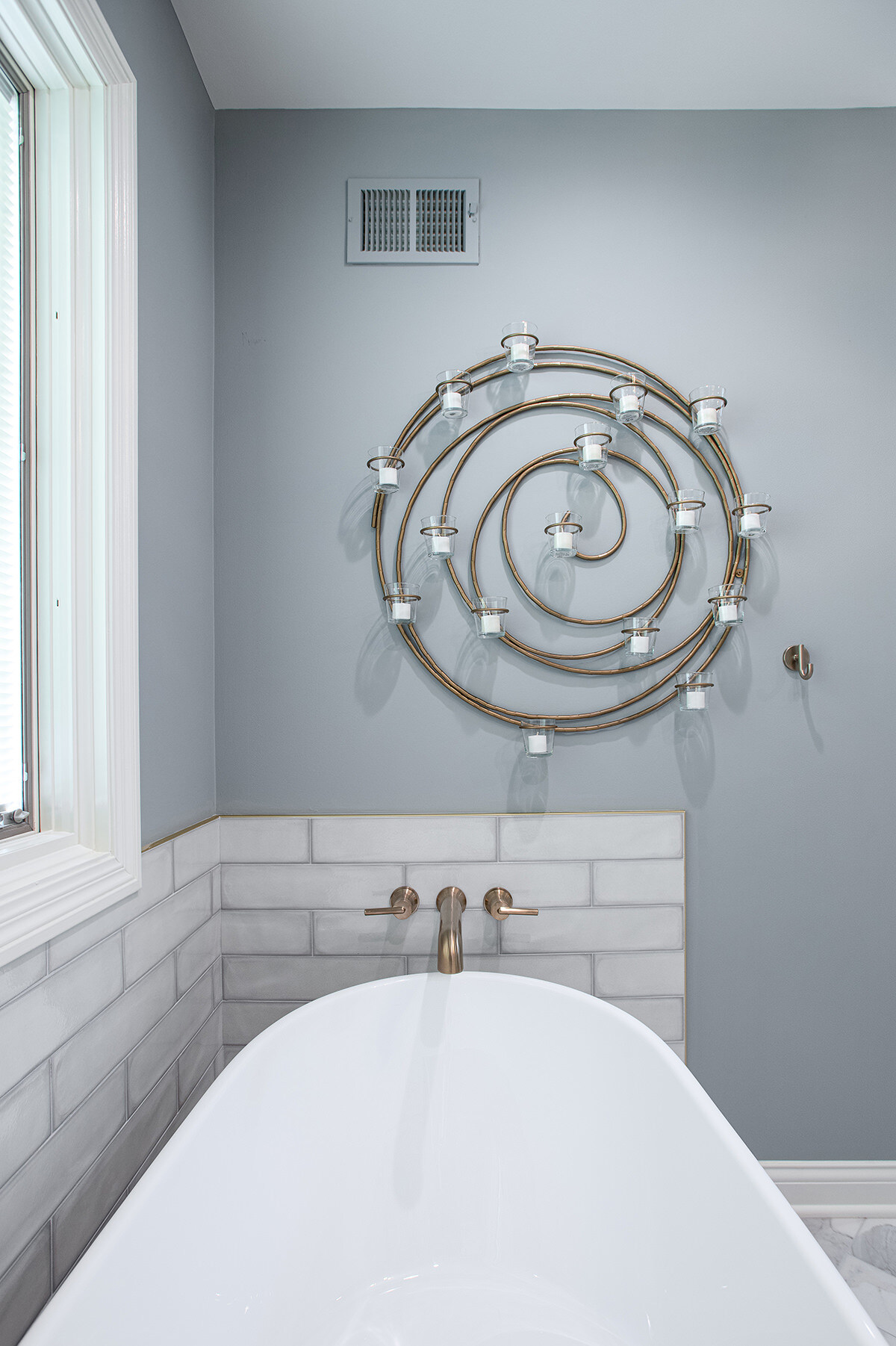 This Northbrook remodel project transformed a dated primary bathroom into a modern, spa-like retreat and gave the first-floor powder room a stylish refresh. The primary bathroom underwent a full renovation, replacing the oversized jacuzzi tub with a sleek, proportional soaker tub and enlarging the shower with luxurious finishes and a bench for added comfort. Storage was optimized with extended cabinetry, and our BDS team added custom inset medicine cabinets. Elegant tile work adds a beautiful design that ties the space together. Heated tile floors, a heater fan, backlit mirrors, and wall sconces offer both functionality and ambiance, while a stunning herringbone floor and curated lighting elevate the space. A special area was created to highlight the customer’s stained art focal point, adding a personal touch. Our BDS team also updated a powder room with new finishes and a stunning wallpaper to make this room feel sophisticated and charming.