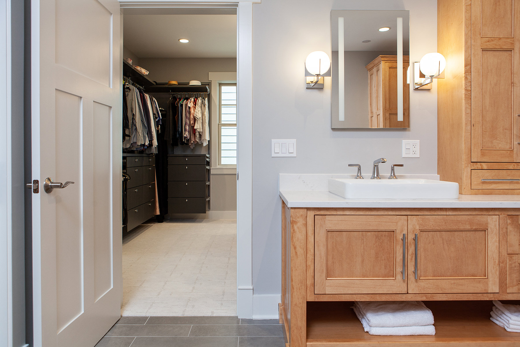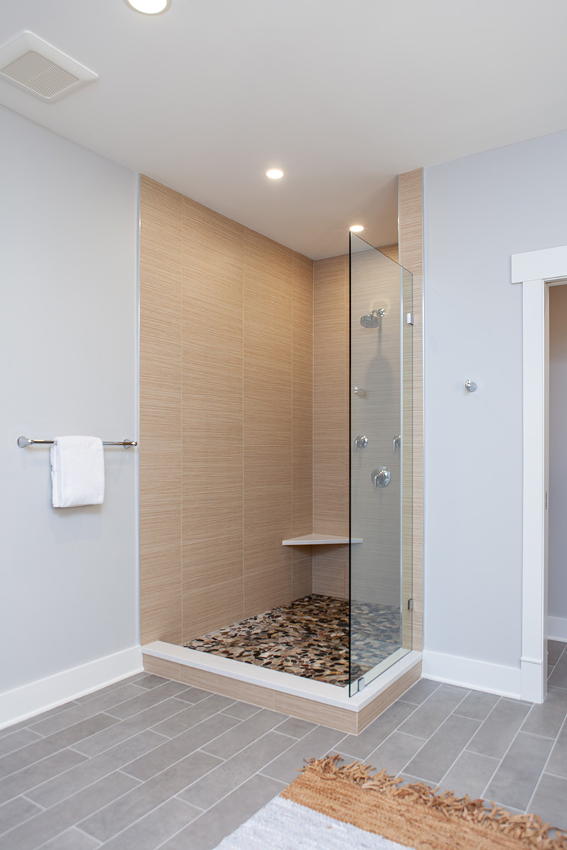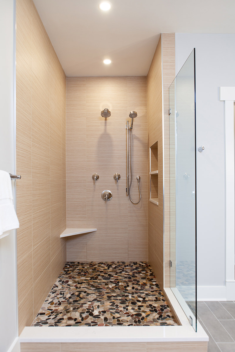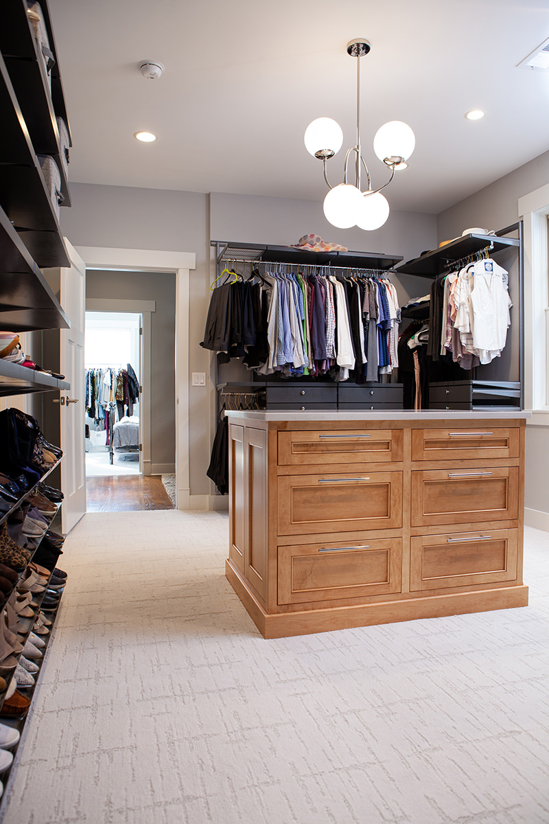 Our Libertyville homeowners wanted to make their primary suite personalized to fit their needs. The BDS team took a first floor dining room that was a two-story space and created a dreamy closet that our homeowners were envisioning. We framed in the ceiling above the dining space to create the large primary closet and also allow access to the primary bath from the closet. The bathroom was gutted and completely opened up to provide a more functional space. Custom natural wood cabinetry and luxurious amenities were added. The team designed a large open shower room and of course this fresh remodel is full of storage for our homeowners to stay organized.