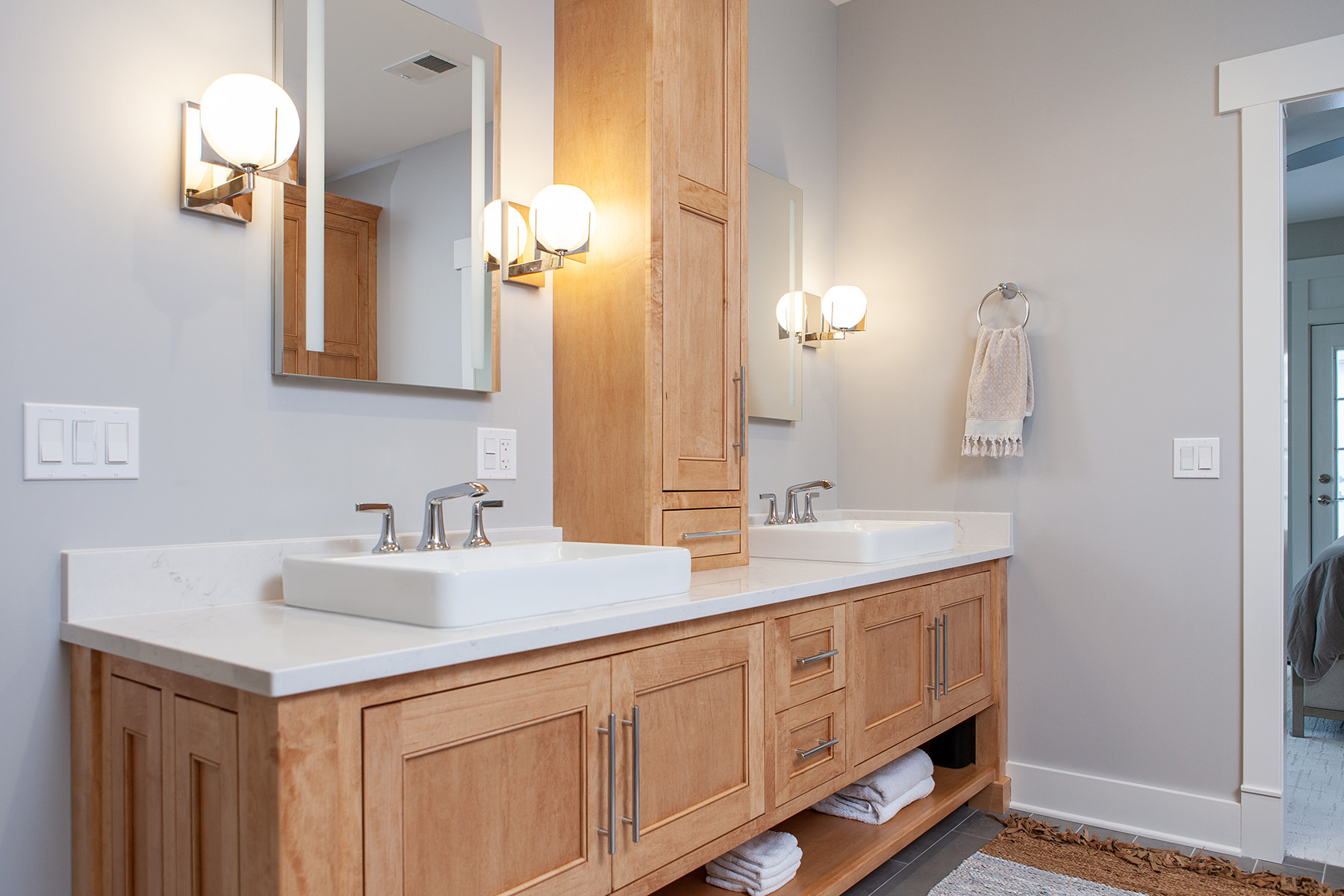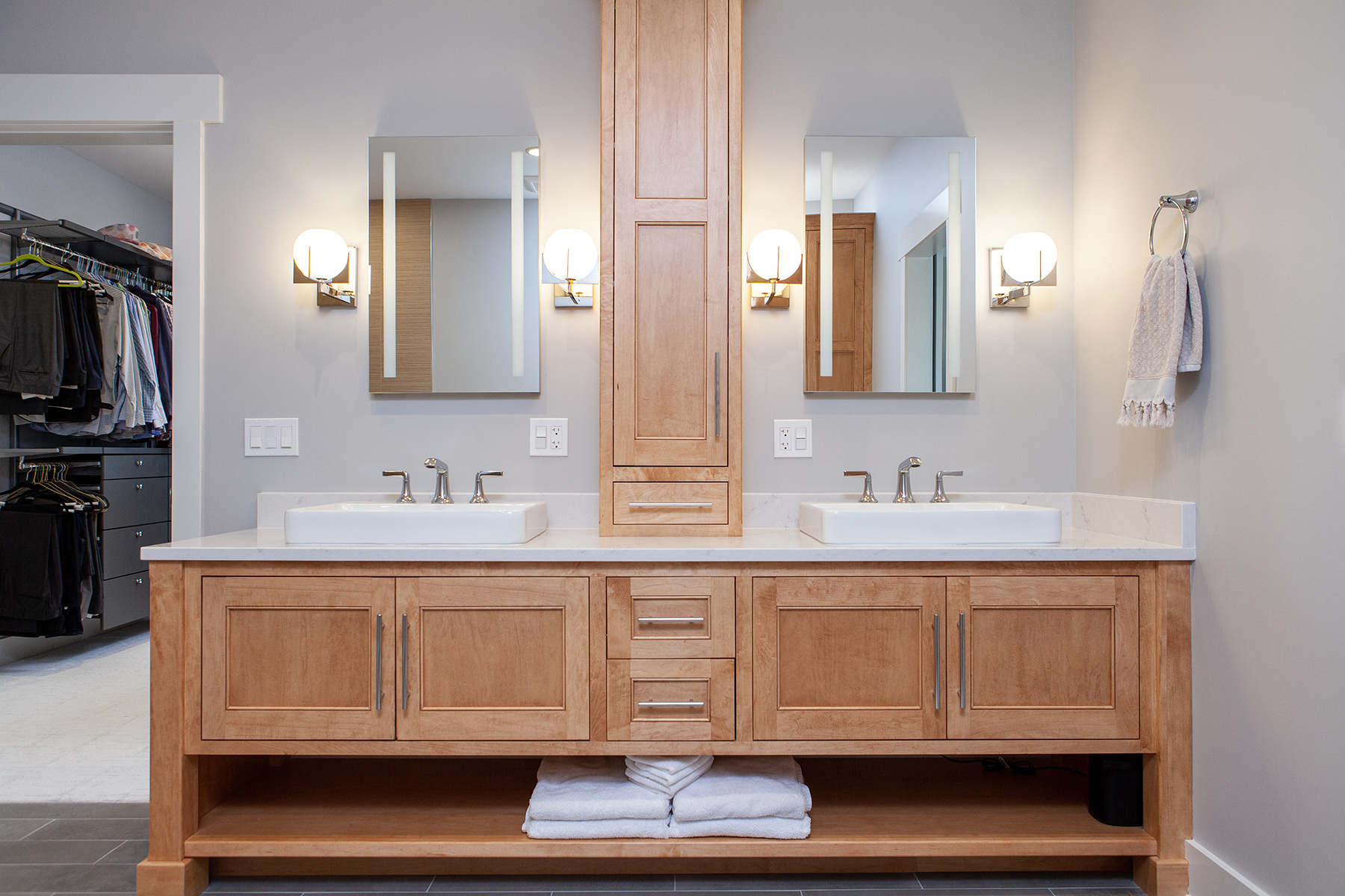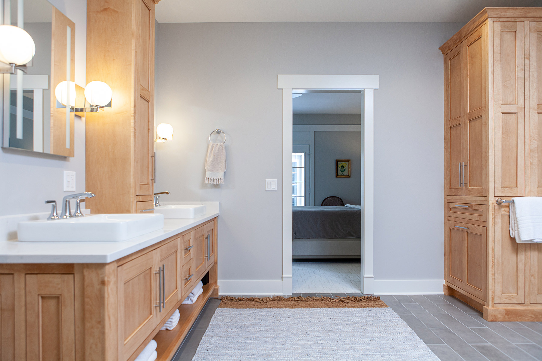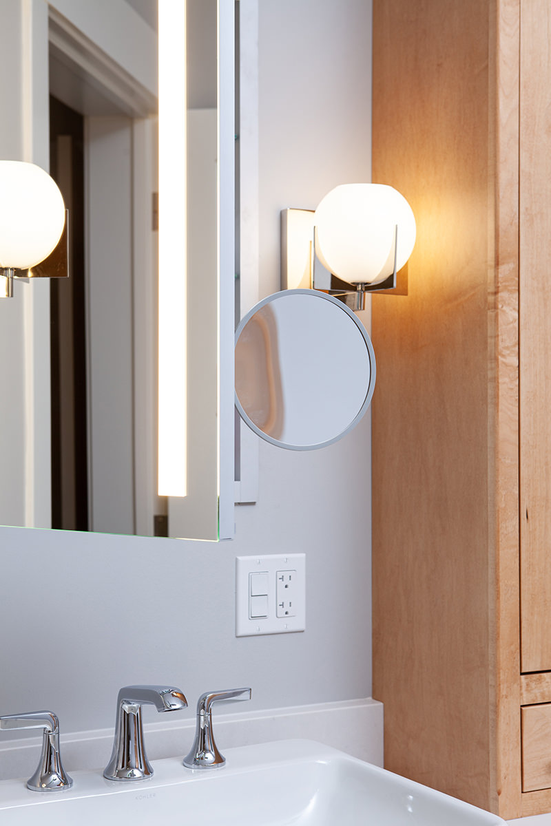 Our Libertyville homeowners wanted to make their primary suite personalized to fit their needs. The BDS team took a first floor dining room that was a two-story space and created a dreamy closet that our homeowners were envisioning. We framed in the ceiling above the dining space to create the large primary closet and also allow access to the primary bath from the closet. The bathroom was gutted and completely opened up to provide a more functional space. Custom natural wood cabinetry and luxurious amenities were added. The team designed a large open shower room and of course this fresh remodel is full of storage for our homeowners to stay organized.