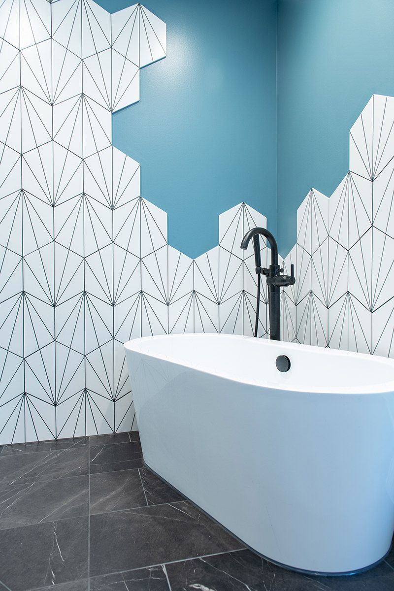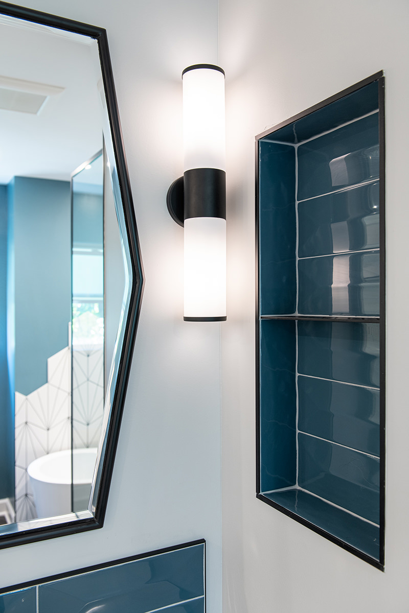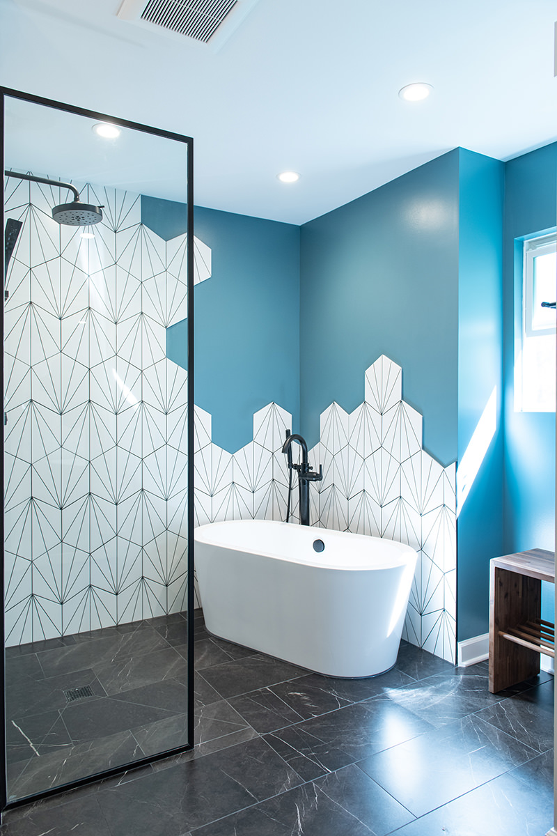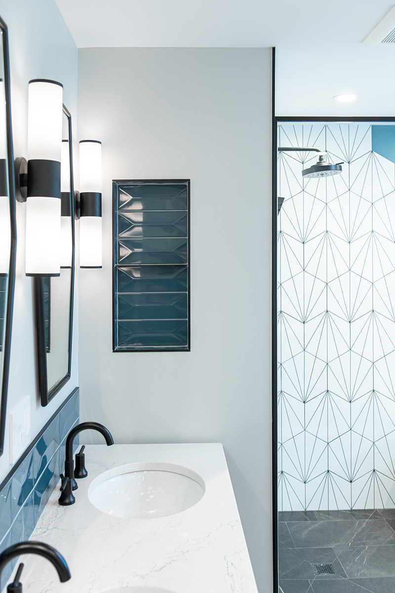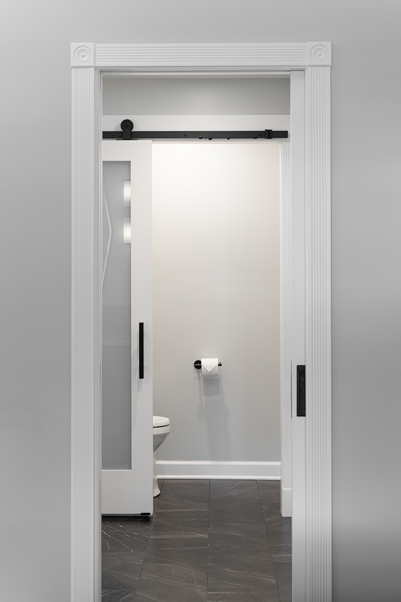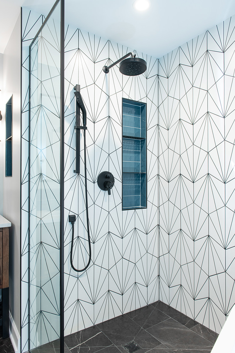 Outdated and in need of maintenance, this Third Lake bathroom quickly transformed into a modern stylish primary bath for our homeowners. One of the top items on our homeowner’s wish list included a shower and soaker tub. Since space was limited, it required our BDS team to combine the bath and closet space into one entirely new area. An incredible geometric tile wall which starts in the shower and cascades down the wall into the tub area was added to protect the walls from splashing. We also slightly raised the floor to create a curb-less walk-in shower area. For the water closet, we added this stunning barn door with privacy glass to keep this bathroom and the water closet from feeling too dark. A statement piece as the vanity and mirrored doors on the new closet space completed this gorgeous new space.