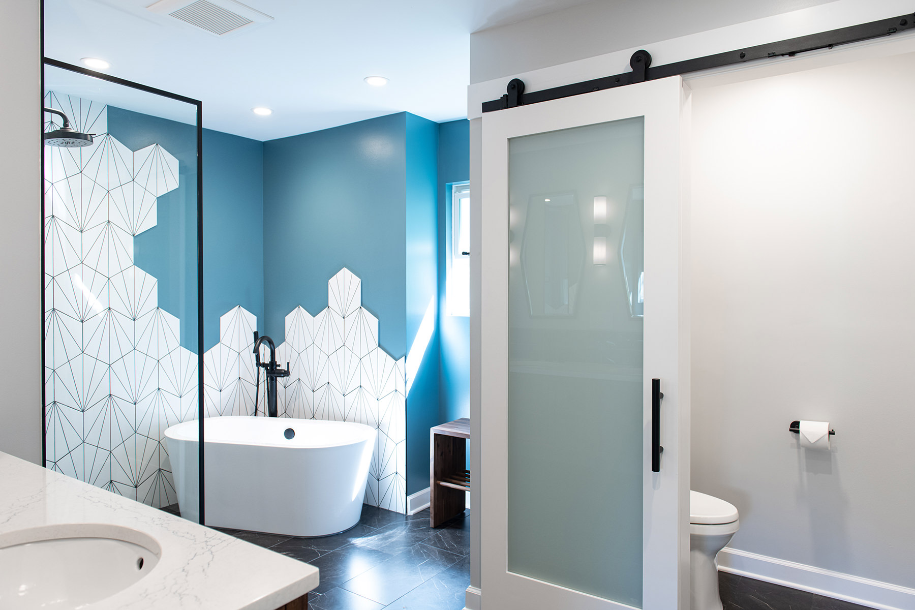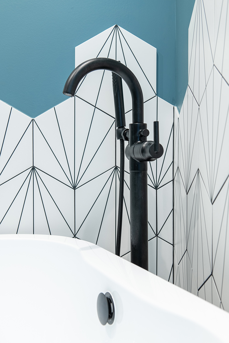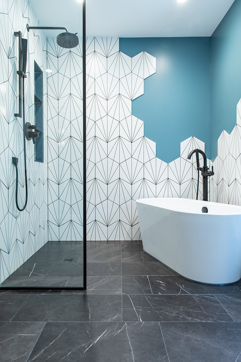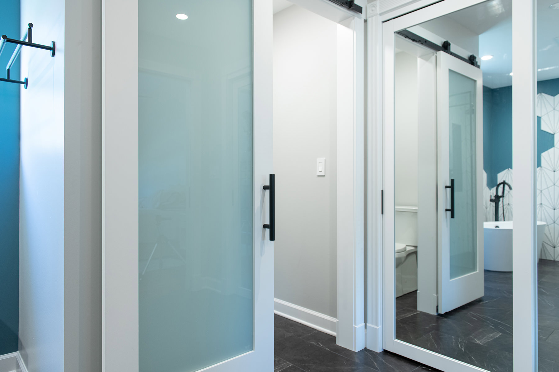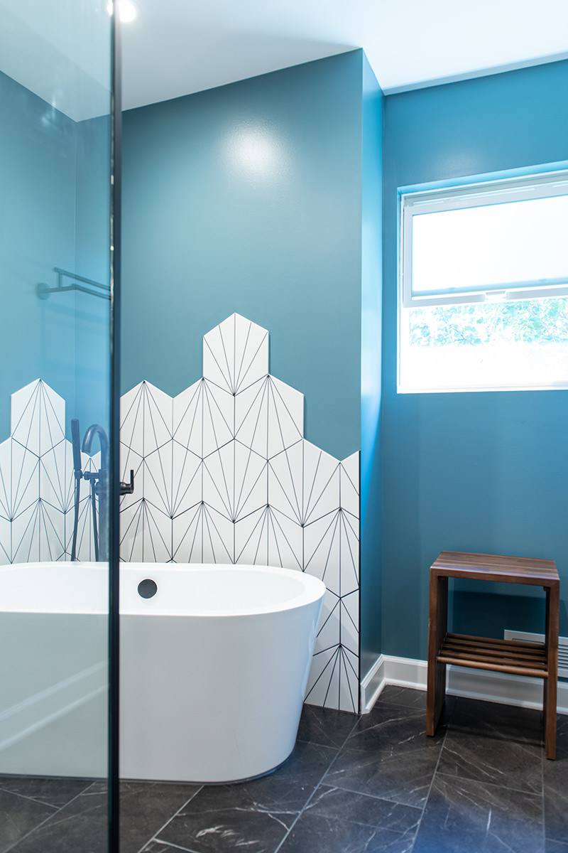 Outdated and in need of maintenance, this Third Lake bathroom quickly transformed into a modern stylish primary bath for our homeowners. One of the top items on our homeowner’s wish list included a shower and soaker tub. Since space was limited, it required our BDS team to combine the bath and closet space into one entirely new area. An incredible geometric tile wall which starts in the shower and cascades down the wall into the tub area was added to protect the walls from splashing. We also slightly raised the floor to create a curb-less walk-in shower area. For the water closet, we added this stunning barn door with privacy glass to keep this bathroom and the water closet from feeling too dark. A statement piece as the vanity and mirrored doors on the new closet space completed this gorgeous new space.