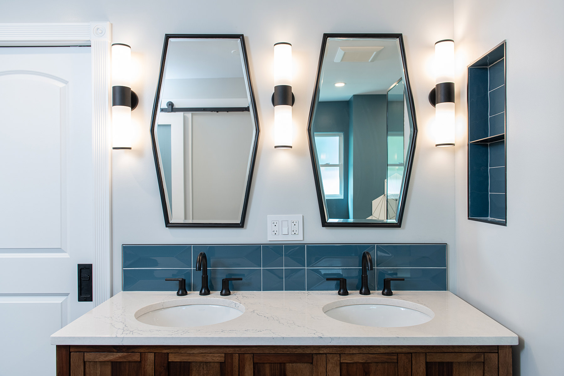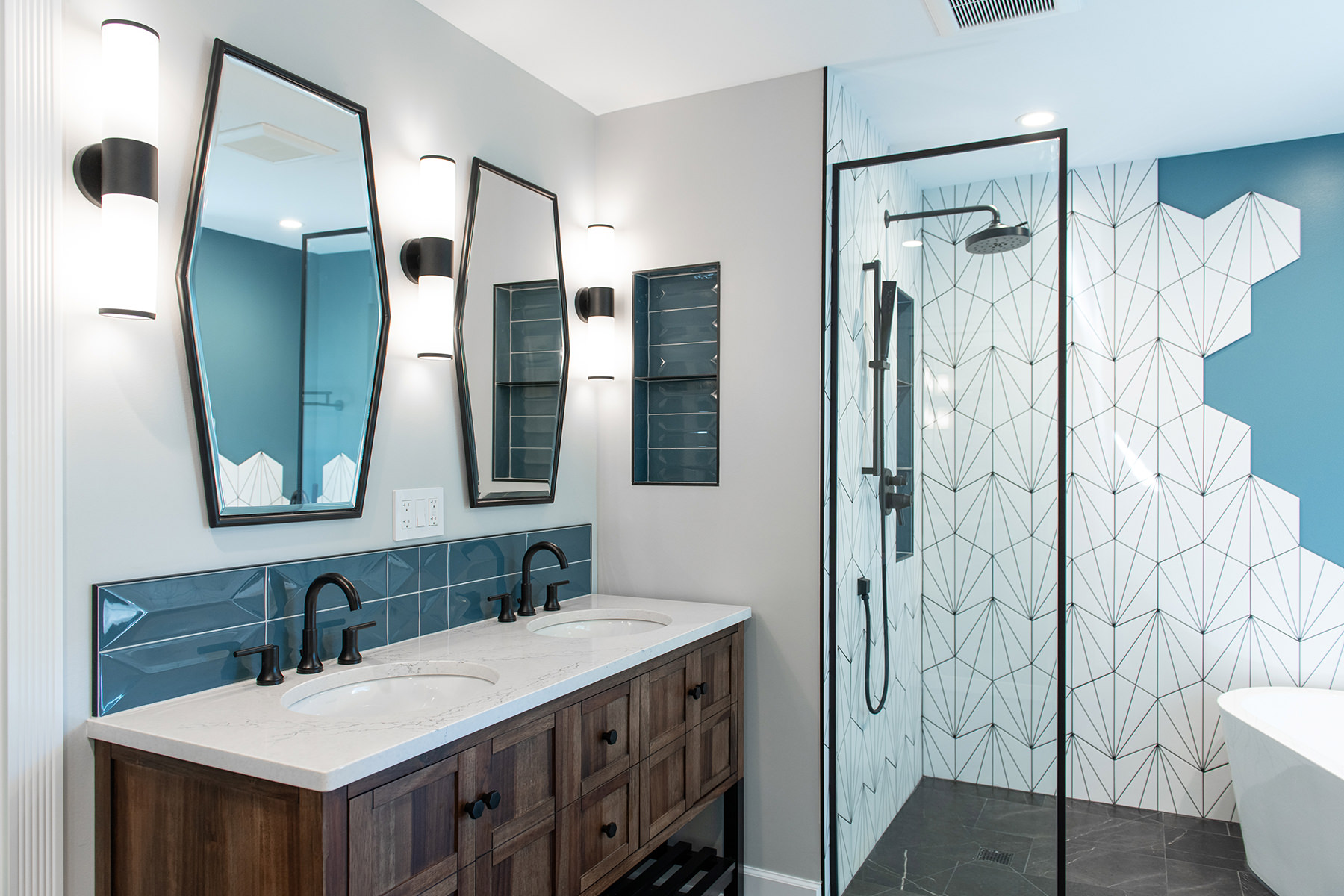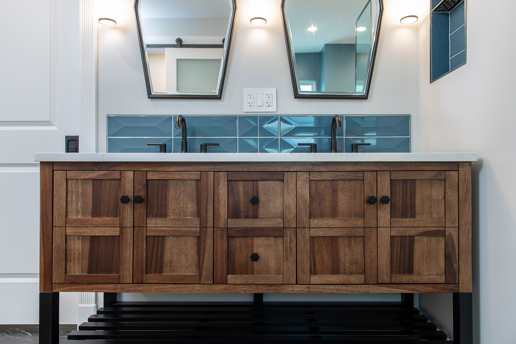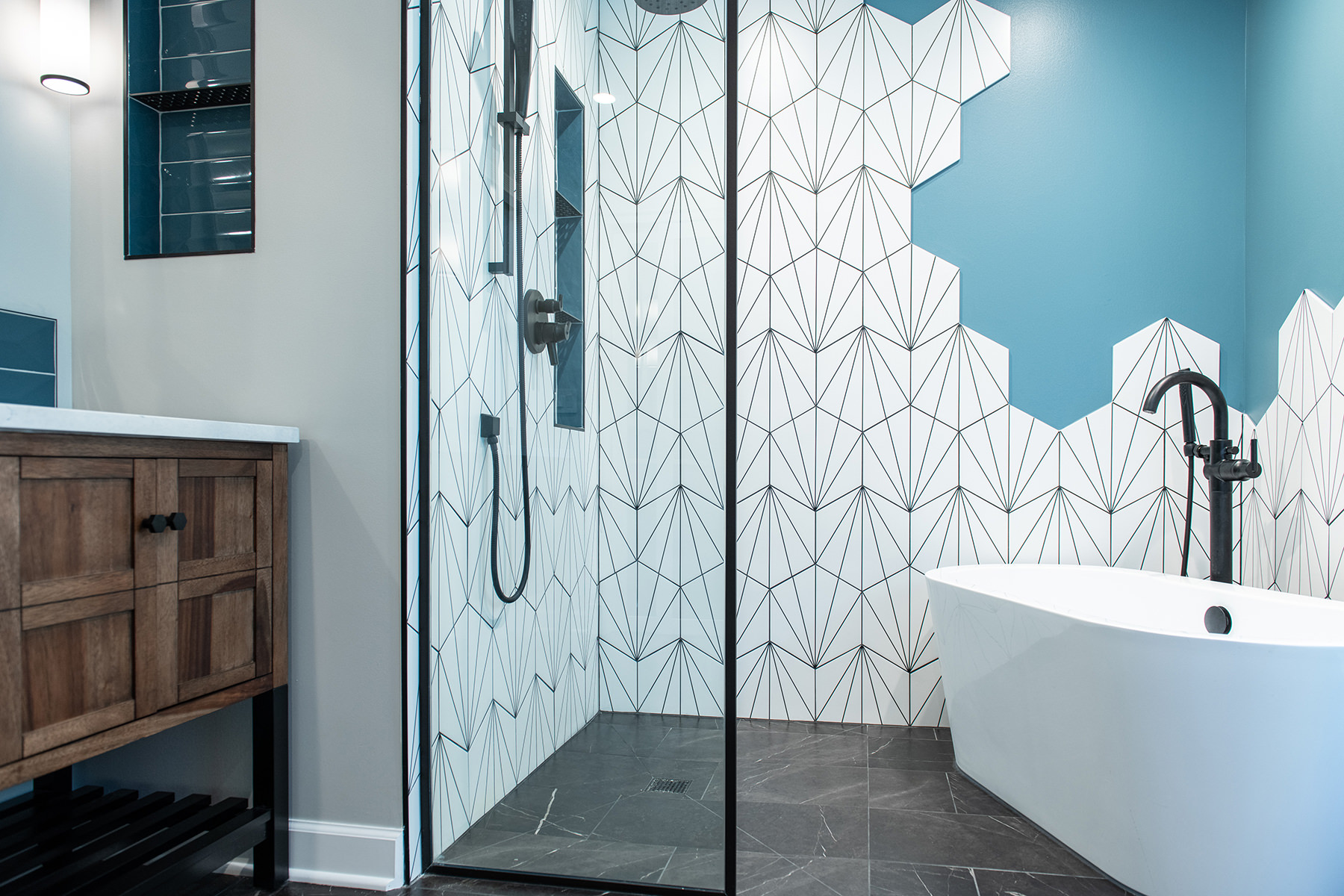 Outdated and in need of maintenance, this Third Lake bathroom quickly transformed into a modern stylish primary bath for our homeowners. One of the top items on our homeowner’s wish list included a shower and soaker tub. Since space was limited, it required our BDS team to combine the bath and closet space into one entirely new area. An incredible geometric tile wall which starts in the shower and cascades down the wall into the tub area was added to protect the walls from splashing. We also slightly raised the floor to create a curb-less walk-in shower area. For the water closet, we added this stunning barn door with privacy glass to keep this bathroom and the water closet from feeling too dark. A statement piece as the vanity and mirrored doors on the new closet space completed this gorgeous new space.