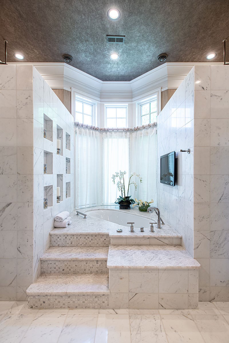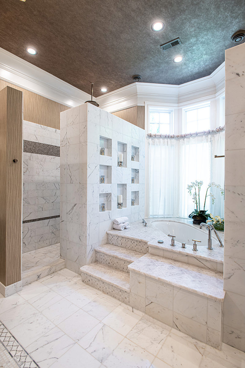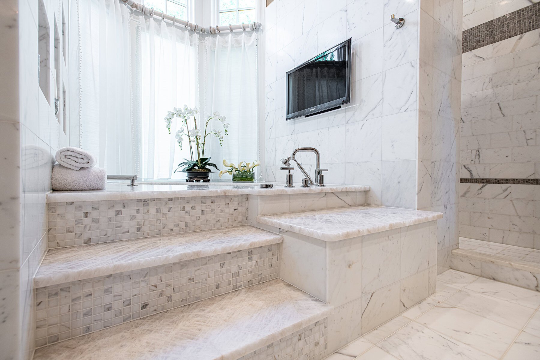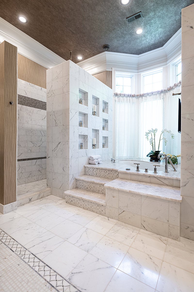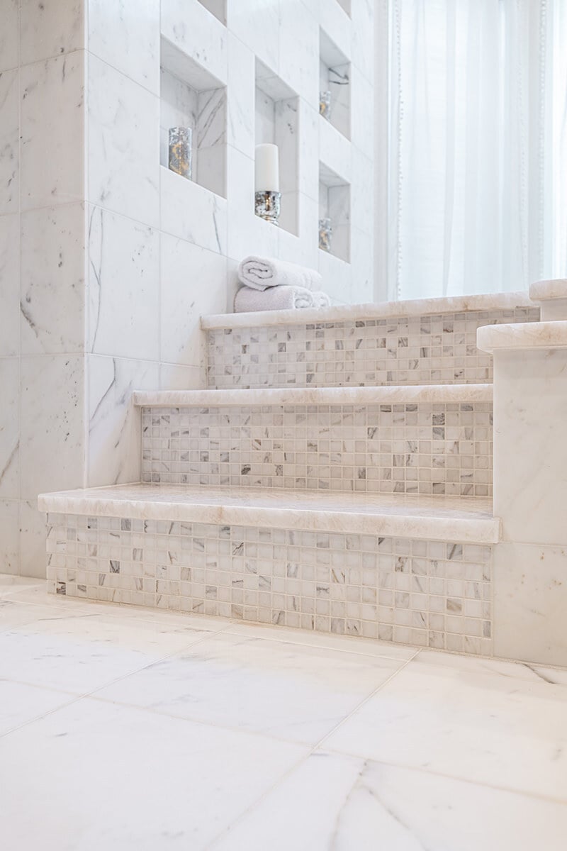 For the Winnetka primary bathroom tub replacement, we addressed a leaking and outdated tub that was too large for comfort and unsafe to use. We carefully investigated materials to blend with the original 2006 installation and selected a proportionally sized tub for one person. We reused the luxury faucet and customized a tub drain control for accessibility. To enhance functionality, ease of use, and safety, we added steps and a bench.. We sourced multiple locations and slabs to find the best quartzite top match and dozens of tiles to blend with the field. Full under-tub waterproofing and a water sensor connected to the house system were installed to prevent future leaks. We added new mosaic tile to the risers up to the tub deck and lightened the overall aesthetic to eliminate the dark, heavy feel of the original wood deck alcove.