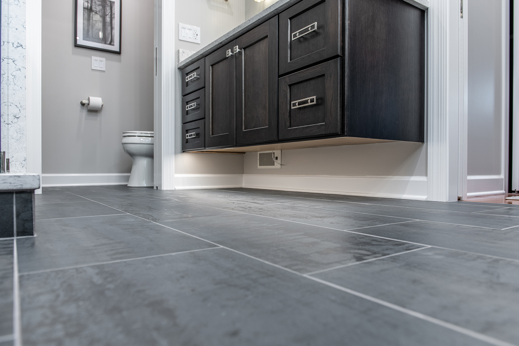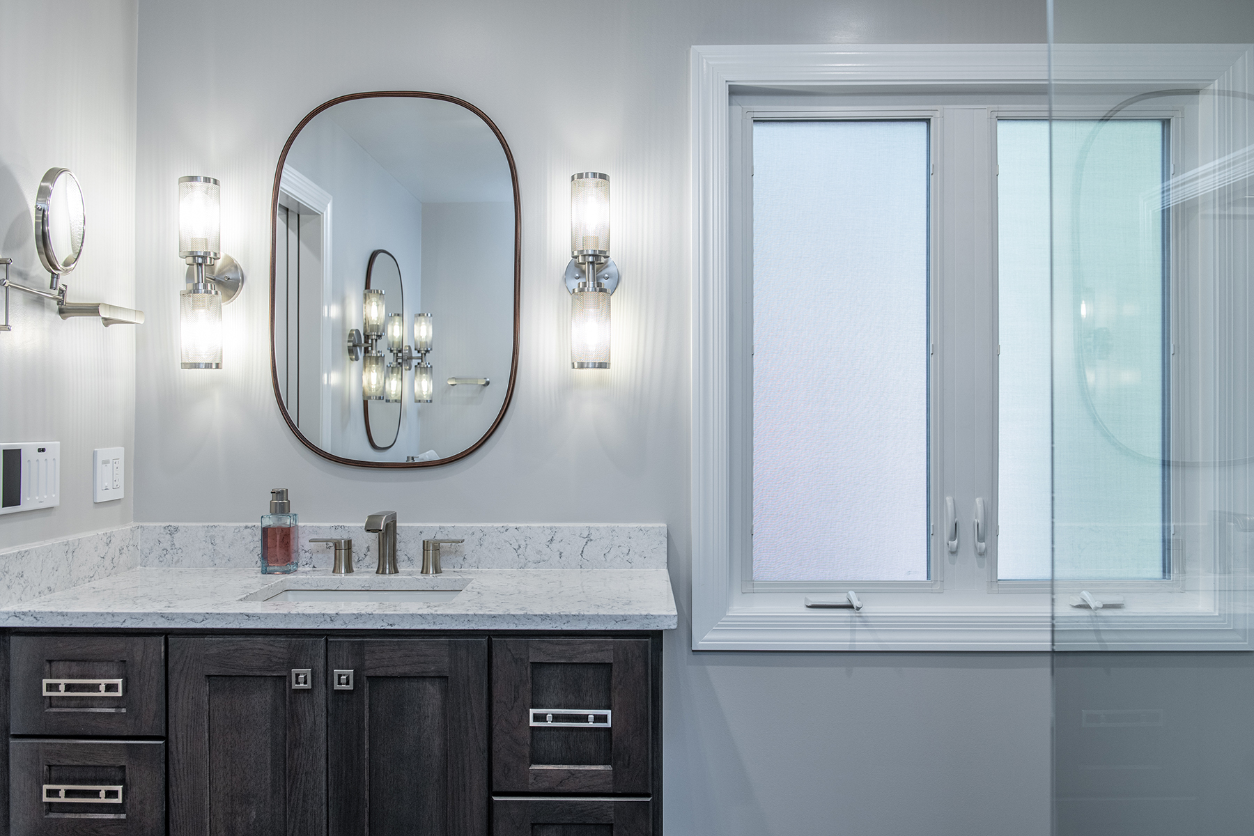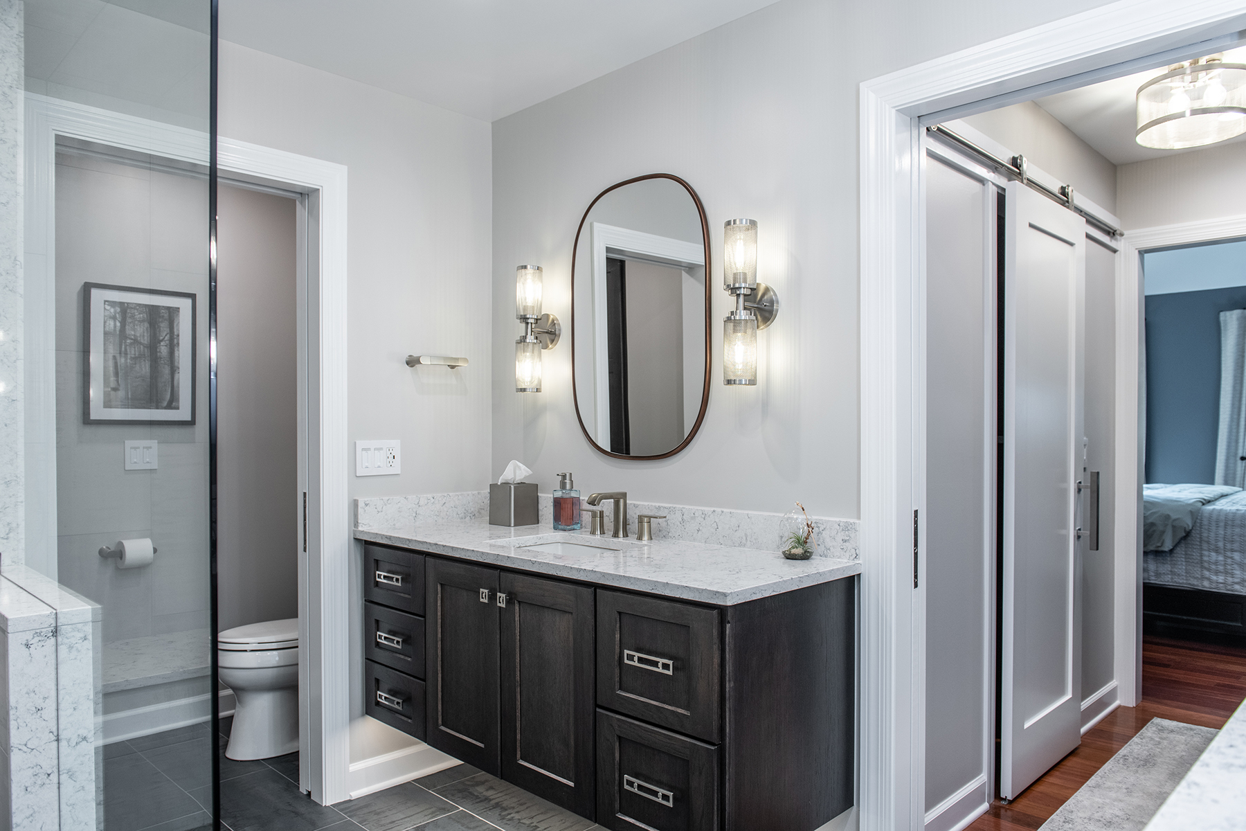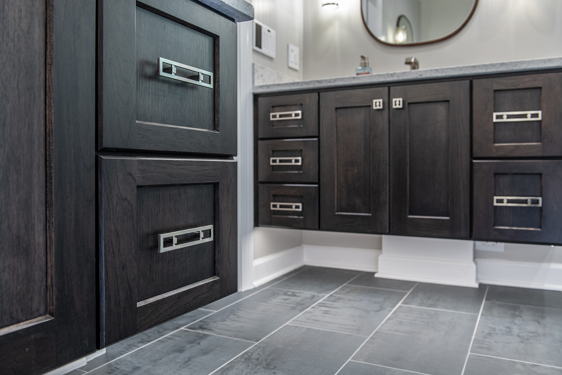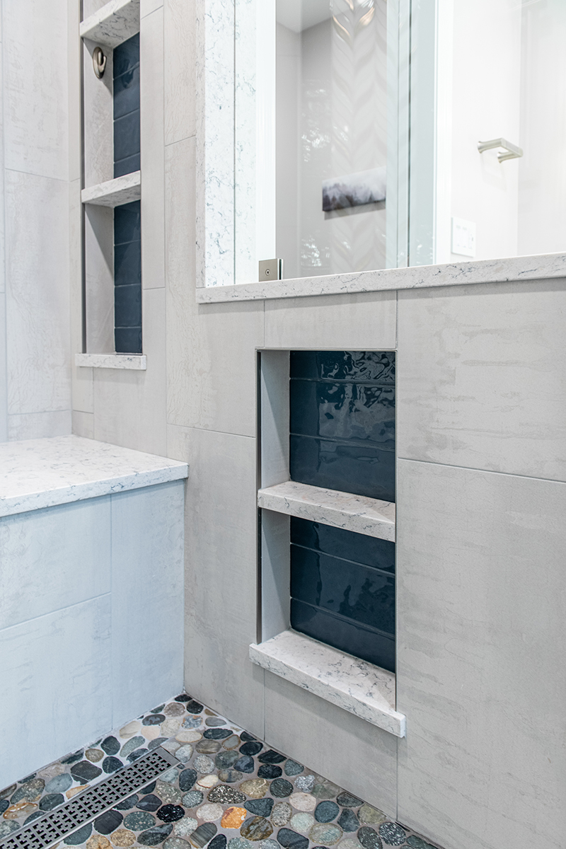 Our Grayslake primary remodel project represented the last space in the home to be renovated since the customer moved in over a decade ago. Our BDS team created a luxurious spa retreat in the bathroom with a custom designed closet that is a homeowner’s dream!. A dream space to get ready for the day was created with dual wall hung vanities complete with plenty of lighting not just above the counter but with night lighting underneath as well. This spa shower includes a completely customizable and voice controlled lighting and plumbing system with multiple spray fixtures. Our homeowners continued the show stopping design with heated floors, a towel warmer, and a speaker system that will make you never want to leave the bathroom again. A fully custom closet was designed to provide these homeowners with ample drawer space, racks, and cabinets for their clothes.