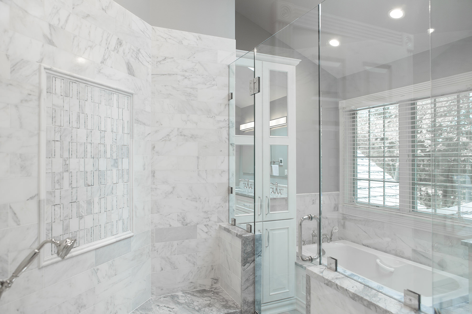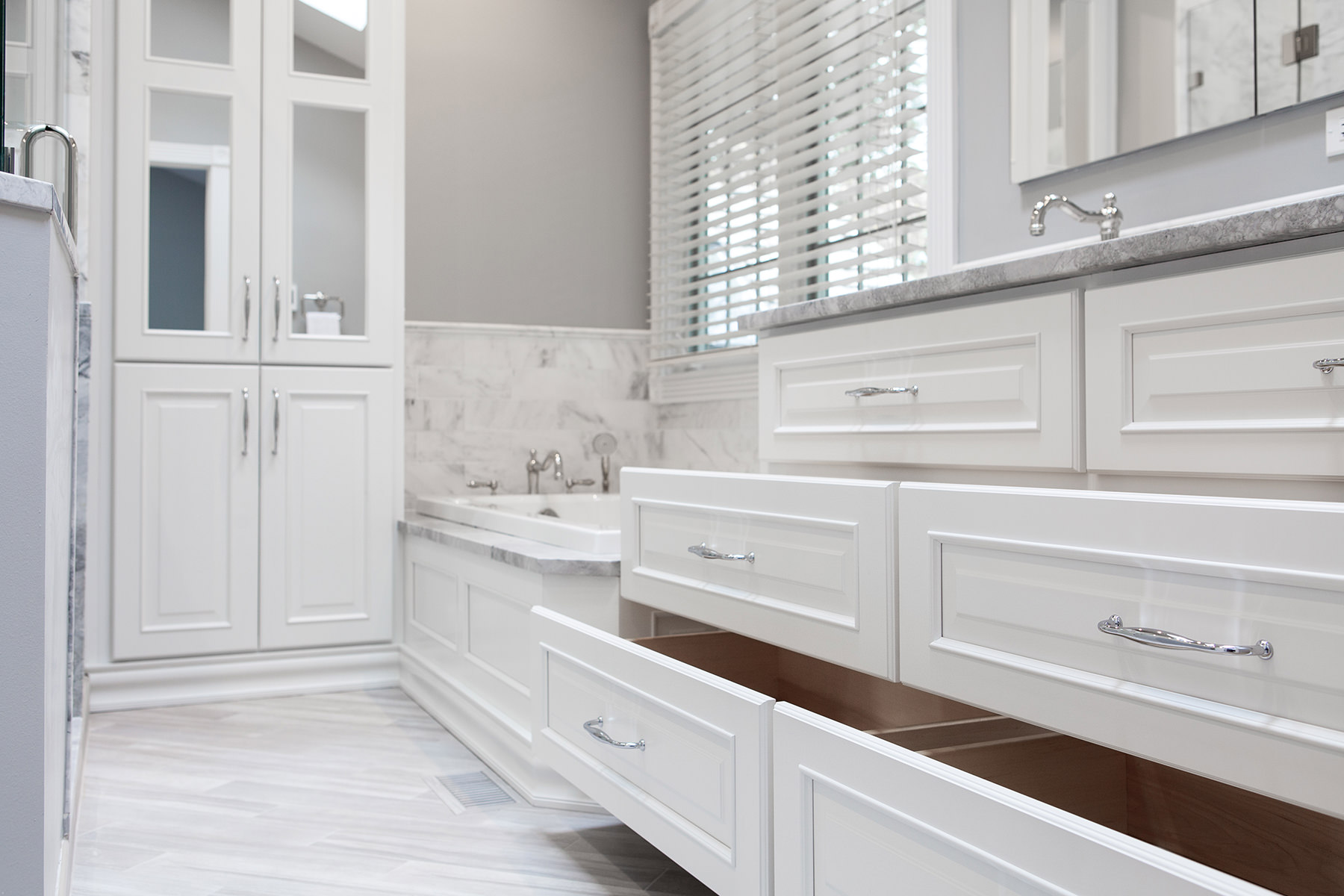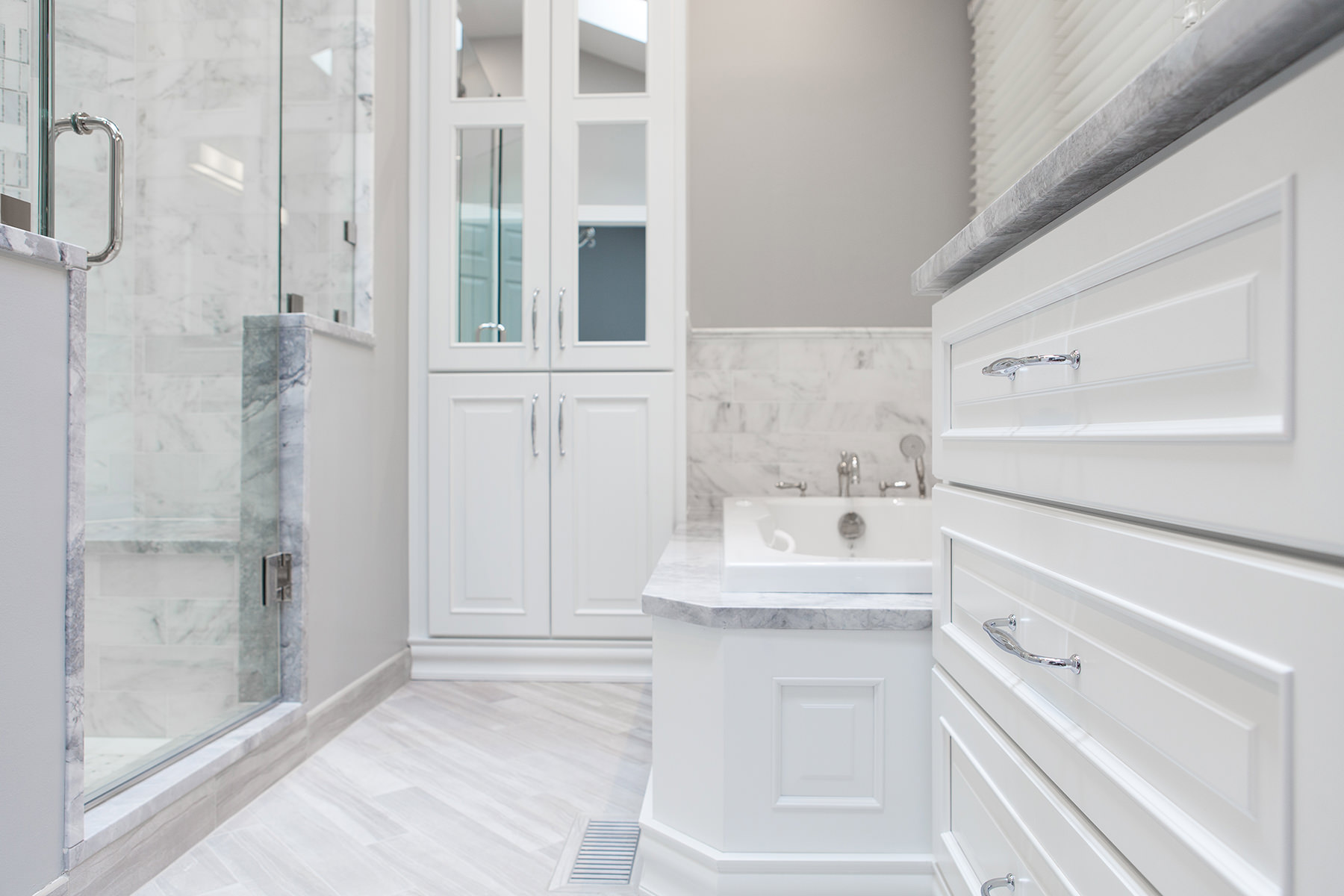 Over the course of 2 years and in 2 separate phases, our team at BDS had the pleasure of working on the Timber Creek Remodel in Libertyville. We were able to accomplish an extensive remodel of the primary bedroom suite, hall bath, and stairs, and then later took on the complete remodel of the kitchen, mudroom, and floors. Phase one of this project involved completely remodeling the primary bedroom suite as well as the hall bath and finishing with the stairs. Paint, new carpet, and a high end organization system allowed for a complete primary room transformation. Custom vanity, sleek quartzite countertops, and headed marble flooring are just a few features that allowed for this updated spa retreat. The hall bath was updated to match the style of the primary bath. We added a stained double vanity and white quartz countertops. To complete the first phase, our team replaced a worn out runner on the stairs with a fresh classic gray runner.