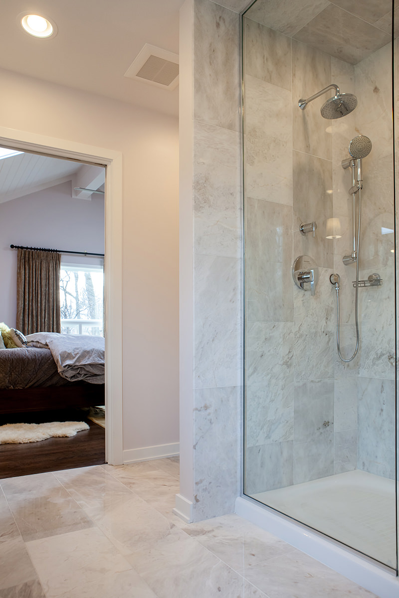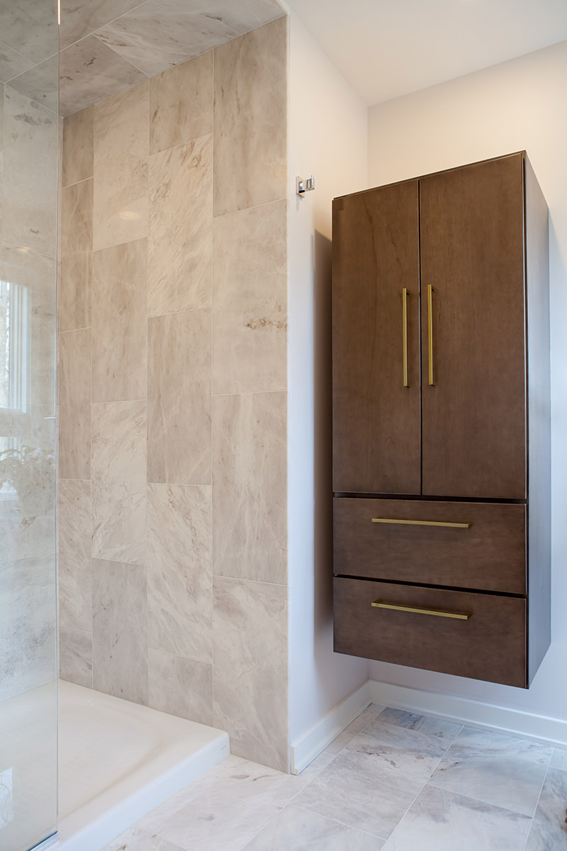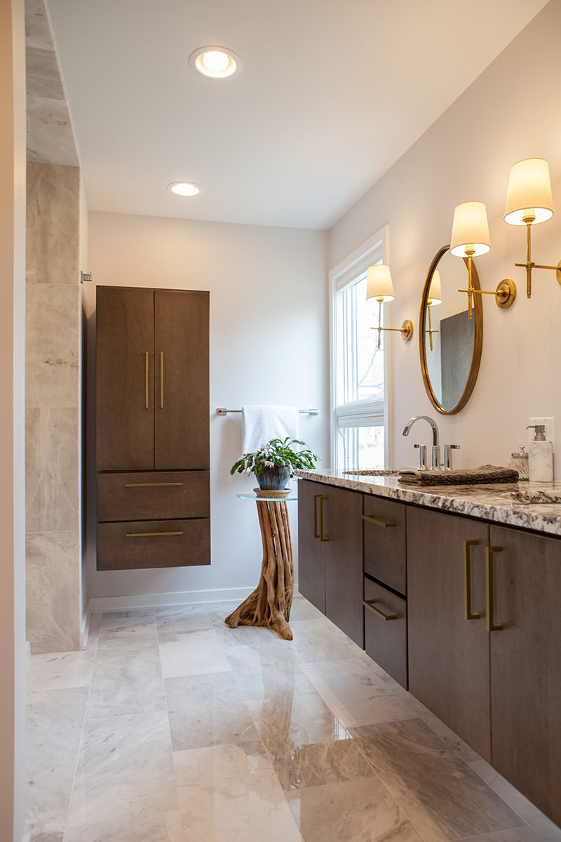 The BDS design for this remodel of the primary suite in Lake Bluff was coordinated to update the interior and exterior style of the home. The siding, paint, lighting and windows were all updated on the exterior. The primary suite and bathroom were remodeled with high end finishes and material. An open airy design flows from bedroom to bathroom. Rich warm wood cabinets provide warmth while the light paint and tile keeps the space feeling bright. This primary suite is a space that you long to come home and relax in at the end of the day.