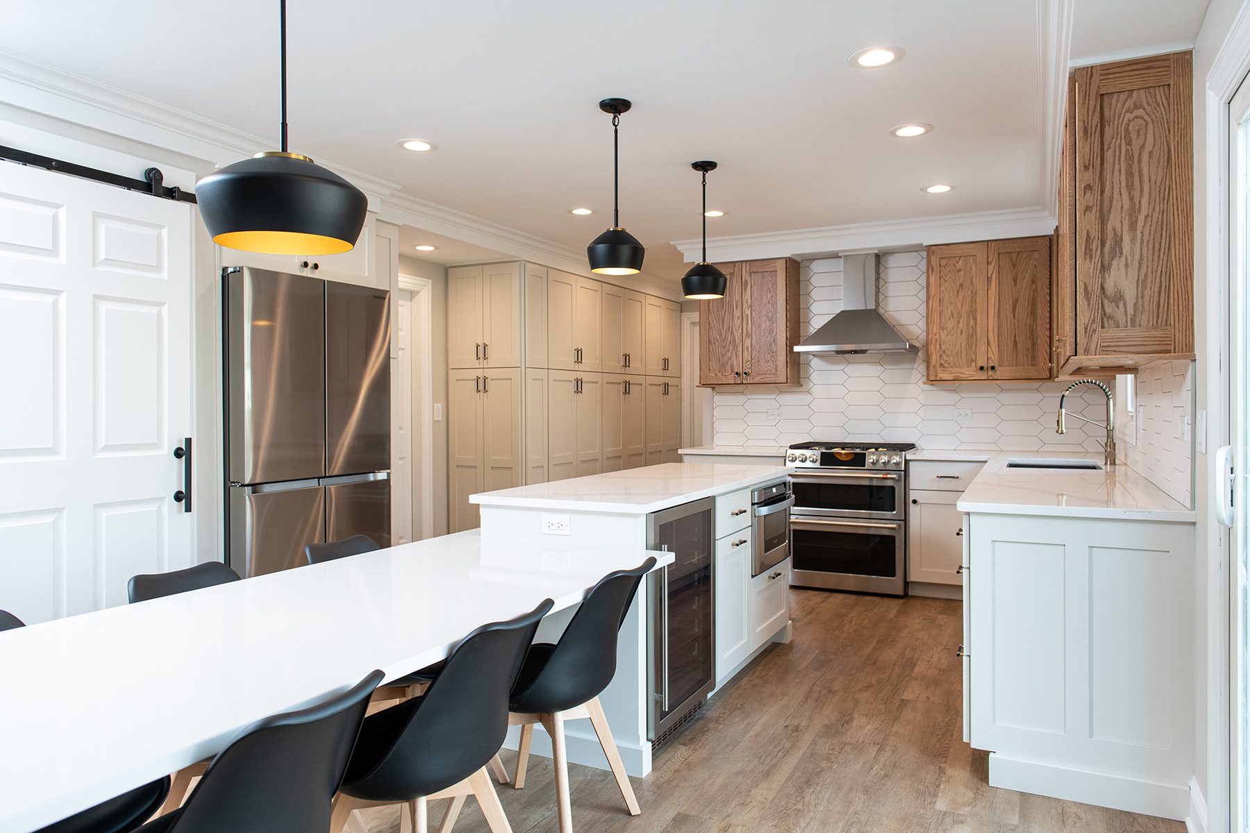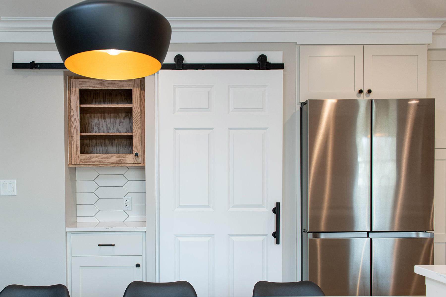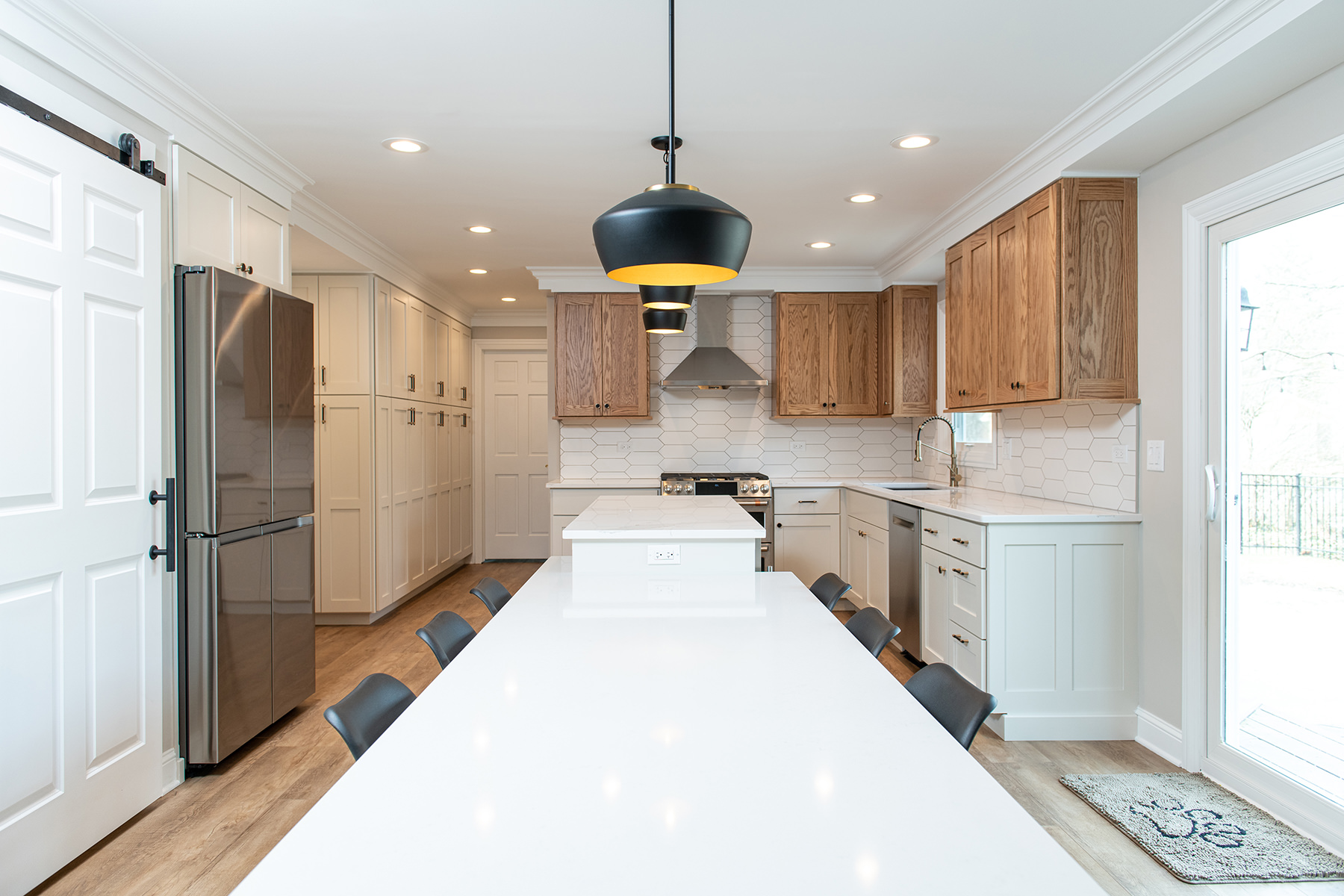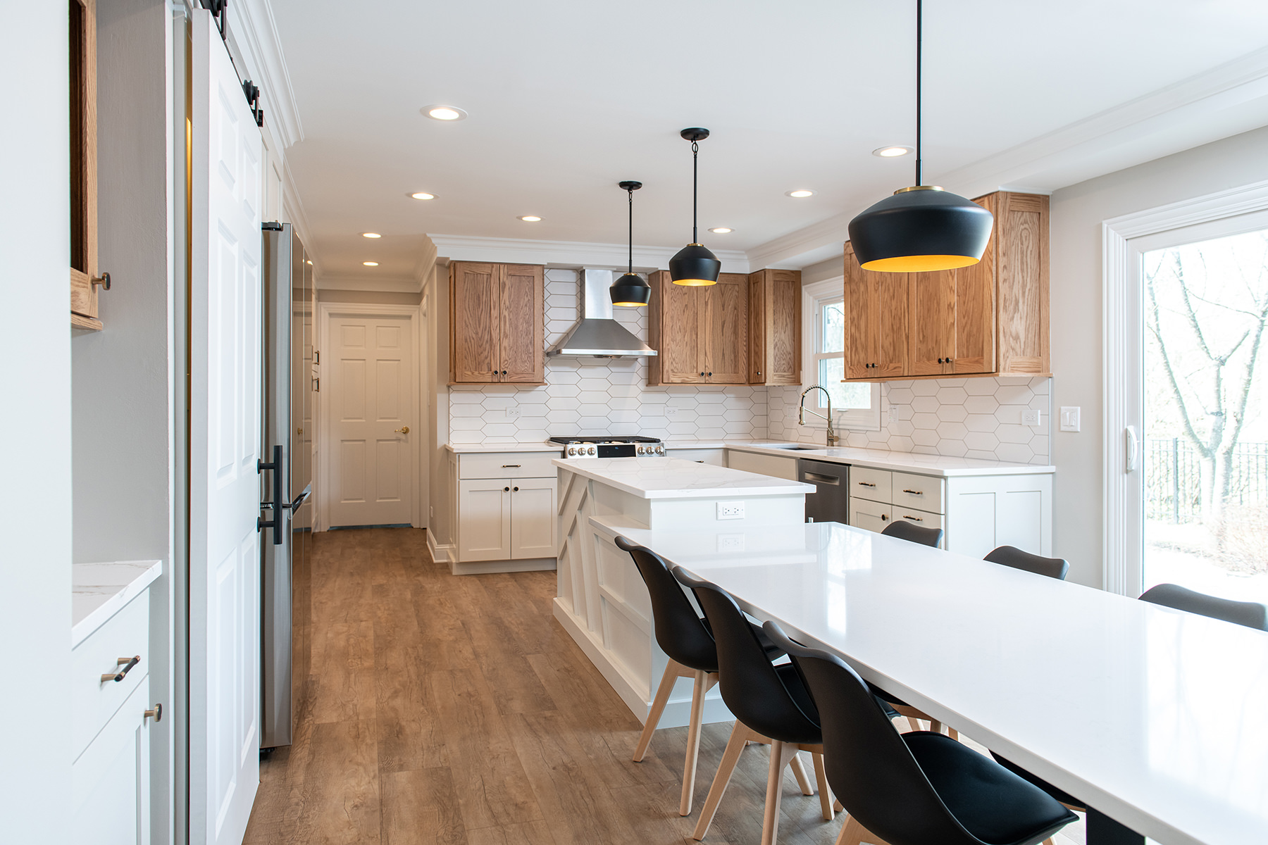 The kitchen in this Libertyville home was designed for a busy blended family that loves to entertain and spend time together. The outdated kitchen layout was hindering their ability to do so. The BDS Team tackled the first floor and updated it with new flooring that was durable enough to withstand the activity of an active family and pets. To improve the functionality of the home, the door to the garage was relocated to make room for a large mudroom and an increase in storage cabinets. Additionally, the basement door was converted to a barn door to eliminate the conflict with circulation on the door swing. The most significant change, however, was the development of a large great room that was tied to a signature island. This room became the centerpiece of the home, providing ample space for meal preparation and seating for the whole family. The island was a two-level stretch of countertop, perfect for meal prep and for the kids to do their homework. This area featured wood uppers and painted bottoms with a clean quartz top. The hallway leading to the bathroom and back bedroom was lined with ample storage cabinets and pantry space, making it easy to keep everything organized and within reach.