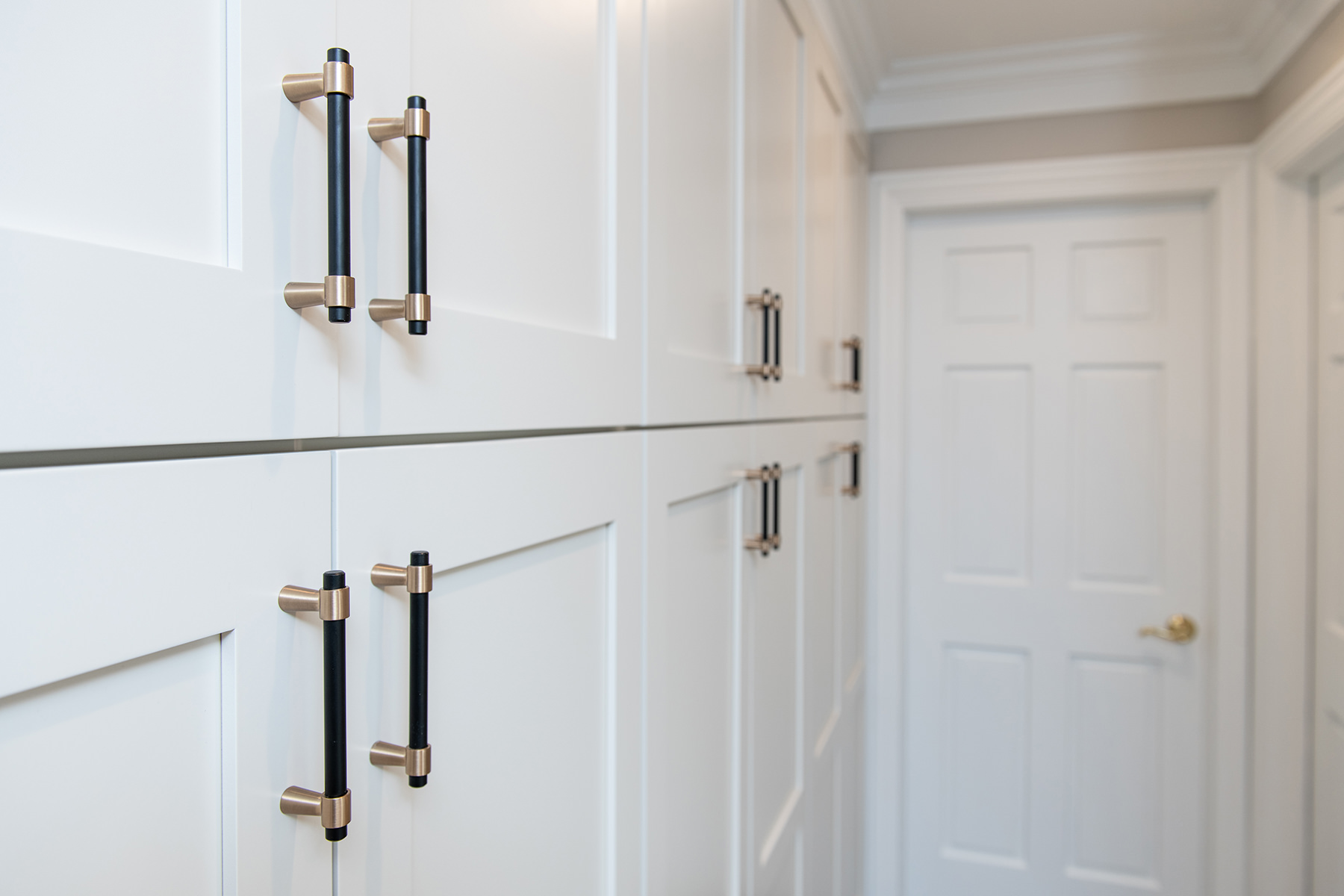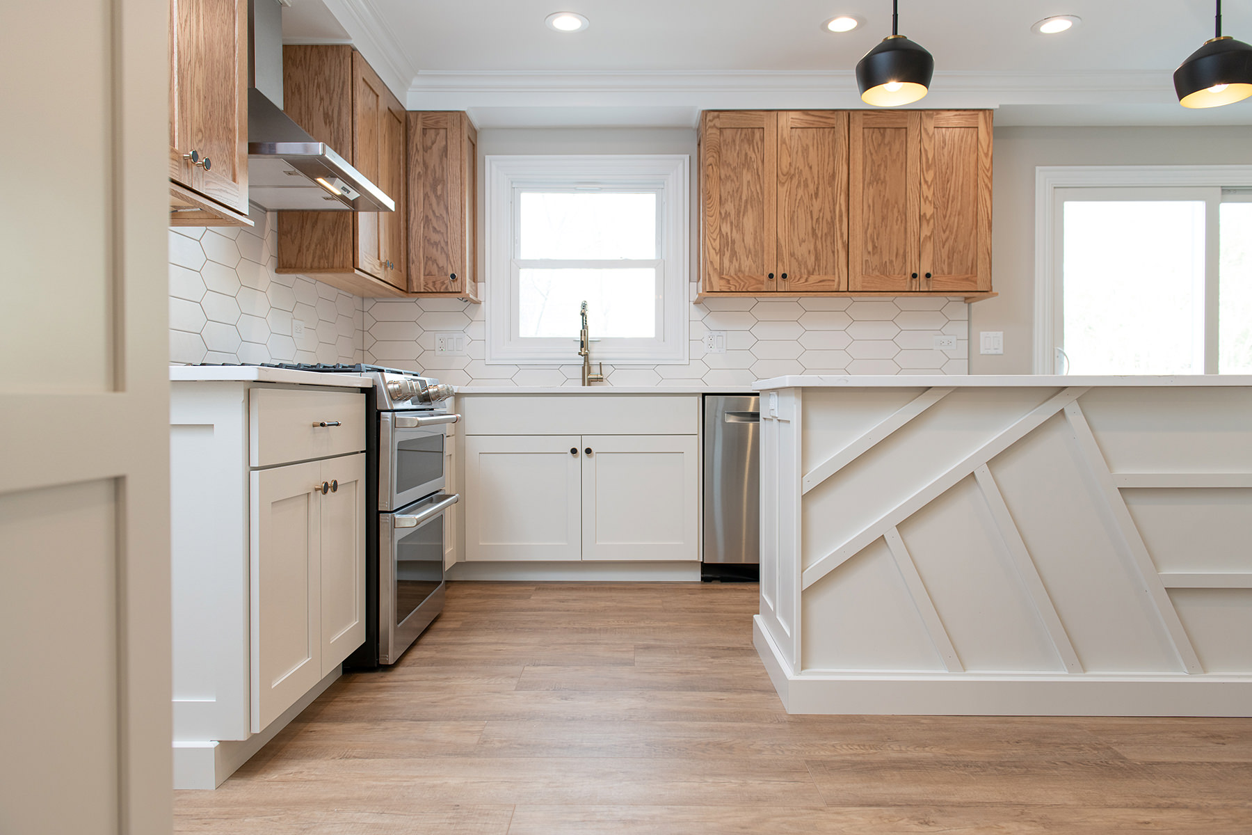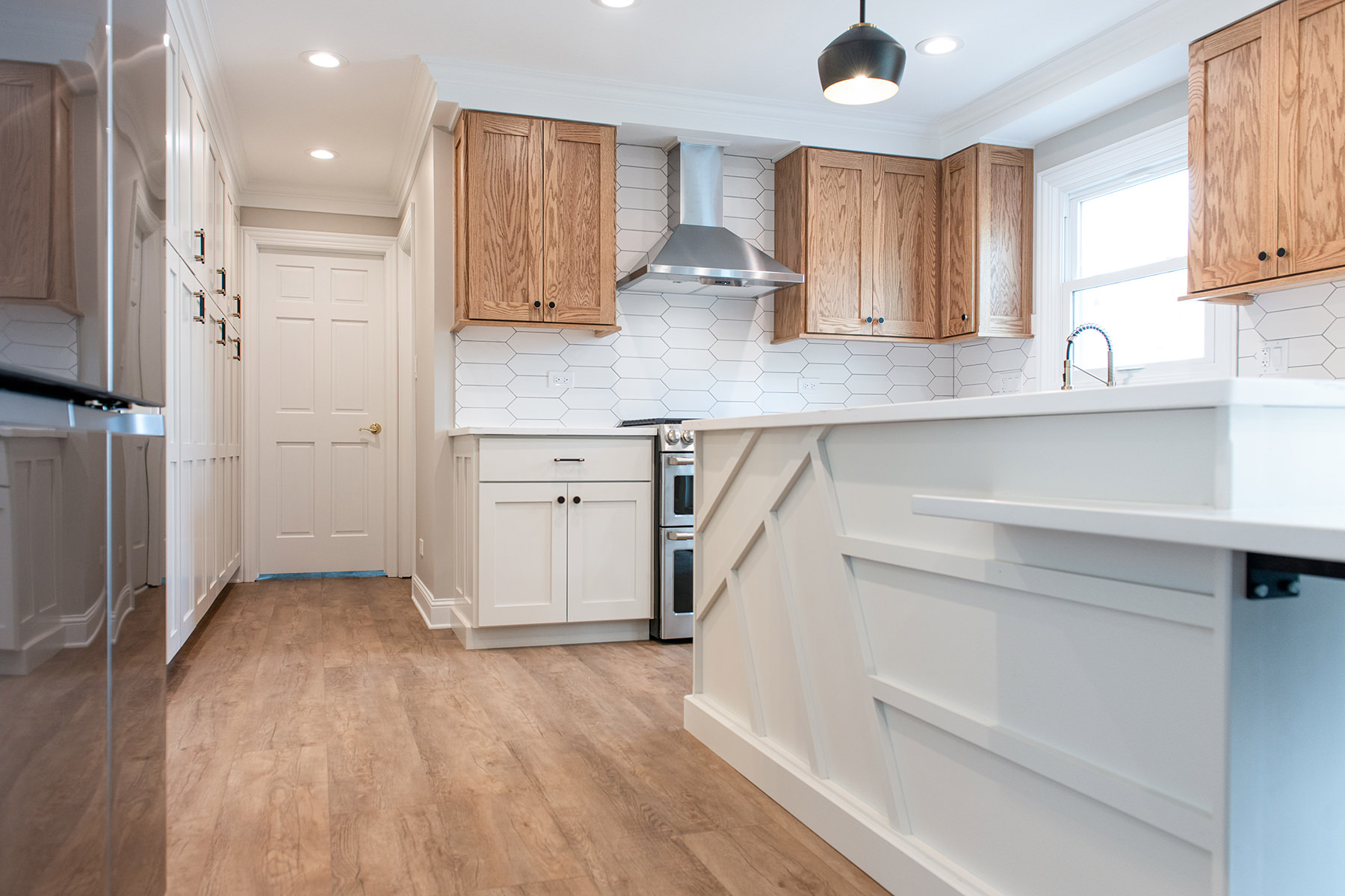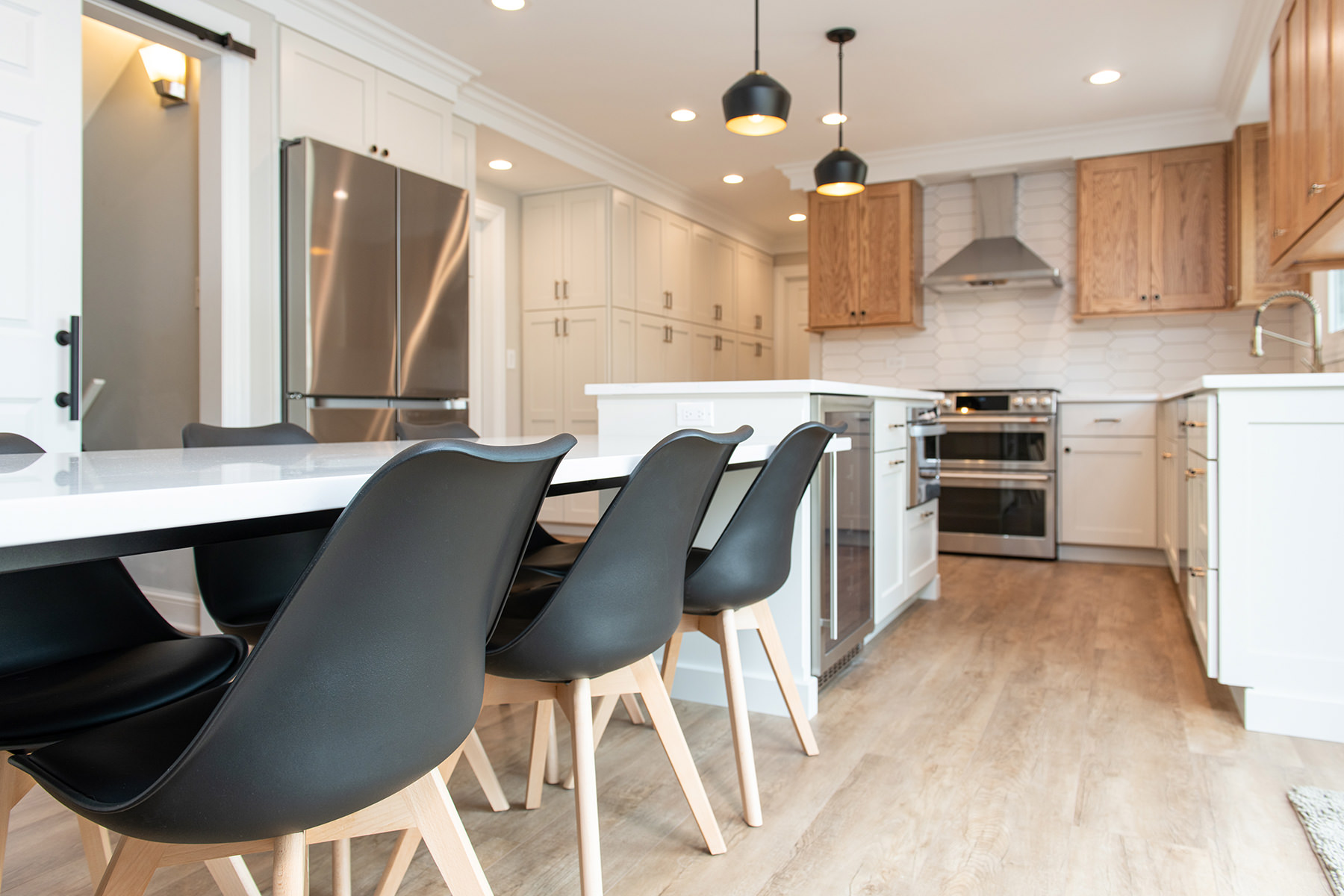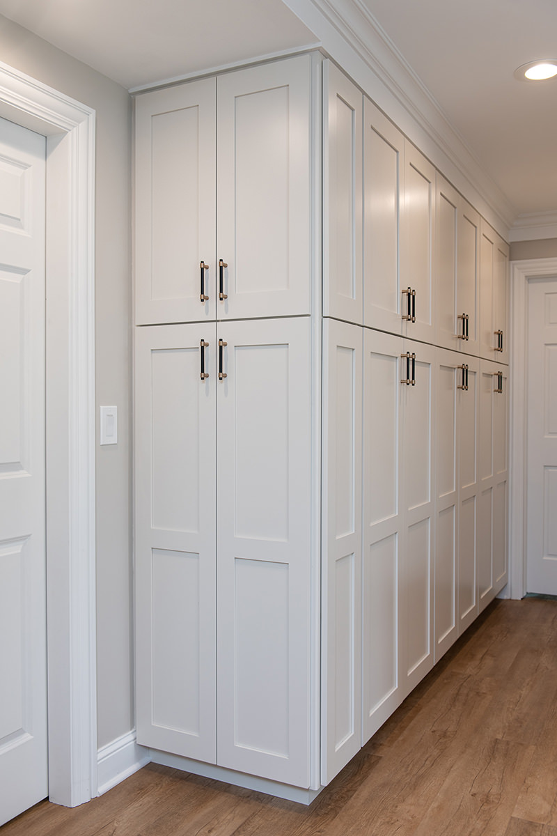 The kitchen in this Libertyville home was designed for a busy blended family that loves to entertain and spend time together. The outdated kitchen layout was hindering their ability to do so. The BDS Team tackled the first floor and updated it with new flooring that was durable enough to withstand the activity of an active family and pets. To improve the functionality of the home, the door to the garage was relocated to make room for a large mudroom and an increase in storage cabinets. Additionally, the basement door was converted to a barn door to eliminate the conflict with circulation on the door swing. The most significant change, however, was the development of a large great room that was tied to a signature island. This room became the centerpiece of the home, providing ample space for meal preparation and seating for the whole family. The island was a two-level stretch of countertop, perfect for meal prep and for the kids to do their homework. This area featured wood uppers and painted bottoms with a clean quartz top. The hallway leading to the bathroom and back bedroom was lined with ample storage cabinets and pantry space, making it easy to keep everything organized and within reach.